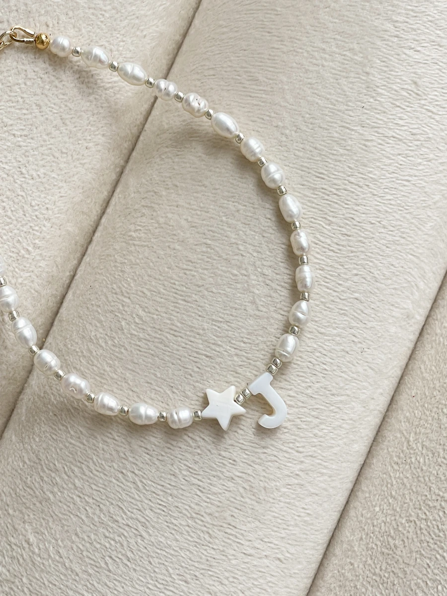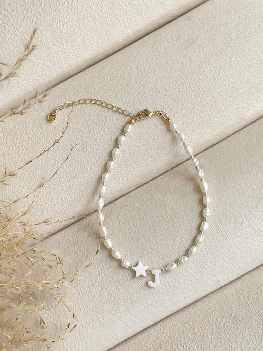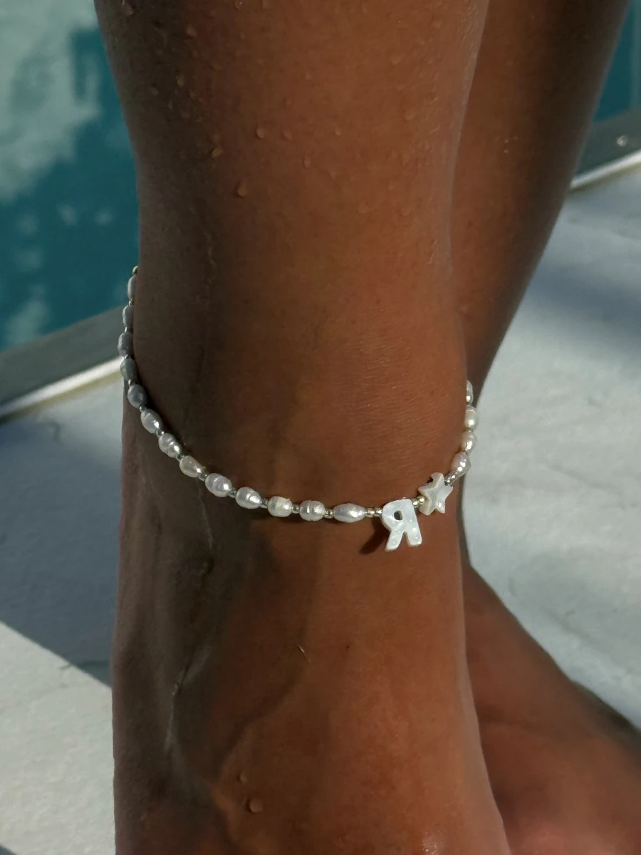 Цей елегантний браслет на ногу поєднує в собі витонченість перлів та індивідуальність перламутрової букви. Кожна буква в алфавітному порядку додає особливого шику, і ви можете вибрати свою ініціалу або важливу літеру для вас чи вашої близької людини.
