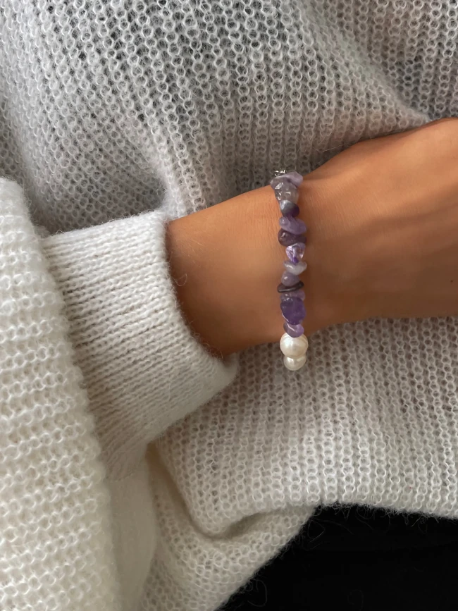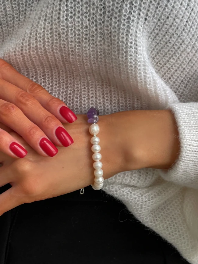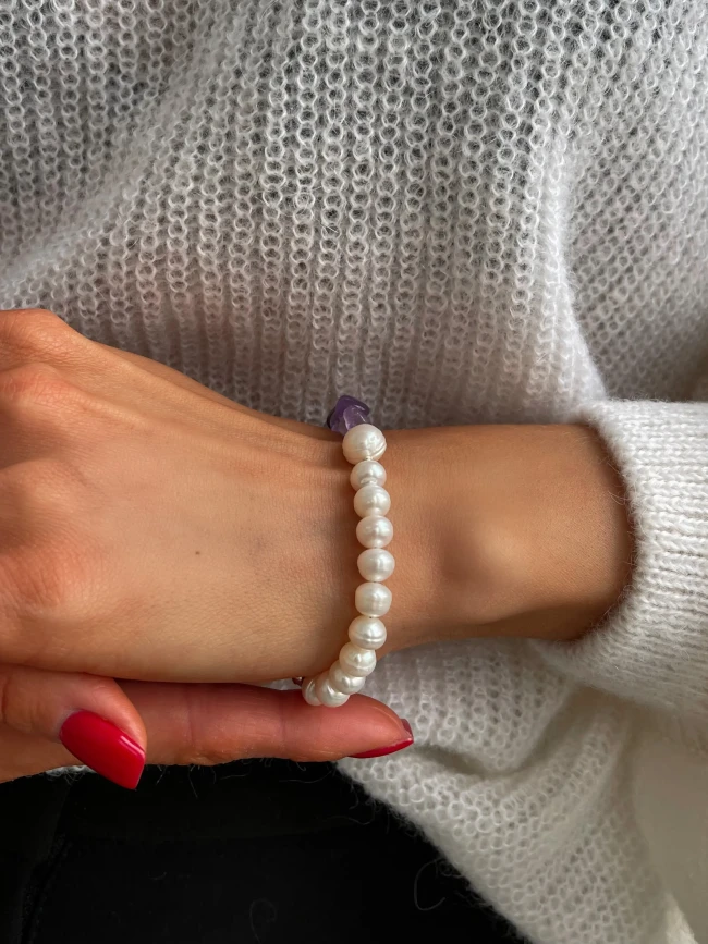 Браслет виготовлений зі справжнього натурального аметисту та найкращих перлів, які надають йому розкішний і яскравий вигляд.