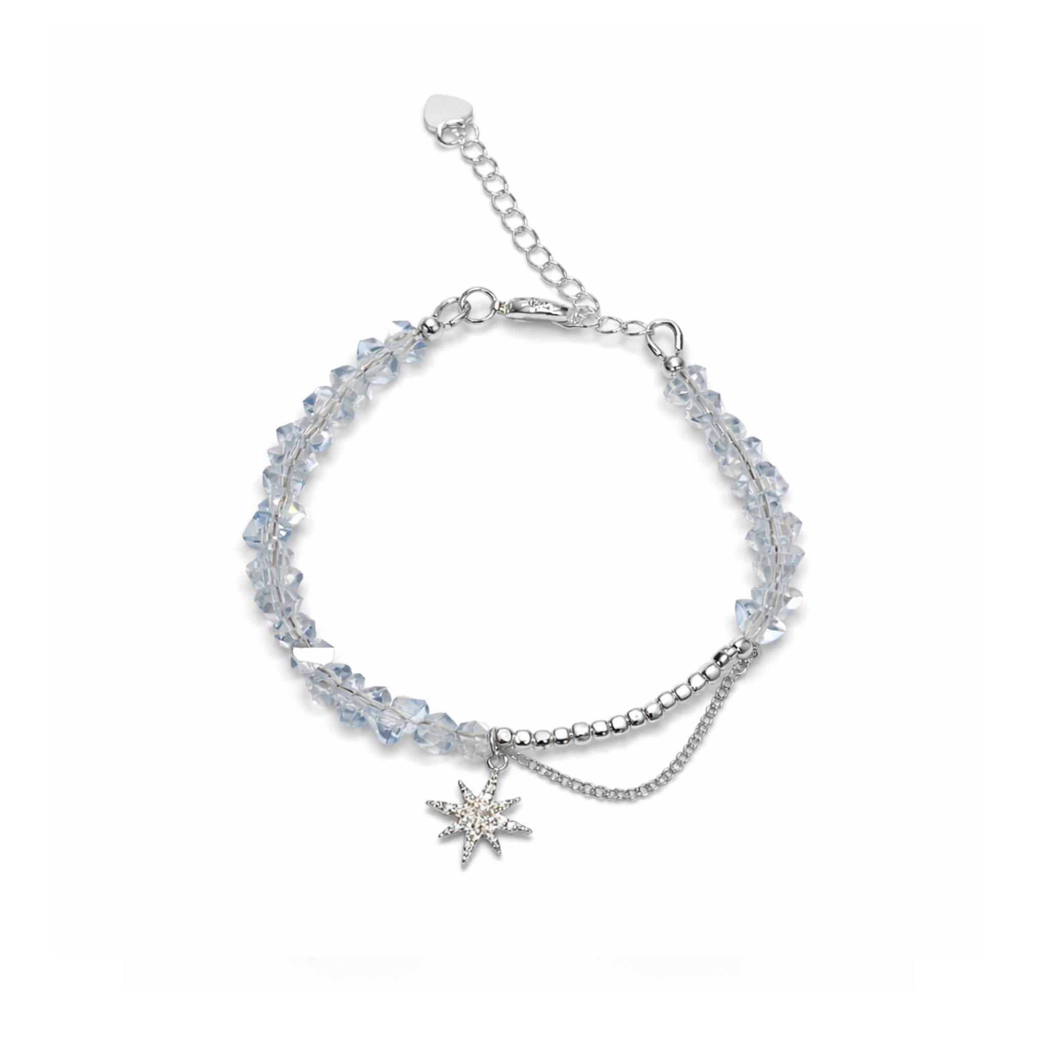 Його ніжний блакитний відтінок, що нагадує небесну безодню, в поєднанні з блискучими срібними зірками створює ефект незабутнього сяйва. Виготовлений з високоякісного кришталевого скла, браслет має чудову прозорість і яскравість. Ідеально підходить для вечірніх заходів або як стильний акцент в повсякденному вбранні.