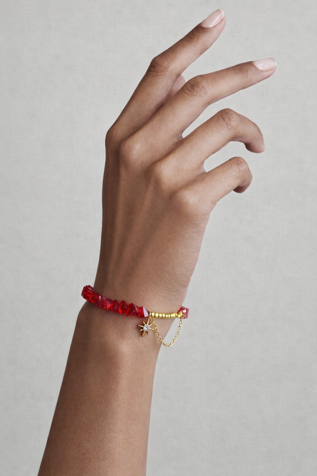 Яскравий браслет «Червоні Зірки» — це акцентна прикраса для сміливих і чуттєвих образів. Фактурні елементи з червоного ювелірного скла символізують енергію, пристрасть і внутрішню силу. Каміння гармонійно поєднується з гематитом та сяйливими фіанітами, які додають браслету глибини та благородного блиску.