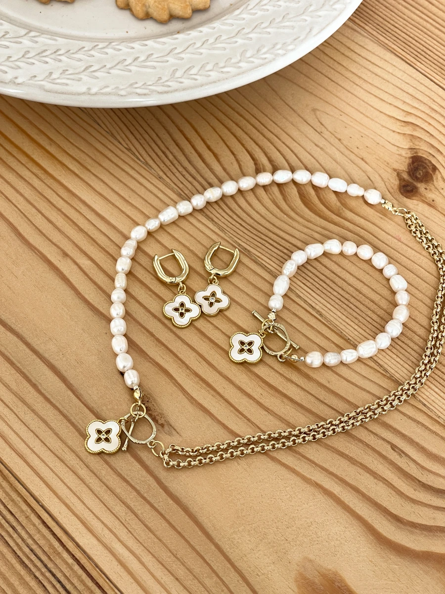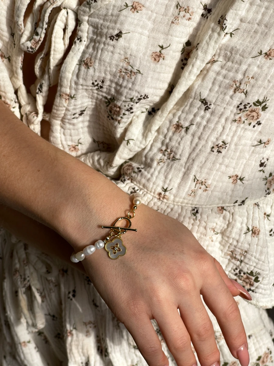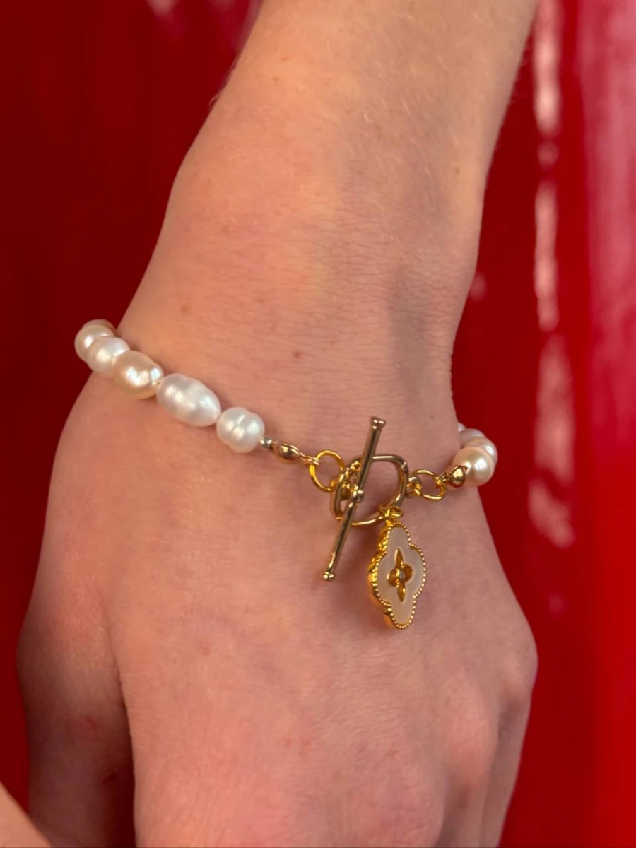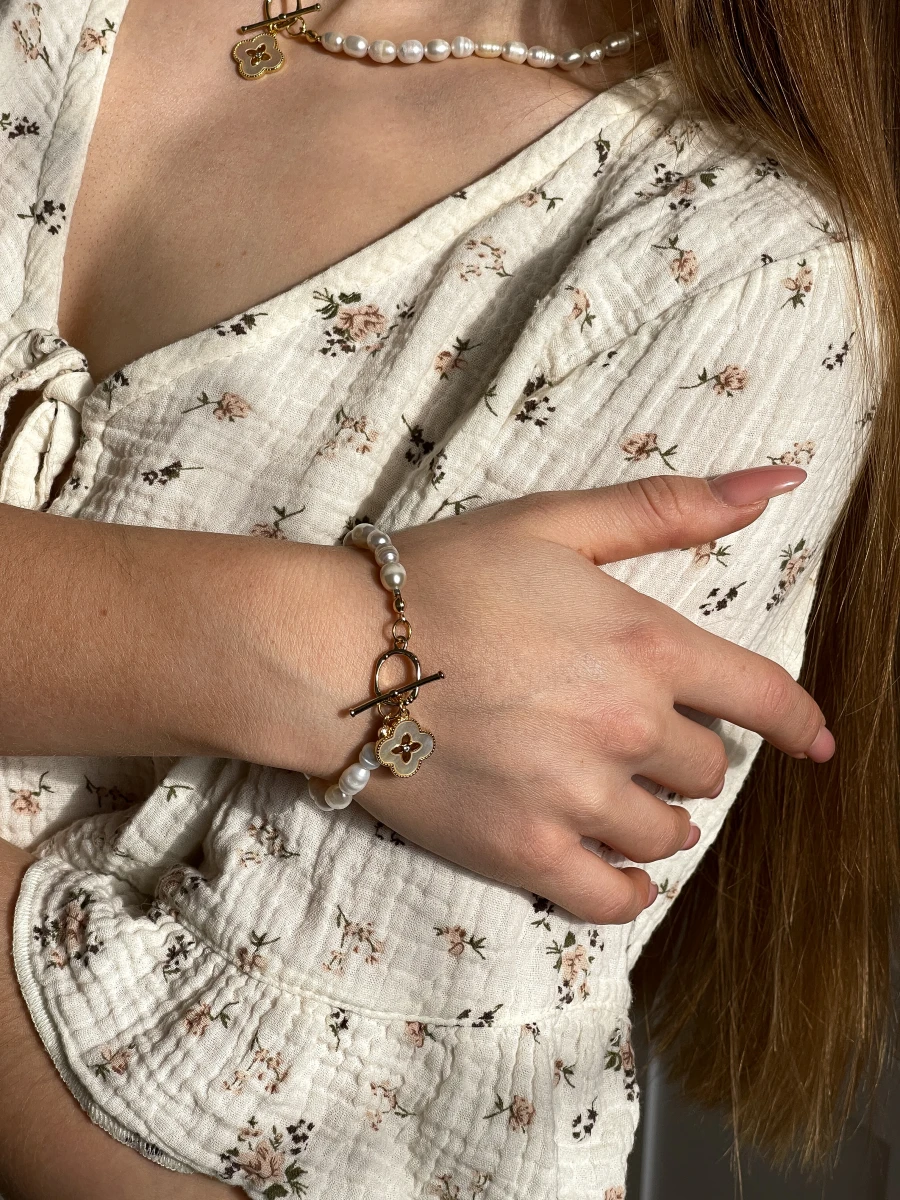 Браслет "Clover Chain" – вишуканий аксесуар, що поєднує елегантність і витонченість. Виготовлений із міцного медсплаву з позолоченим покриттям, доповнений перлами та перламутровими вставками. Застібка тогл забезпечує зручне носіння. Ідеальний вибір для тих, хто цінує стиль і якість.