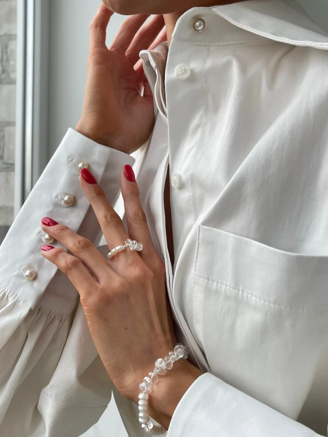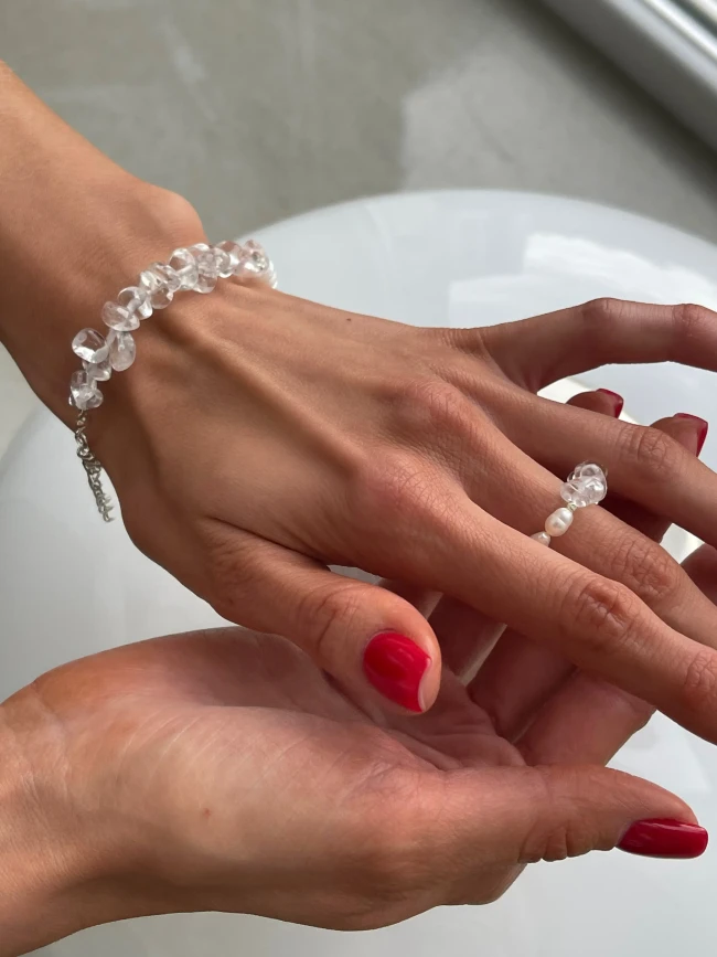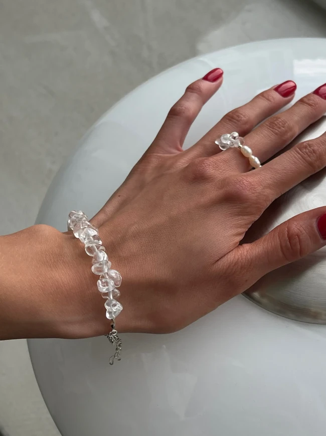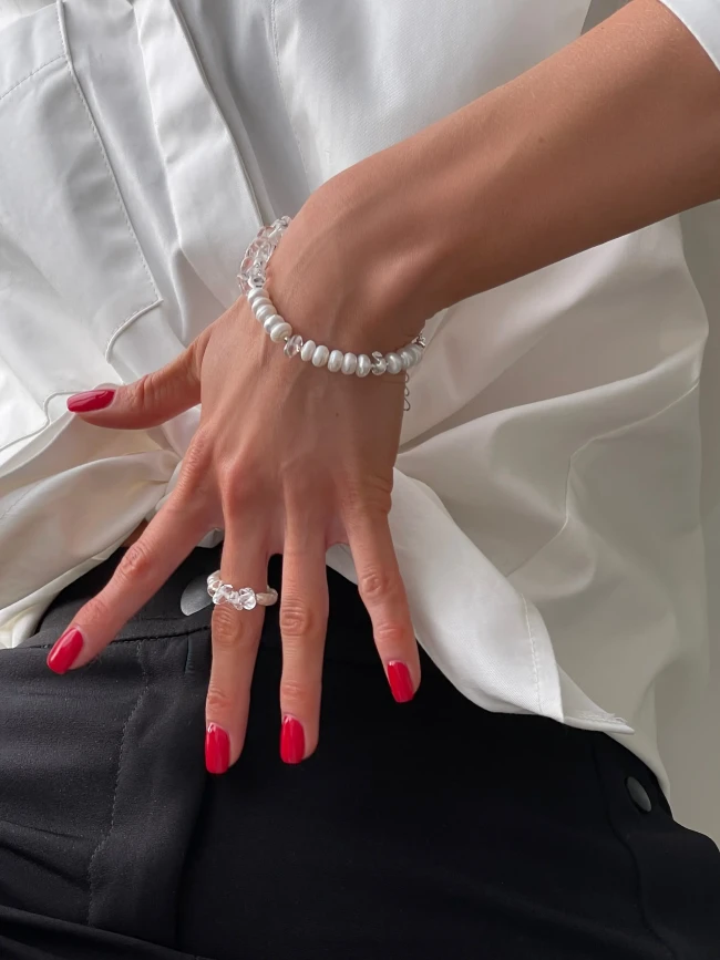 Цей браслет із натурального кришталю та високоякісних перлів виражає розкіш і елегантність. Він підкреслить вашу жіночність та надасть вам особливого сяйва. Кришталеві намистини цього браслета вражають своєю бездоганною якістю та чистотою.