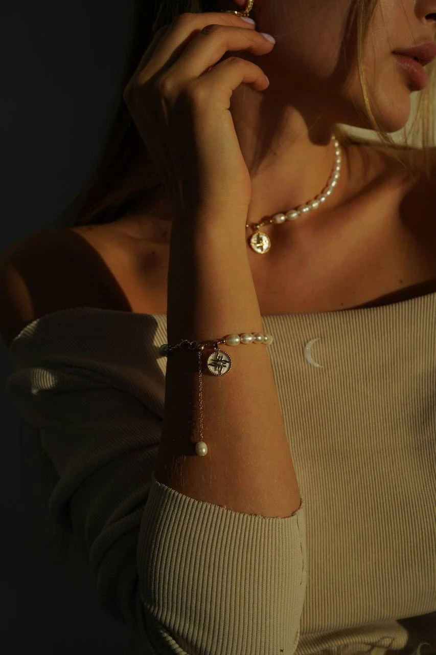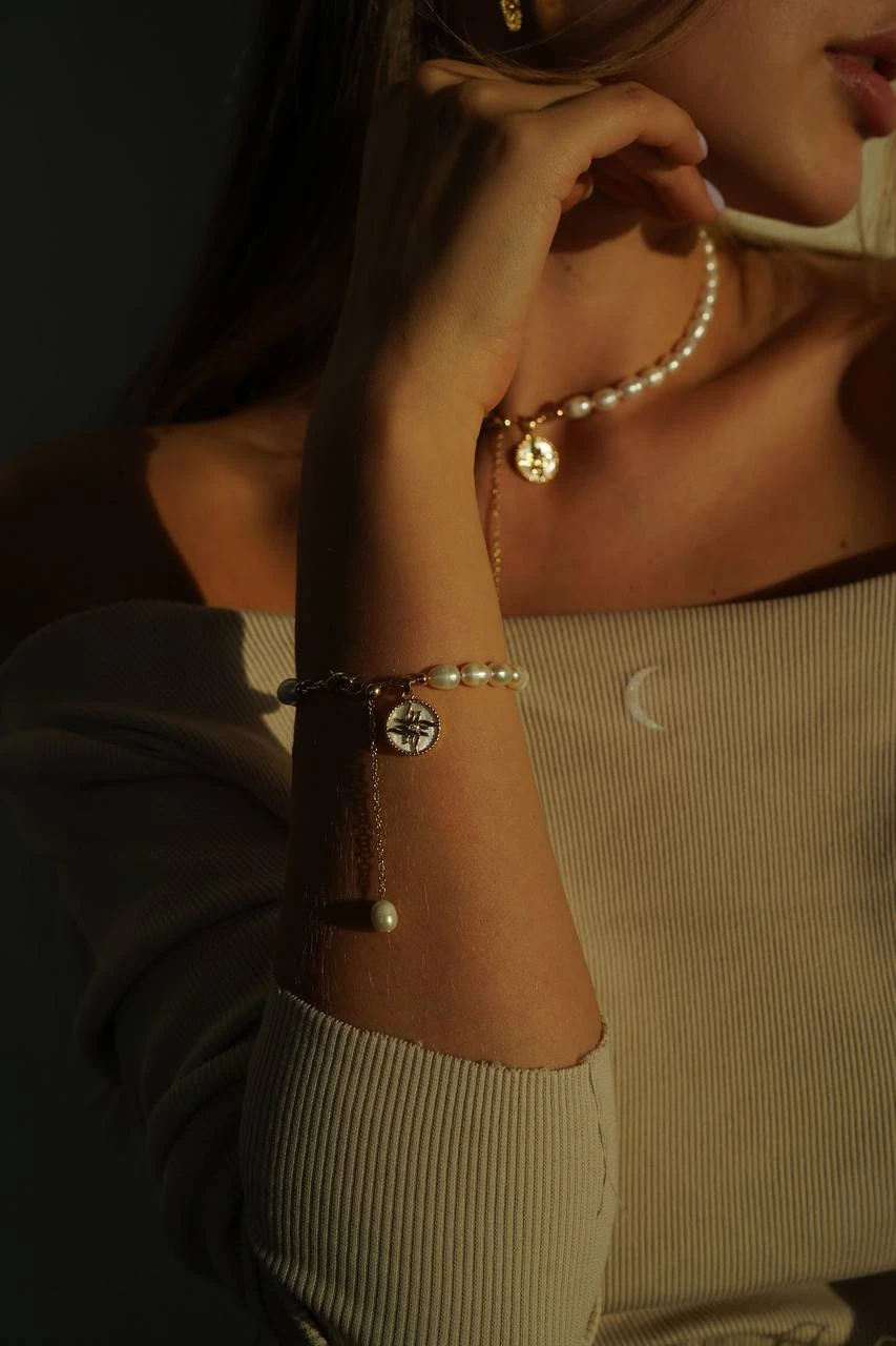 Розкішний браслет, який зачарує своєю вишуканістю. Створений з благородних матеріалів: Високоякісних перлів, які ніжно переливаються всіма відтінками світла, та благородної позолоти, що додає виробу особливого шарму. Довершує композицію елегантний перламутр, який надає браслету глибини та витонченості. Цей виріб стане незамінним аксесуаром для особливих випадків і підкреслить ваш вишуканий смак.