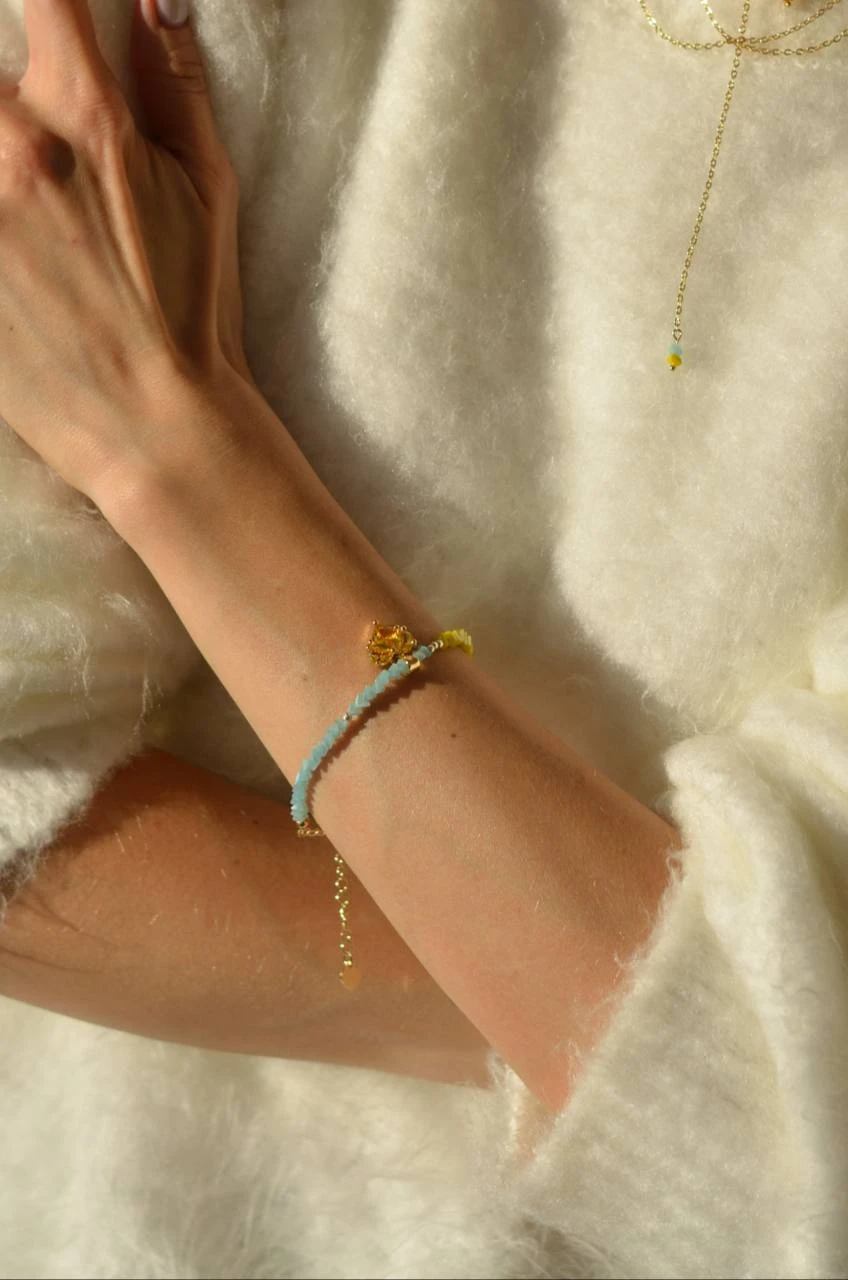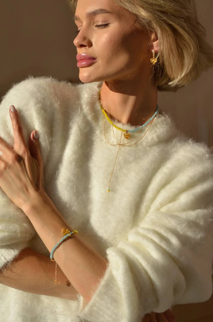 Браслет "Love Ukraine" — стильний аксесуар, який символізує любов та підтримку для України. Виконаний з медсплаву, покритий позолотою та доповнений ювелірним склом, цей браслет поєднує елегантність і глибокий зміст.