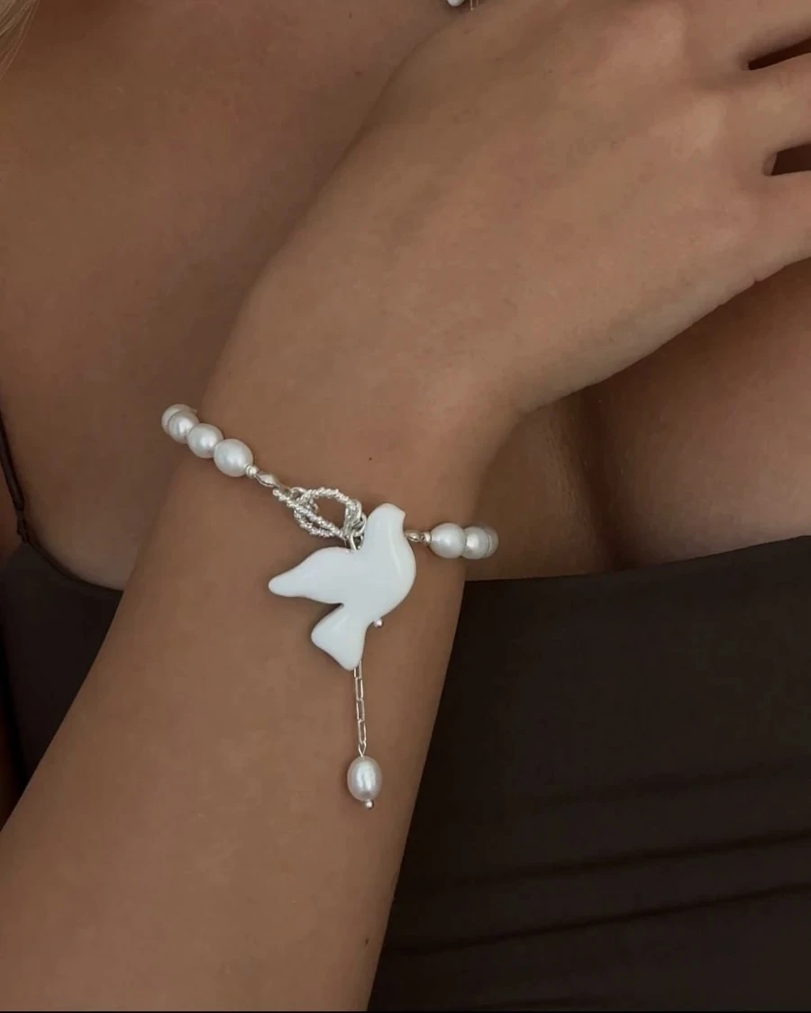 Поєднання сучасних трендів і природної краси – ось що робить цей браслет особливим. Фігурка горлиці з полімерної глини, виглядає дуже стильно і оригінально. високоякісні перлини додають нотку розкоші і підкреслюють індивідуальність вашого образу. Цей браслет стане яскравим акцентом у вашому гардеробі і підійде як для повсякденного носіння, так і для особливих випадків