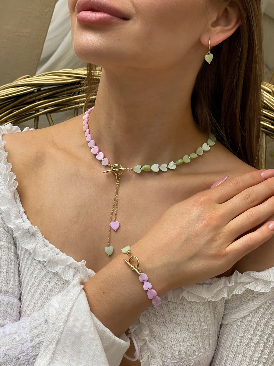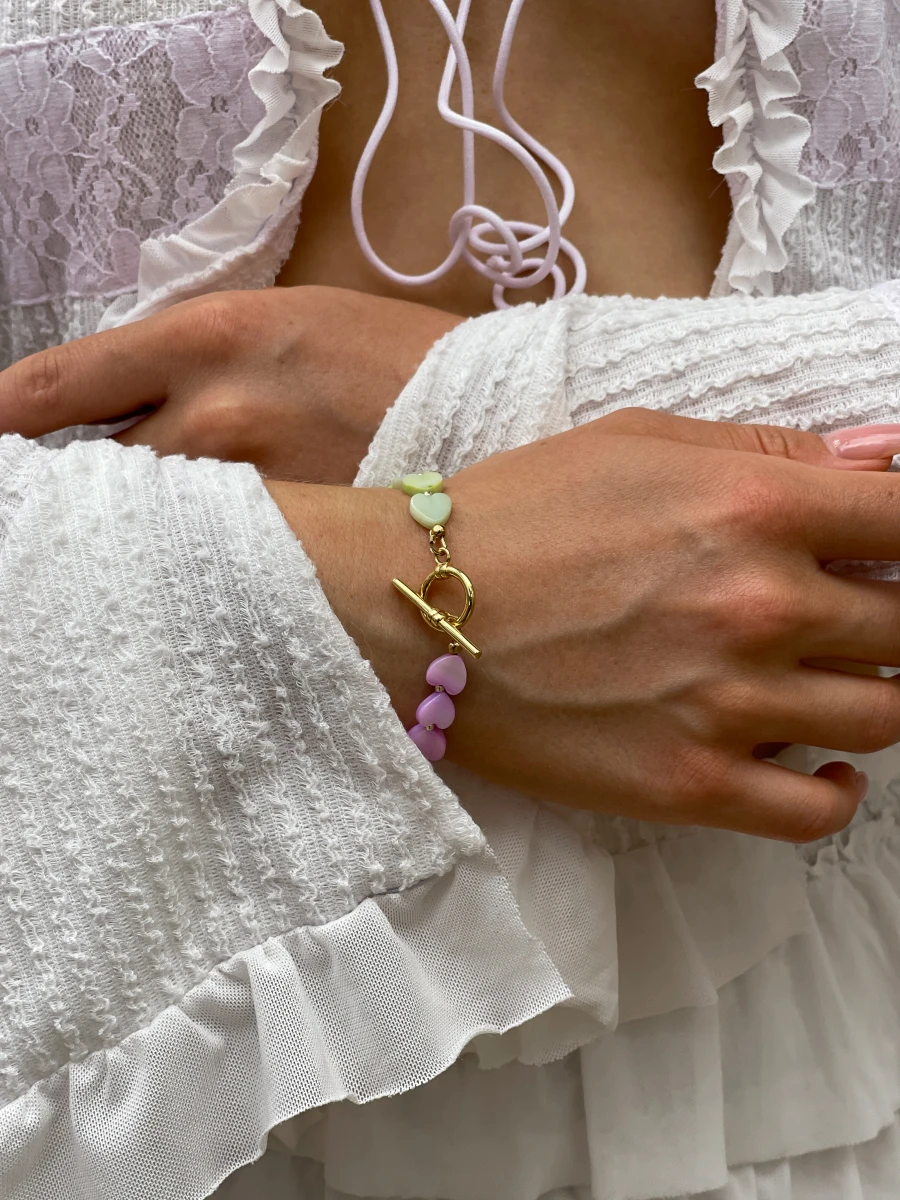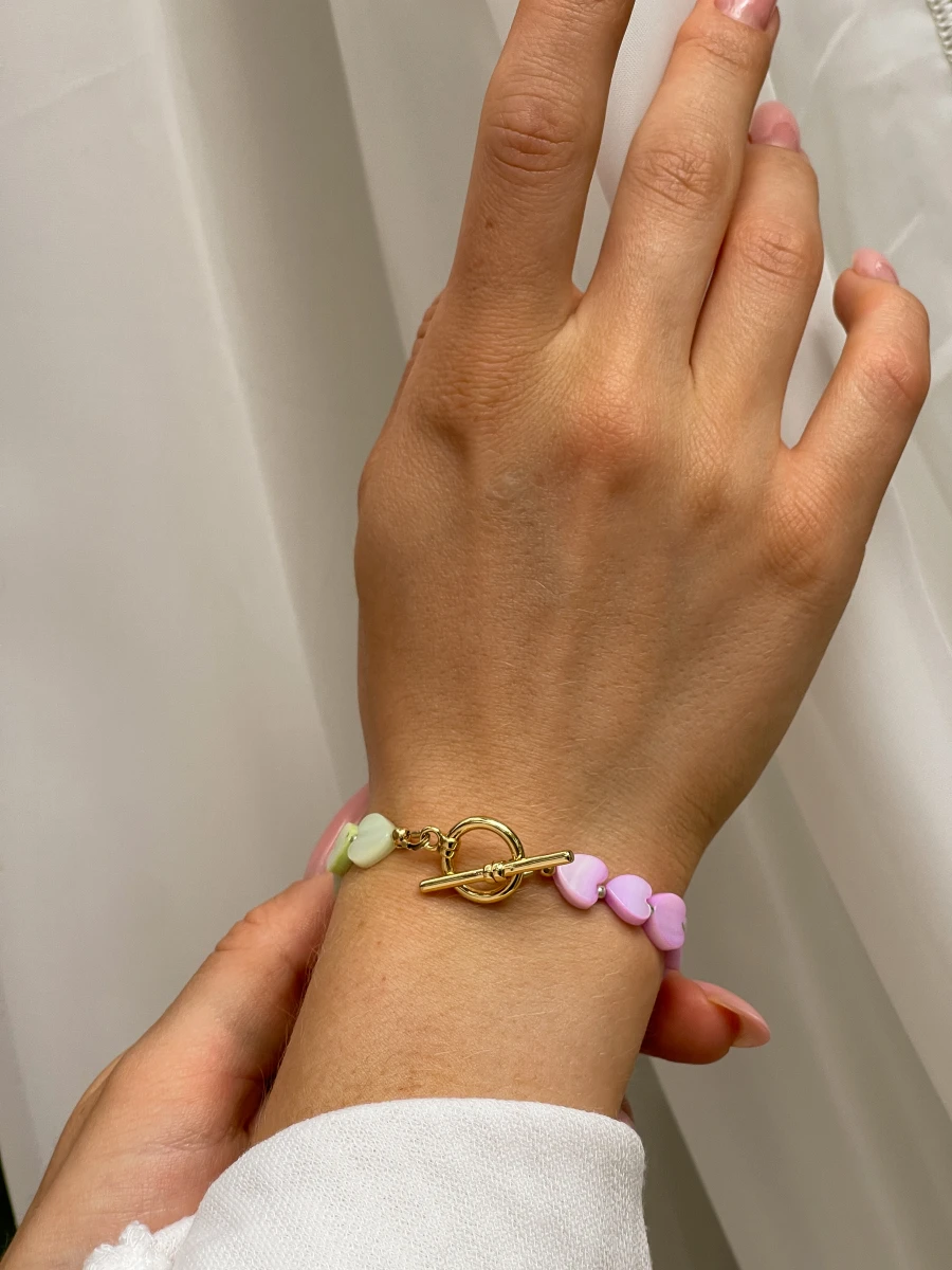 Ніжний браслет із перламутровими серцями, що гармонійно поєднуються з елементами з медсплаву та позолоченим покриттям. Стильна тогл-застібка додає вишуканості, а лаконічний дизайн без подовжувача створює ідеальну посадку на зап’ясті.