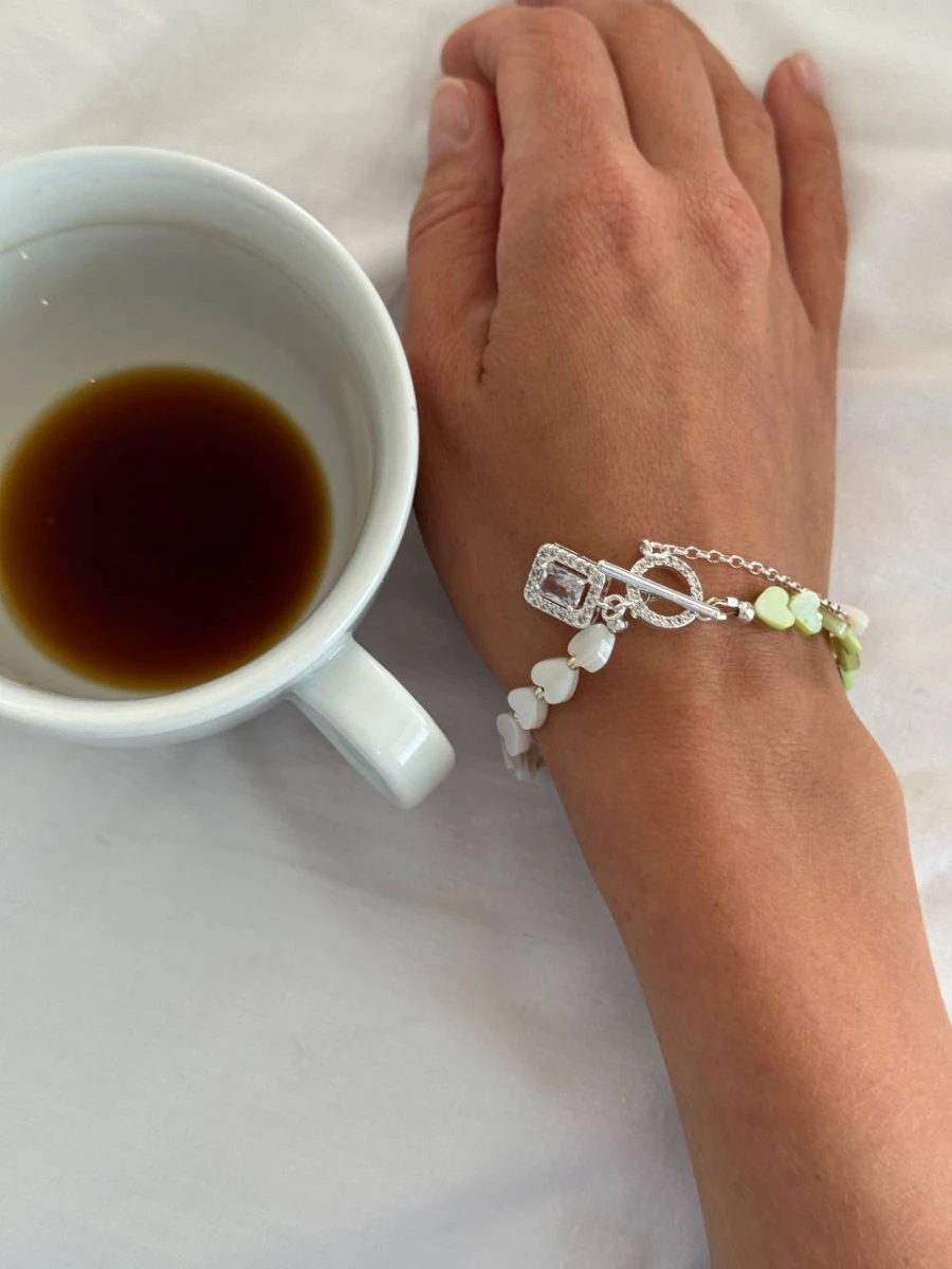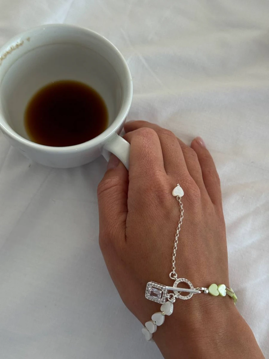 Браслет "Matcha Latte" — ніжна прикраса, що поєднує витонченість перламутрових сердець, блиск фіанітів та елегантність срібного покриття. Основа з медсплаву забезпечує міцність, а зручна тогл-застібка додає шарму. Без подовжувача — ідеальний вибір для витонченого образу.