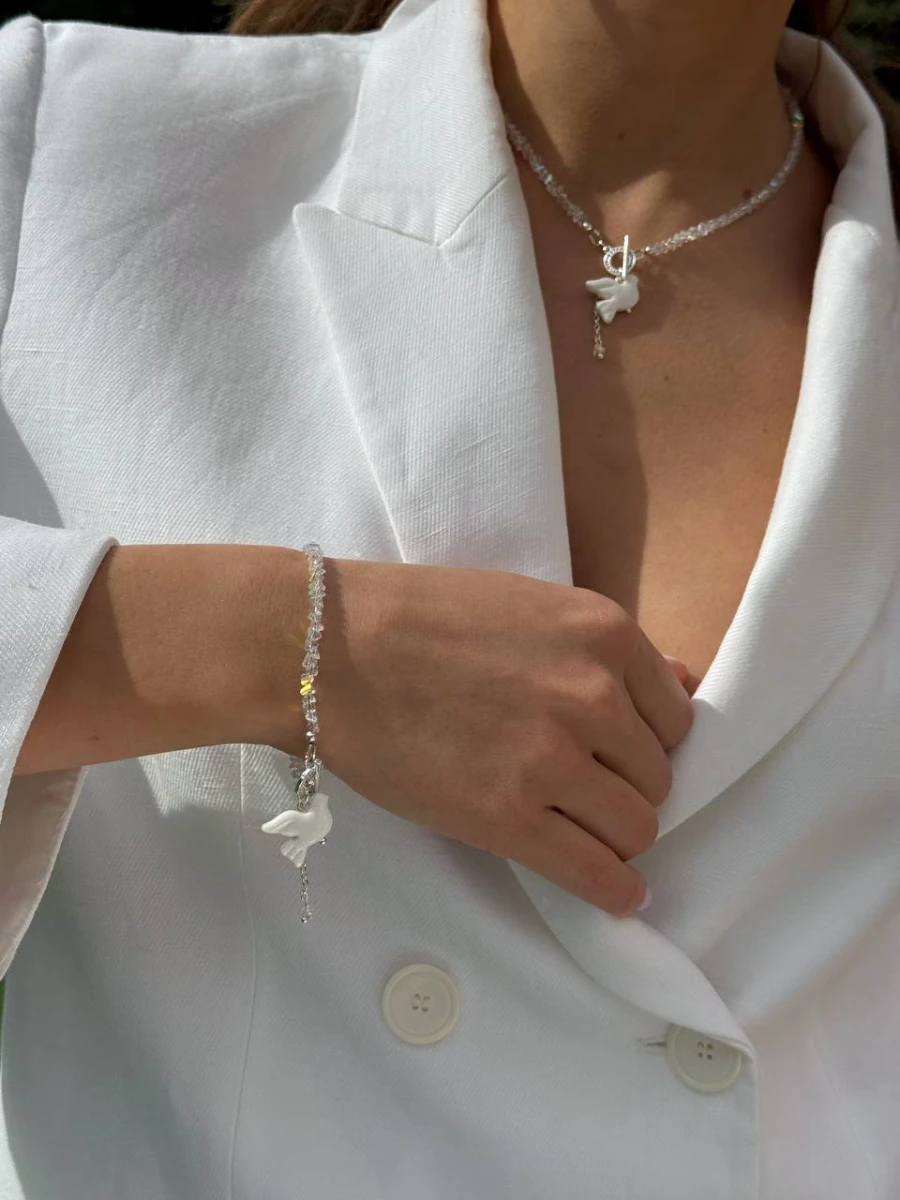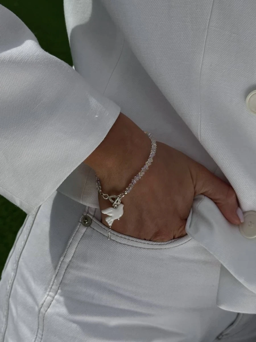 Браслет "Moonly Горлиця" — ніжна прикраса з глибоким змістом. Поєднання ювелірного скла, перлів, фіанітів та елементів із полімерної глини створює витончений образ. Медсплав із срібним покриттям додає елегантності, а застібка тогл надає браслету зручності та особливого шарму. Ідеальний вибір для тих, хто любить символіку й стиль в одному.