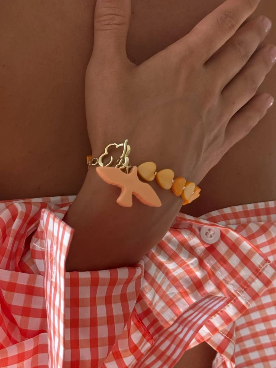Браслет Оранж Горлиця - Браслет з перламутрових сердець та позолоти: витонченість та ніжність у кожному дотику. Цей вишуканий браслет, створений з ніжної перламутрової й сяючої позолоти, стане справжньою окрасою вашої колекції ювелірних виробів. Він поєднує в собі елегантність та жіночність, роблячи ваш образ більш витонченим та романтичним.