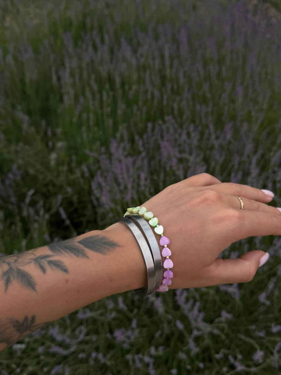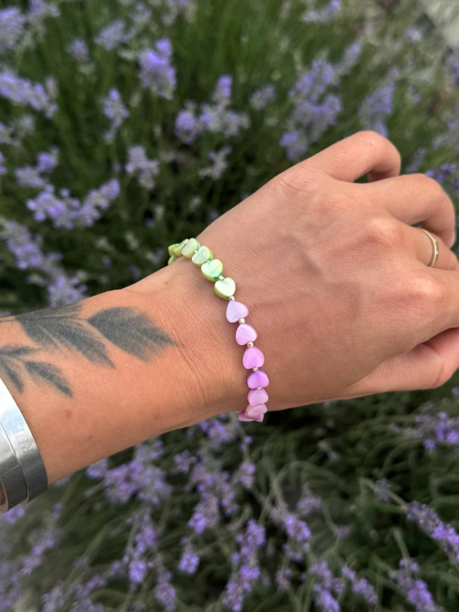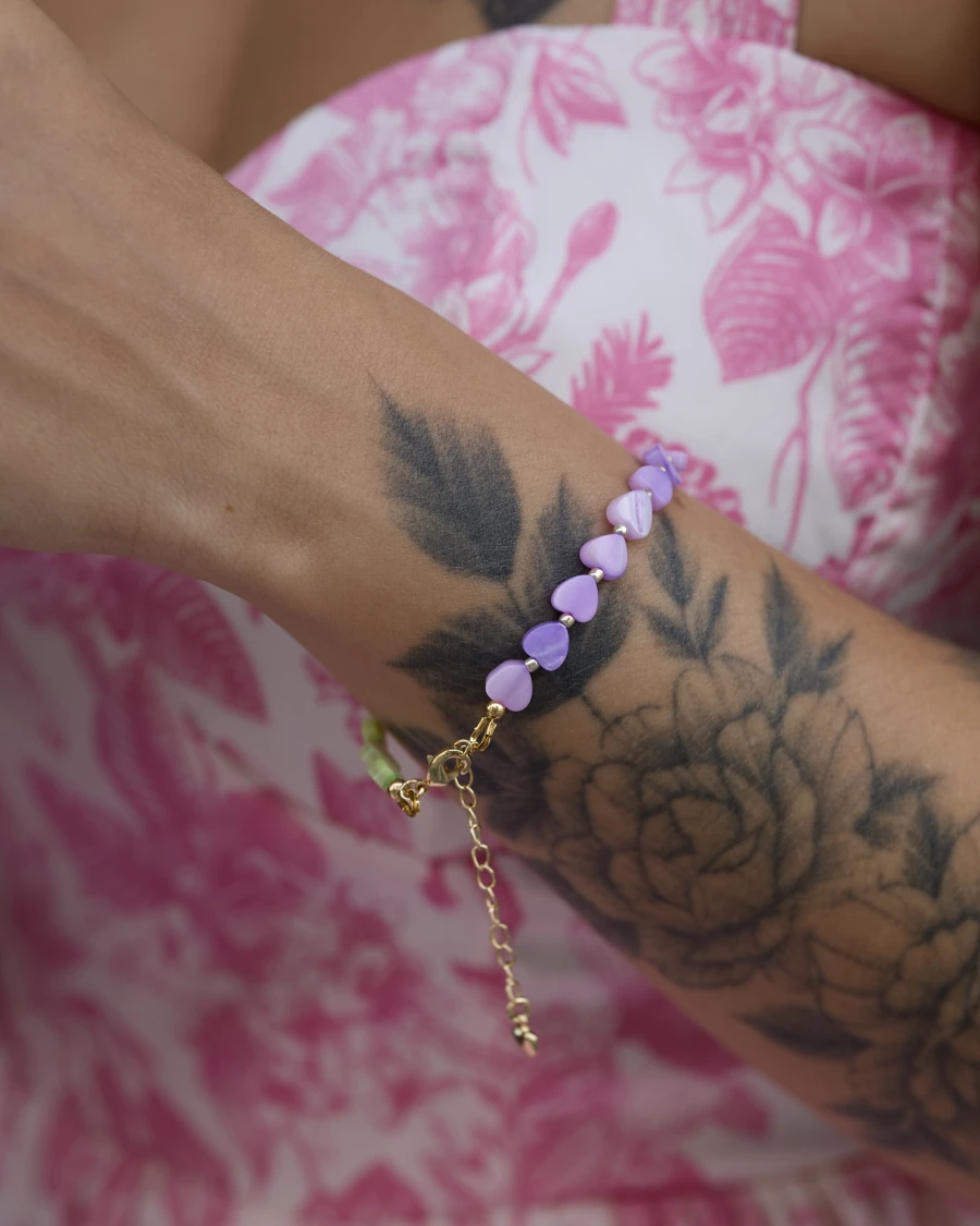 Браслет "Purple Matcha" — ніжна прикраса, що поєднує перламутрові серця, медсплав і покриття позолотою. Витончена застібка-карабін з подовжувачем 5 см дозволяє зручно регулювати довжину. Ідеальний акцент для романтичного образу.
