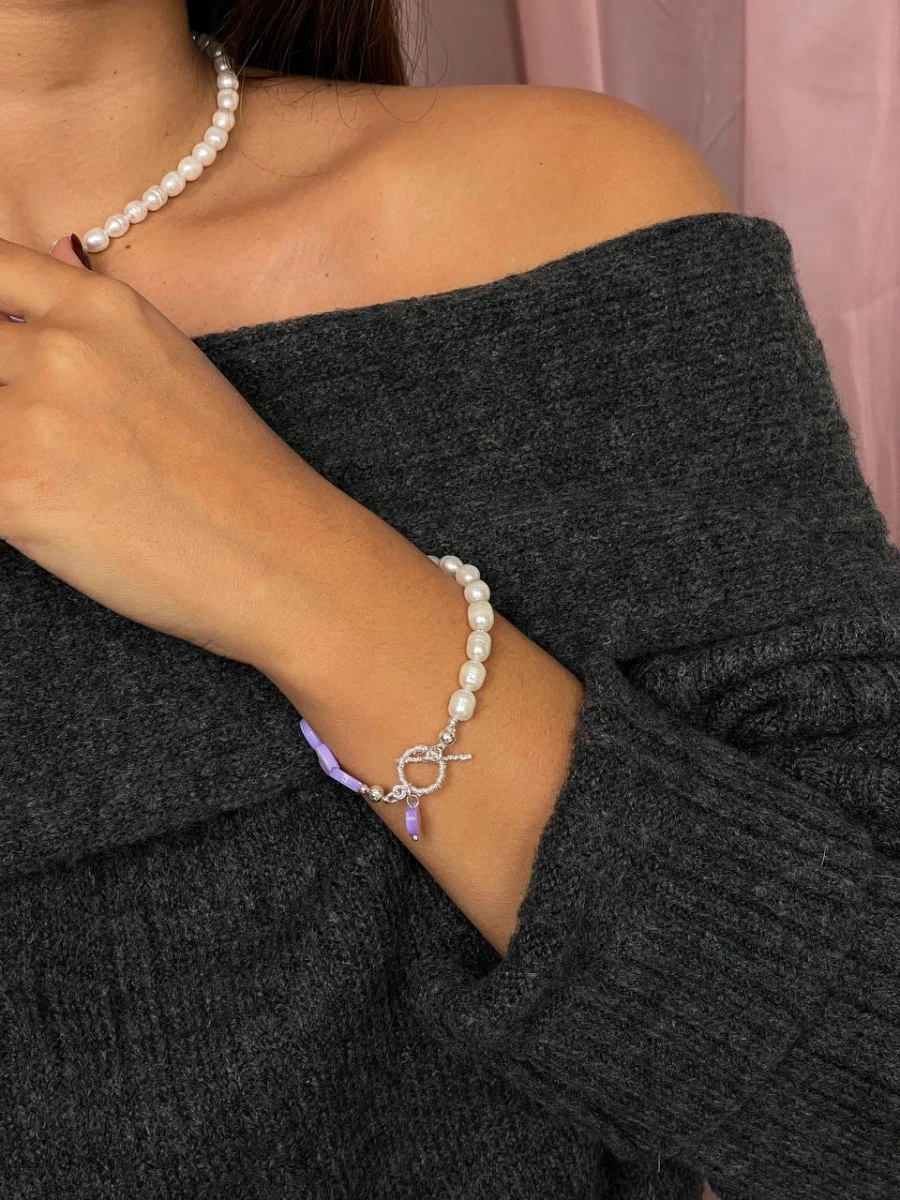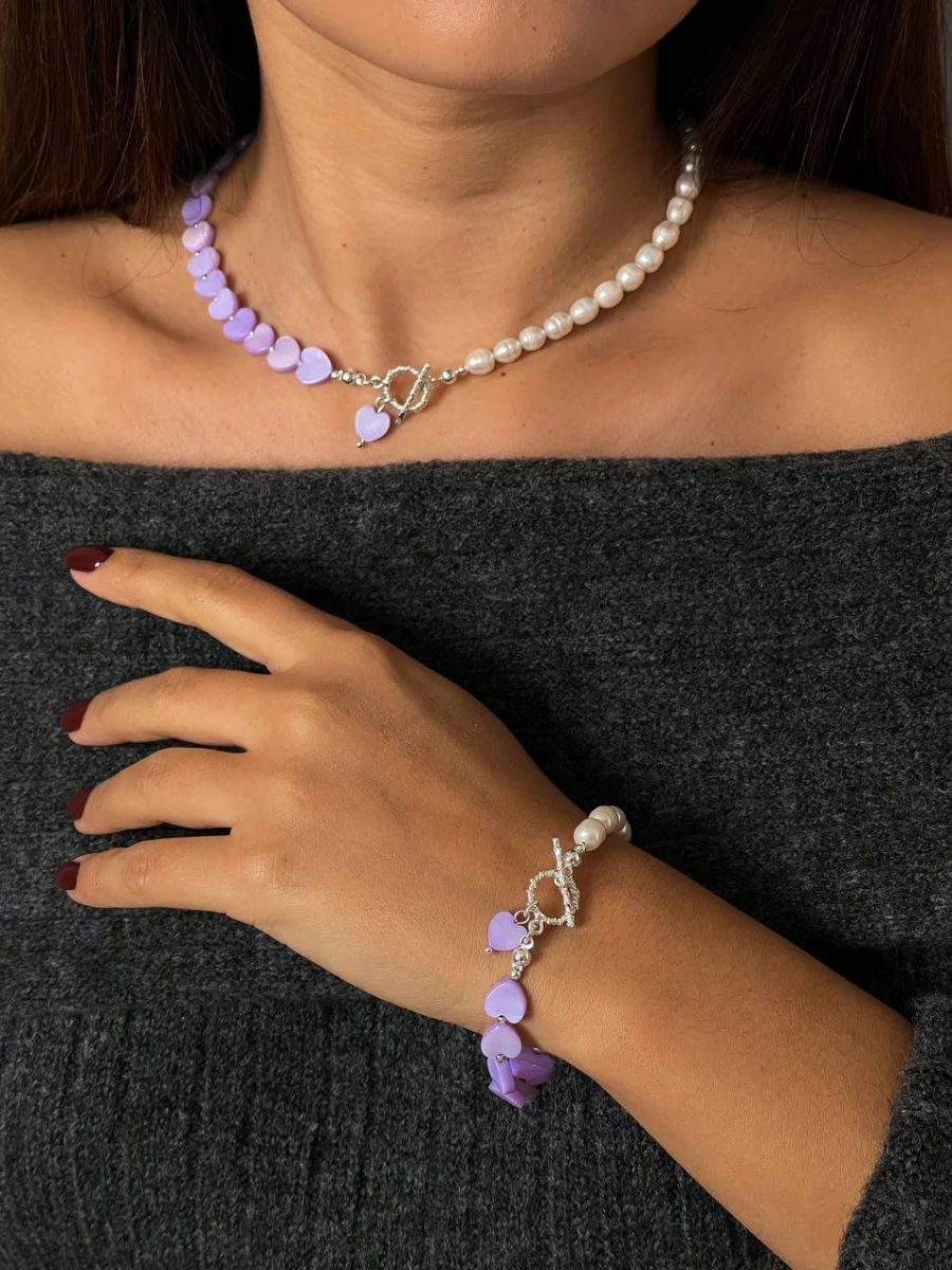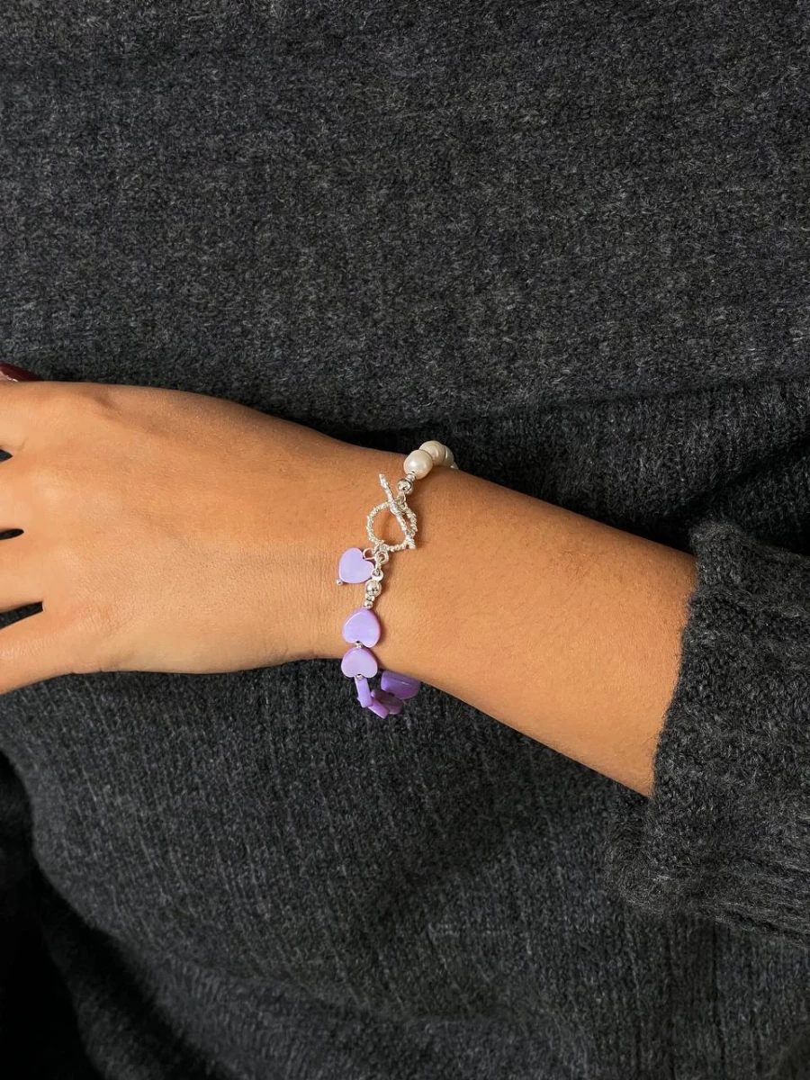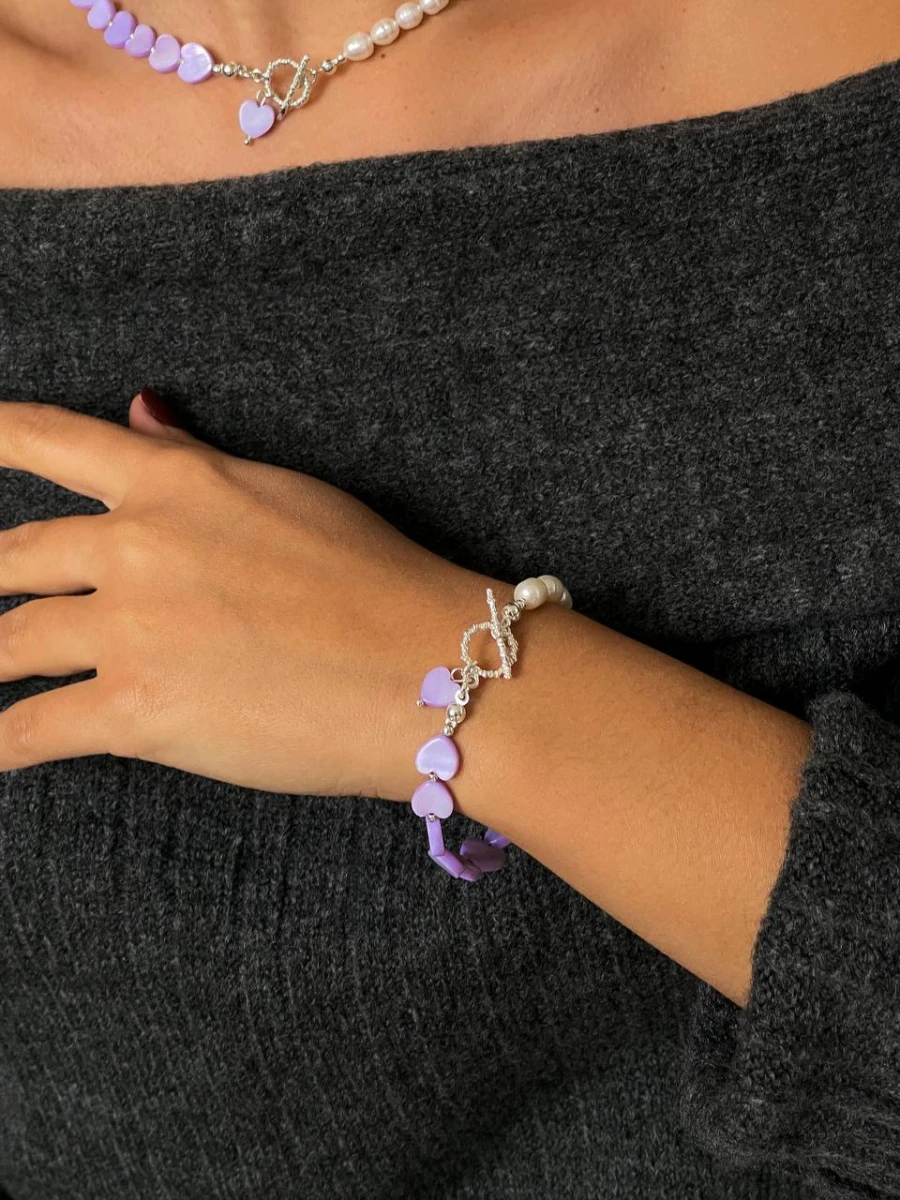 Браслет "Purple Vita" – це поєднання ніжності та вишуканості. Виготовлений з високоякісних перлів і перламутрових сердець, цей браслет стане елегантним акцентом у вашому образі. Завершує композицію срібна застібка тогл, яка додає зручності та стилю. Браслет без подовжувача, що надає йому мінімалістичного шарму та досконалості.