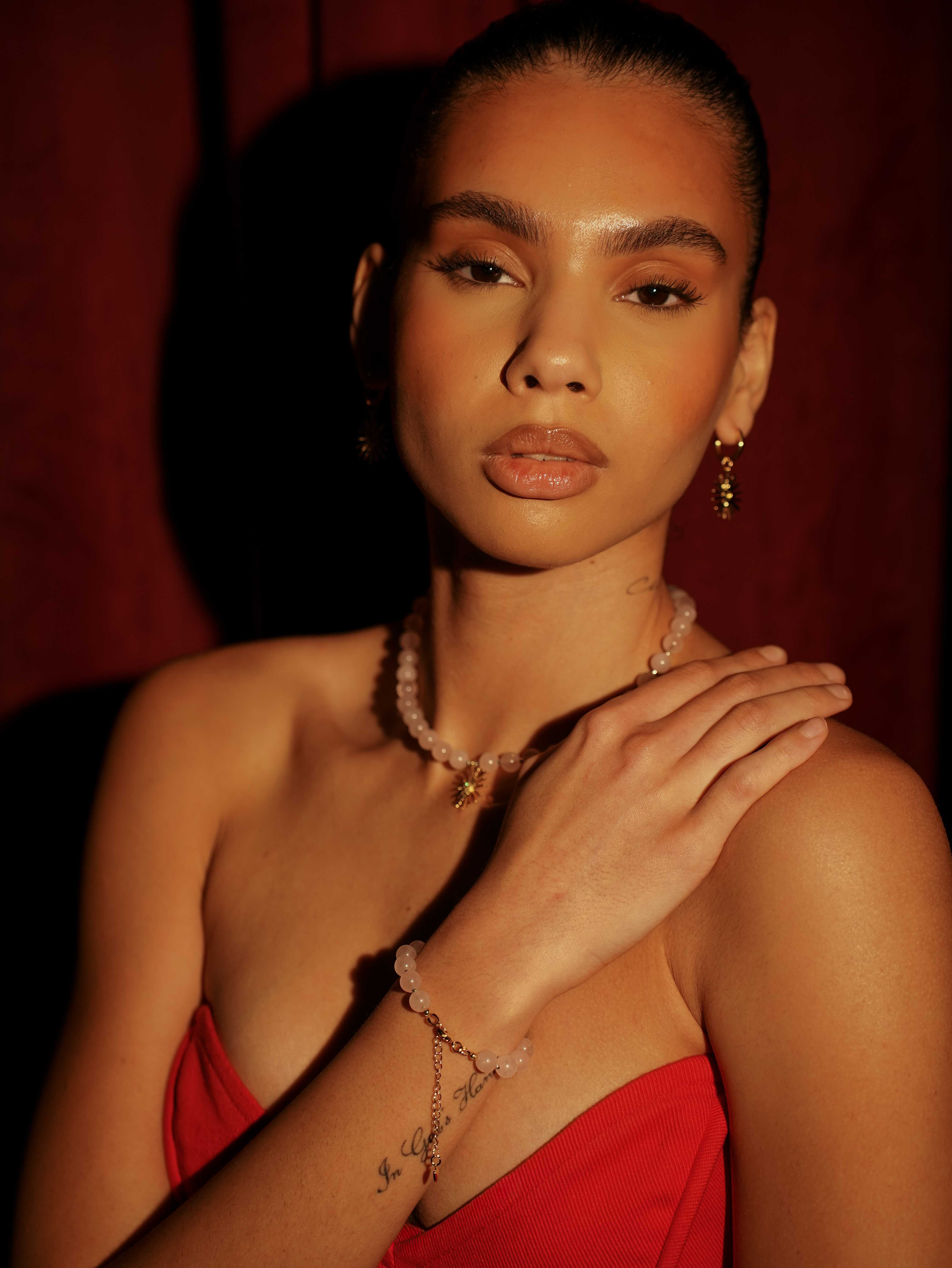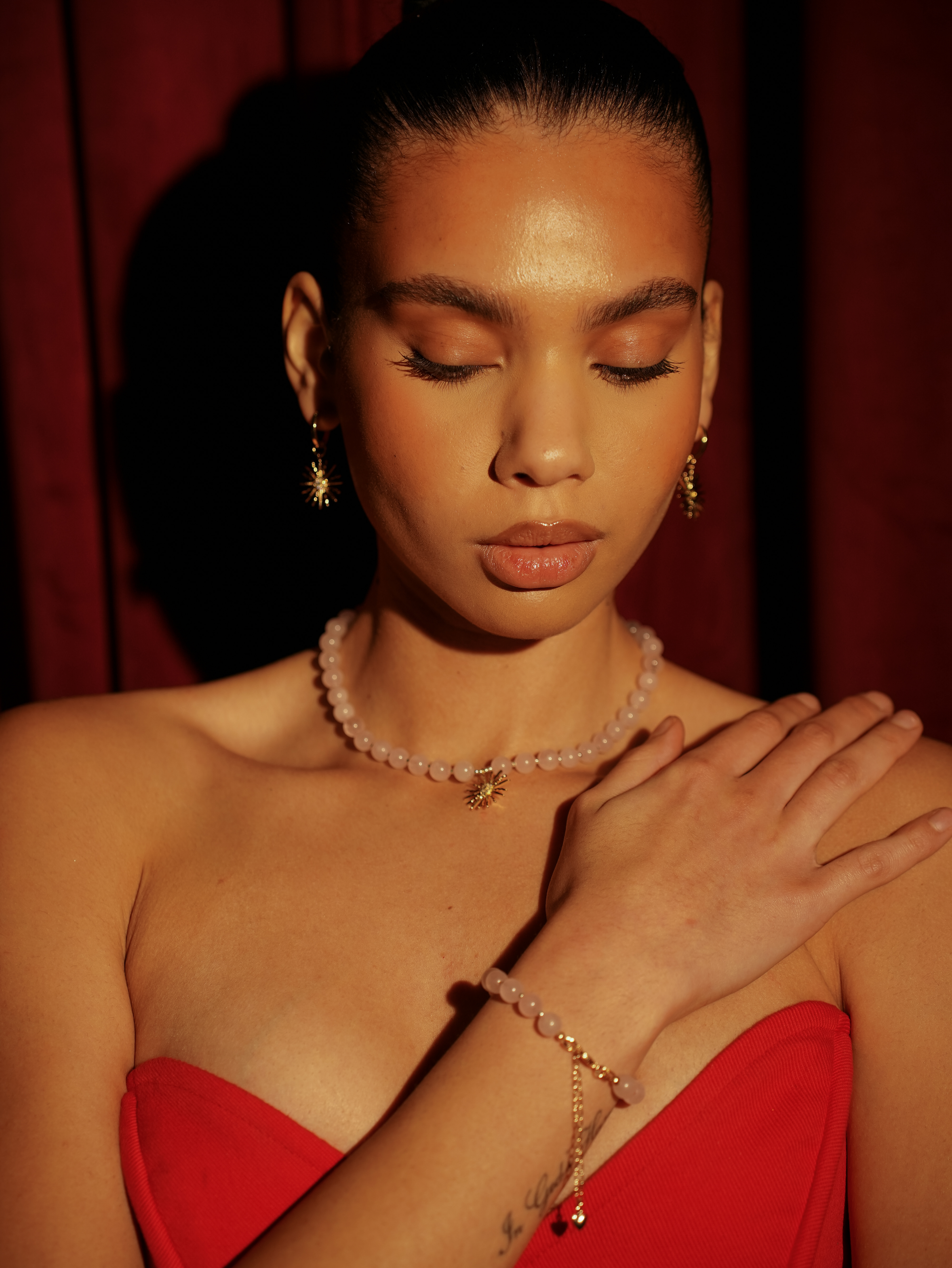 Ніжний браслет «Рожеве Різдво» виготовлений із натурального рожевого кварцу — каменю любові, гармонії та внутрішнього спокою. Акуратні намистини м’якого рожевого відтінку доповнені елементами з медсплаву з позолоченим покриттям, що надає прикрасі елегантності та святкового сяйва.