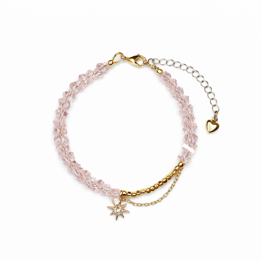 Витончений браслет «Рожеві зірки», створений із рожевого ювелірного скла та гематиту, стане яскравим акцентом вашого образу. Стильний кулон-зірка у позолоті додає прикрасі розкішного блиску та витонченості.