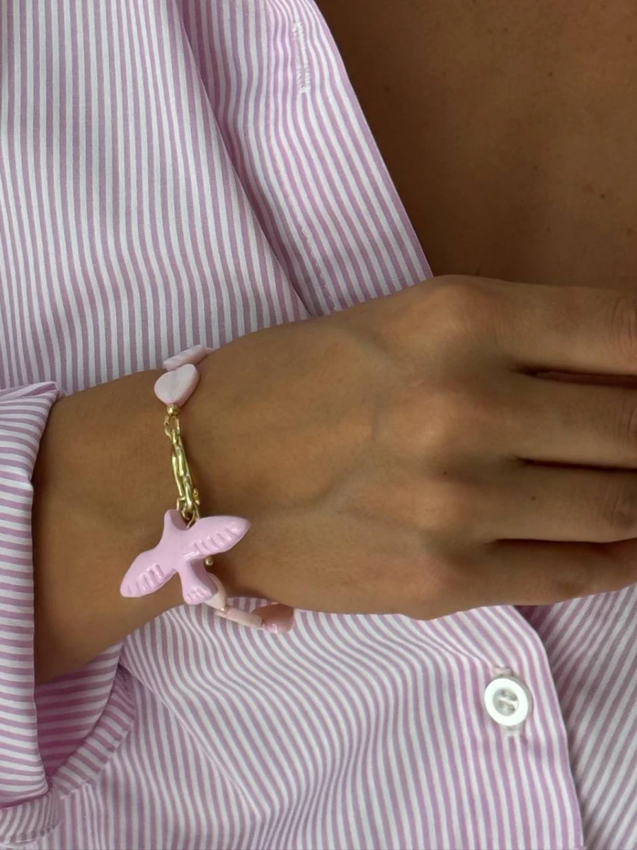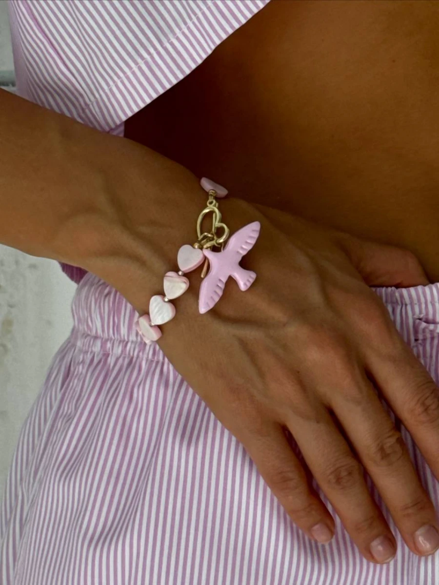 Браслет "Румʼяна Горлиця" - Цей вишуканий браслет стане справжньою окрасою вашої колекції прикрас. Він поєднує в собі ніжність перламутрових сердець з елегантністю позолоти та пташки з полімерної глини, створюючи неповторний образ, який підкреслить вашу красу та жіночність