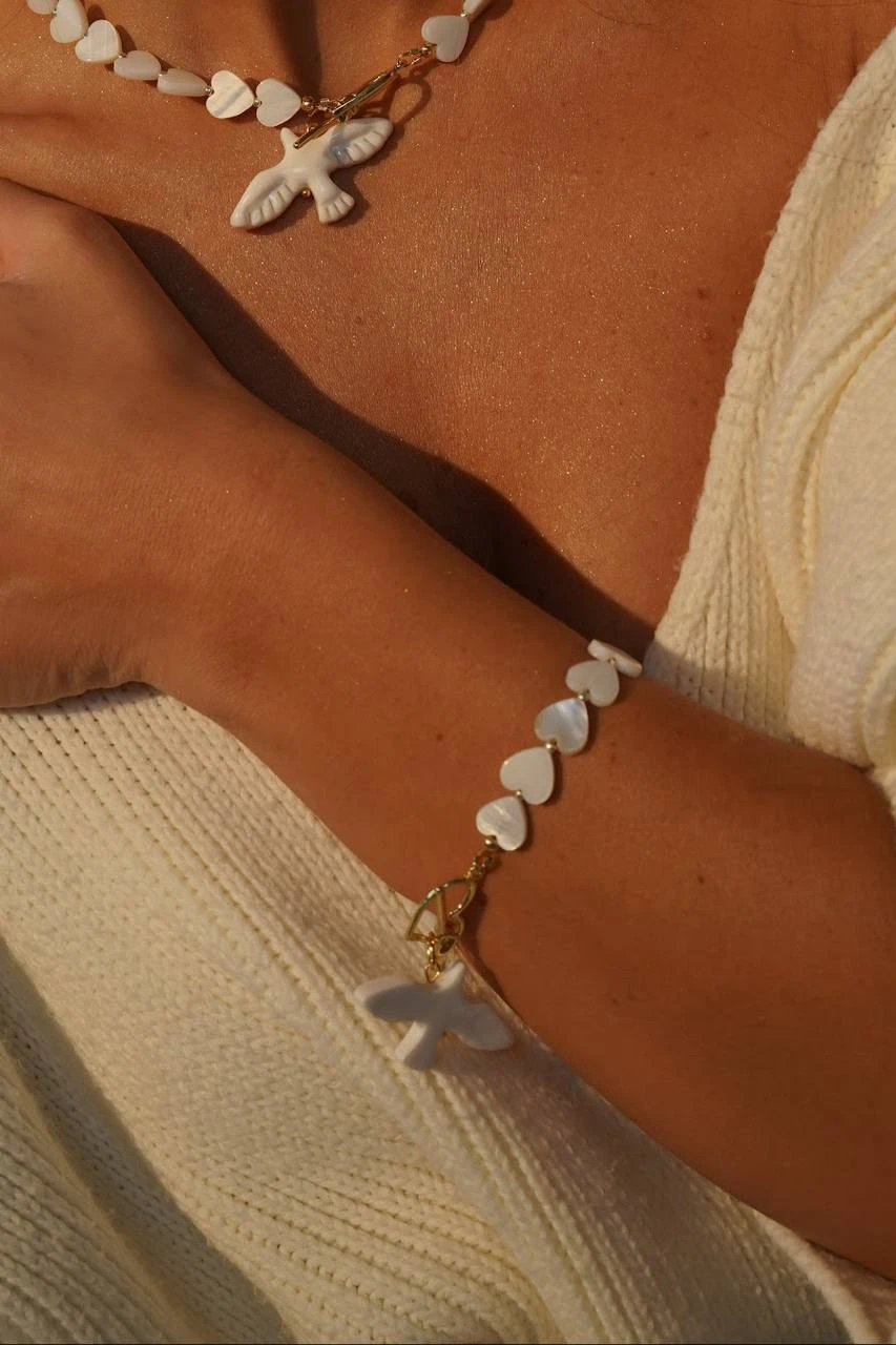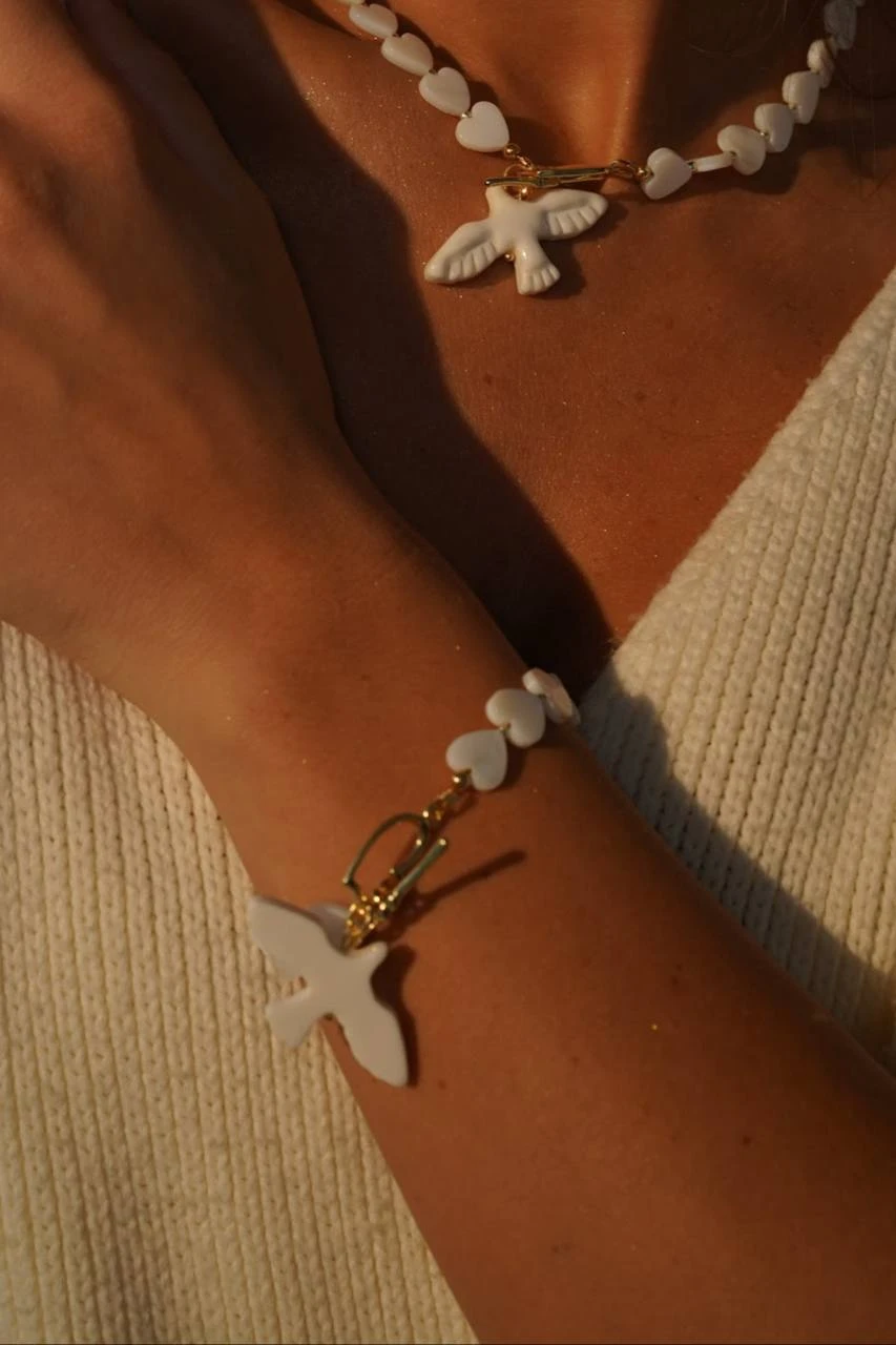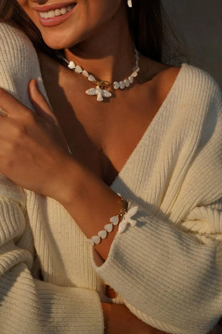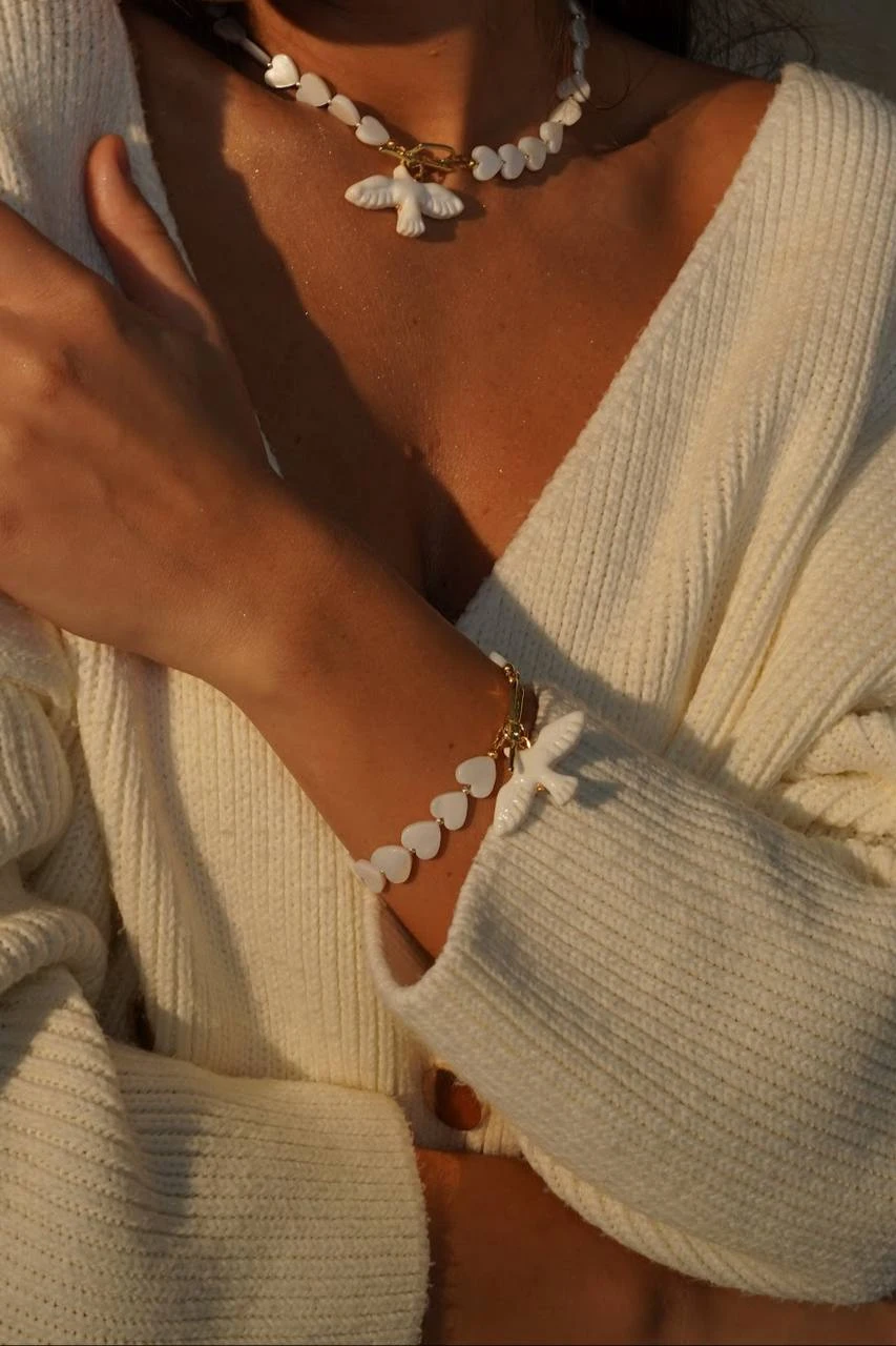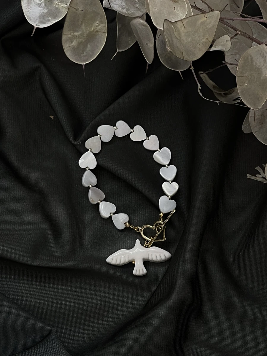 Браслет "Сердечна Горлиця " – це ніжне та романтичне творіння, створене для справжніх цінителів краси. Кожне серце, виготовлене з натурального перламутру, сяє м'яким світлом, символізуючи чистоту та ніжність почуттів. Доповнюють композицію милі пташки, виліплені з високоякісної полімерної глини, які додають браслету легкості та грайливості. Це ідеальний аксесуар для створення романтичного образу та підкреслення індивідуальності.