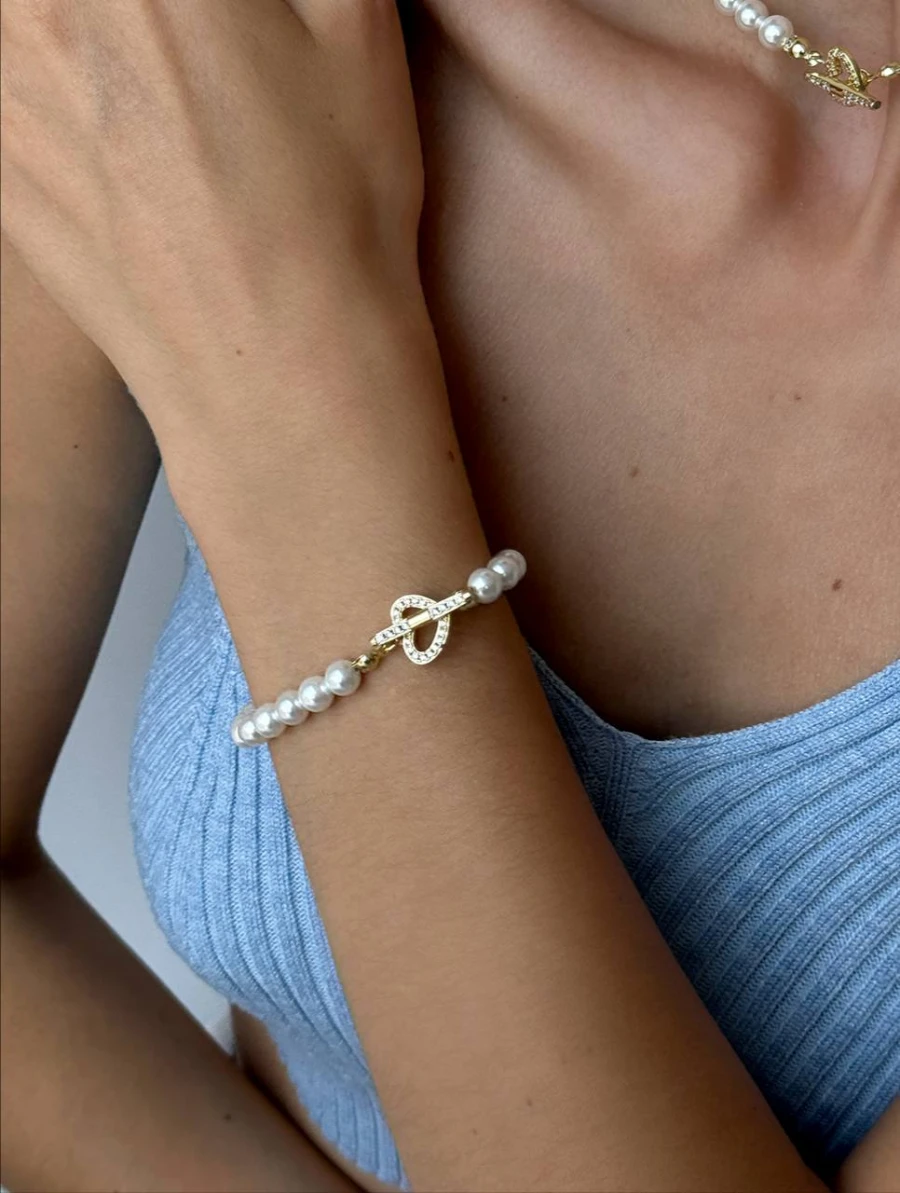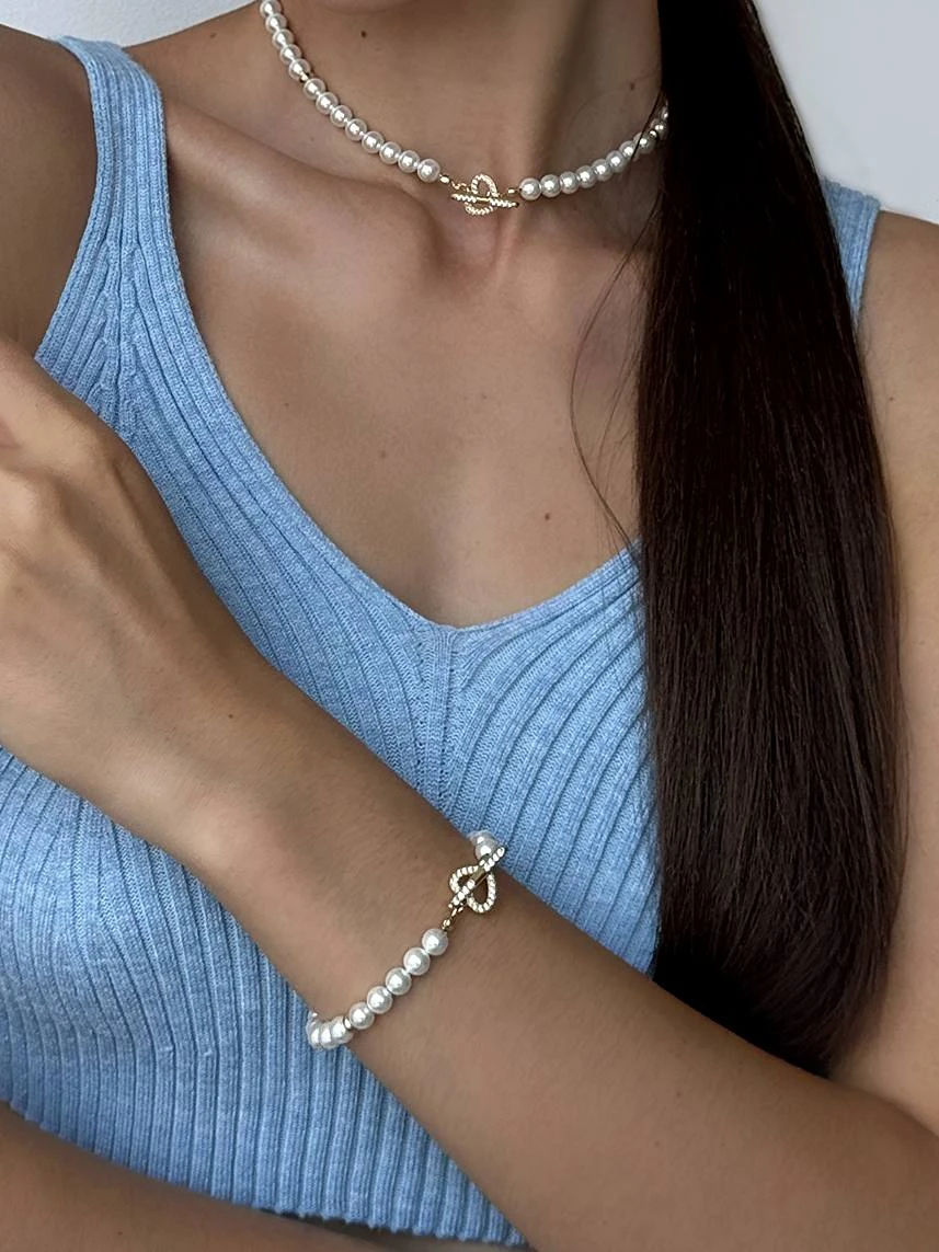 Цей вишуканий браслет виготовлений з позолоченого медсплаву та прикрашений сяючими фіанітами та перлинами майорки.Ця прикраса стане чудовим доповненням до будь-якого вбрання та чудово підійде для ділових зустрічей, урочистих заходів або просто для повсякденного носіння.