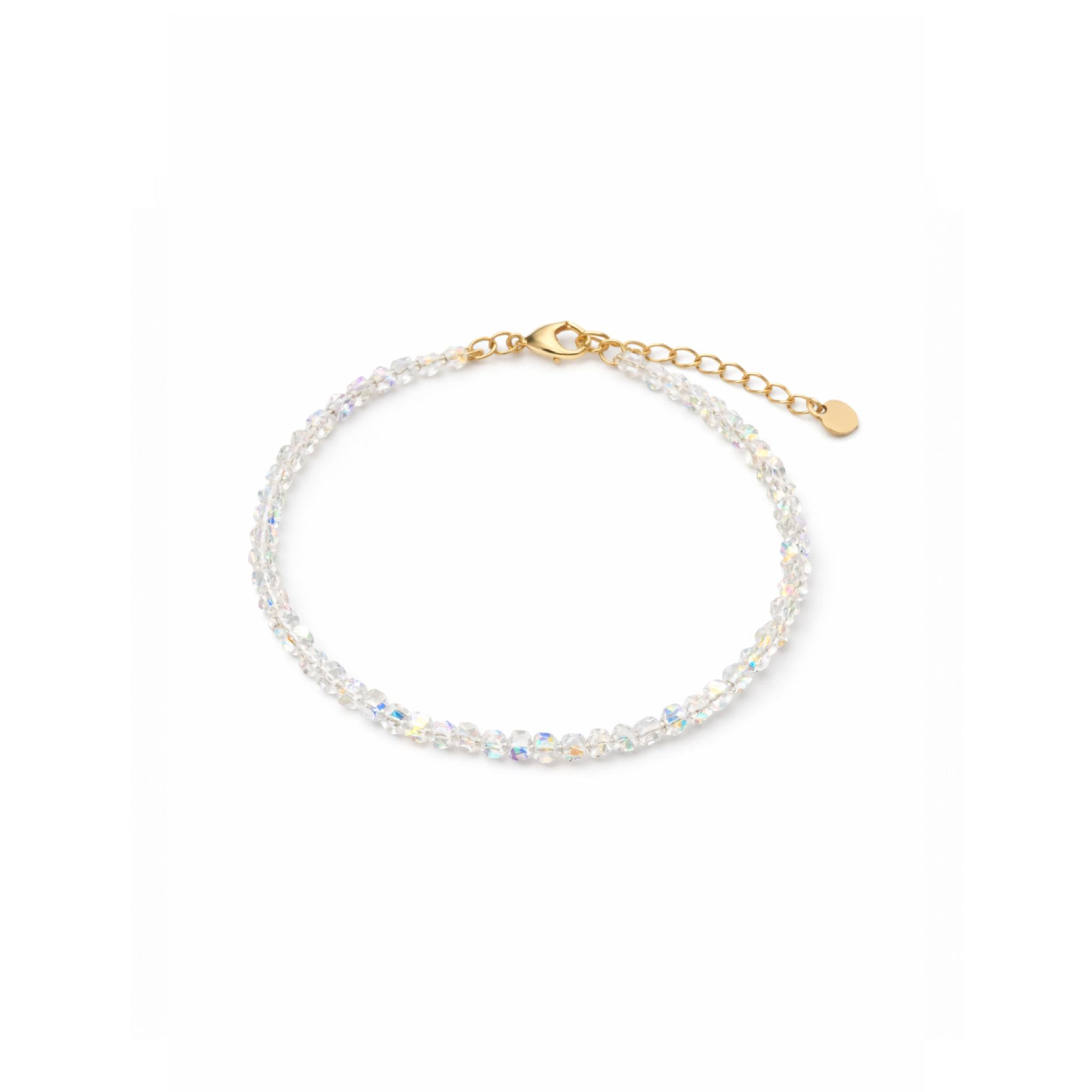 Цей ніжний браслет із прозорого ювелірного скла сяє при кожному русі, додаючи образу легкості та витонченості. Декоративний кулон із фіанітами та позолочені деталі створюють елегантний акцент, що підкреслює жіночність.