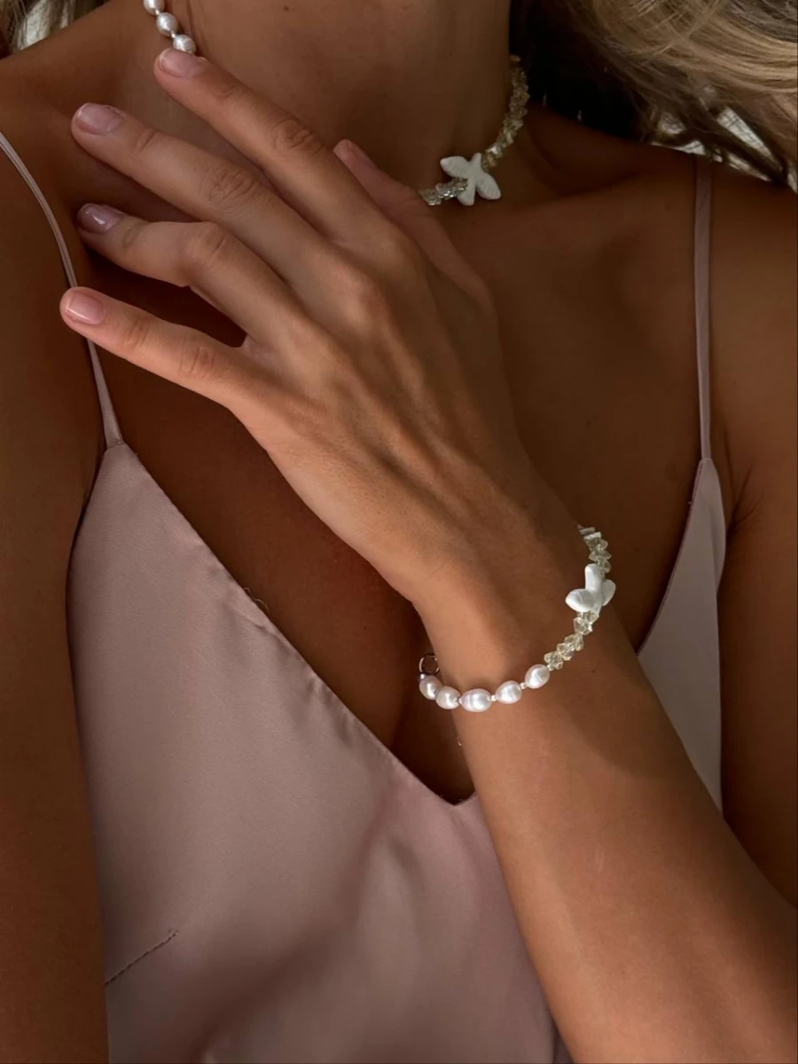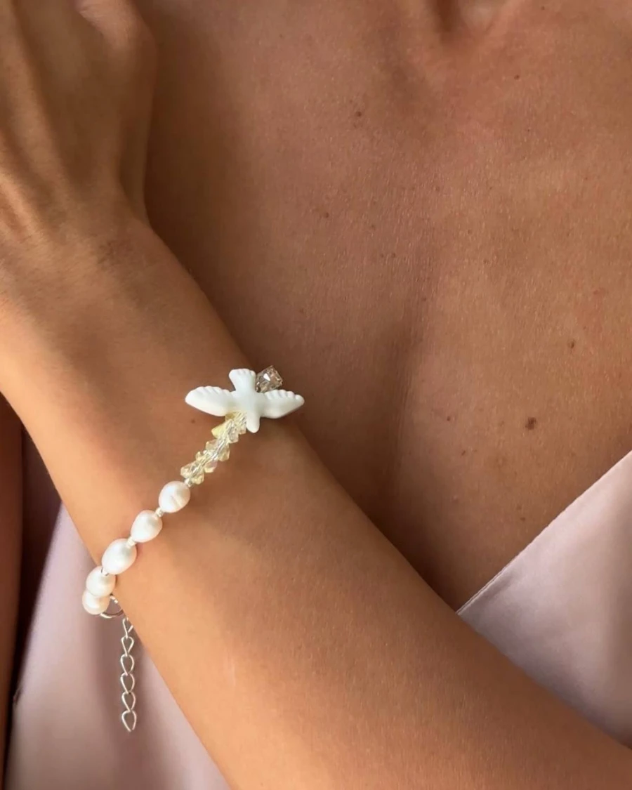 Браслет "Сонячна Горлиця" - Елегантний браслет, що підкреслить вашу красу. Цей вишуканий браслет виготовлений з ювелірного скла та перлин, що робить його ідеальним аксесуаром для будь-якої події. Він поєднує в собі блиск скла та ніжність перлин, створюючи неповторний образ.