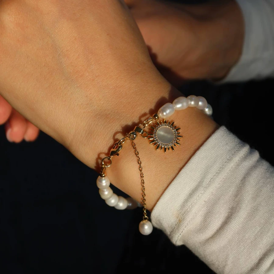 Витончений браслет «Сонячна Lilly» з річкових перлів, прикрашений кулоном-сонечком з перламутру та фіанітами. Позолочене покриття додає браслету розкоші, а регулятор-протяжка й подовжувач дозволяють зручно налаштувати довжину. Ідеальний акцент для вашого повсякденного чи святкового образу.