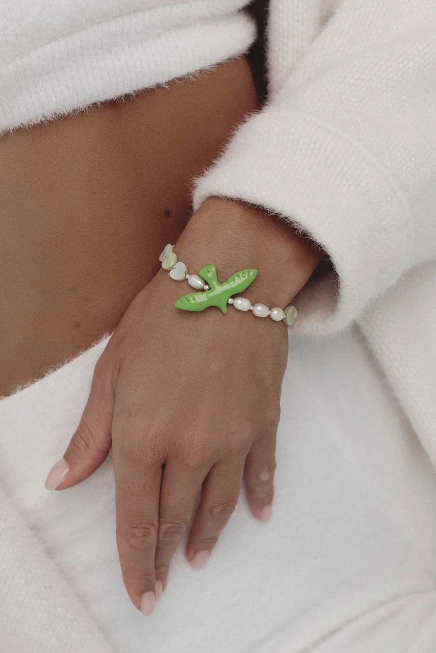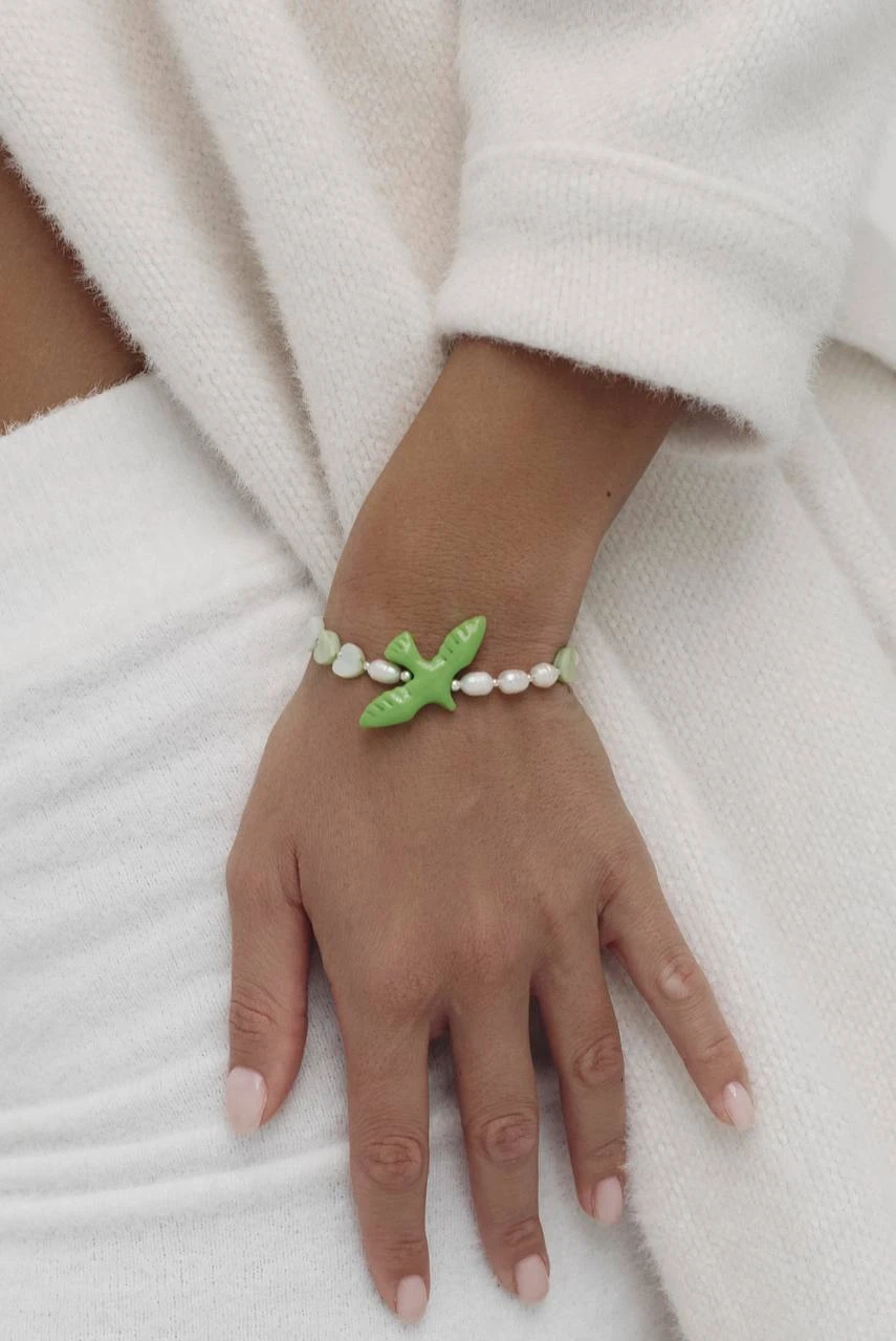 Представляємо вам вишуканий браслет, який поєднав у собі природну красу перлин, ніжність перламутру та неповторний шарм ручної роботи.високоякісні перлини, оточуючі пташку, додають браслету благородства та елегантності. Їхній м’який перламутровий блиск підкреслює жіночність та вишуканий смак власниці.