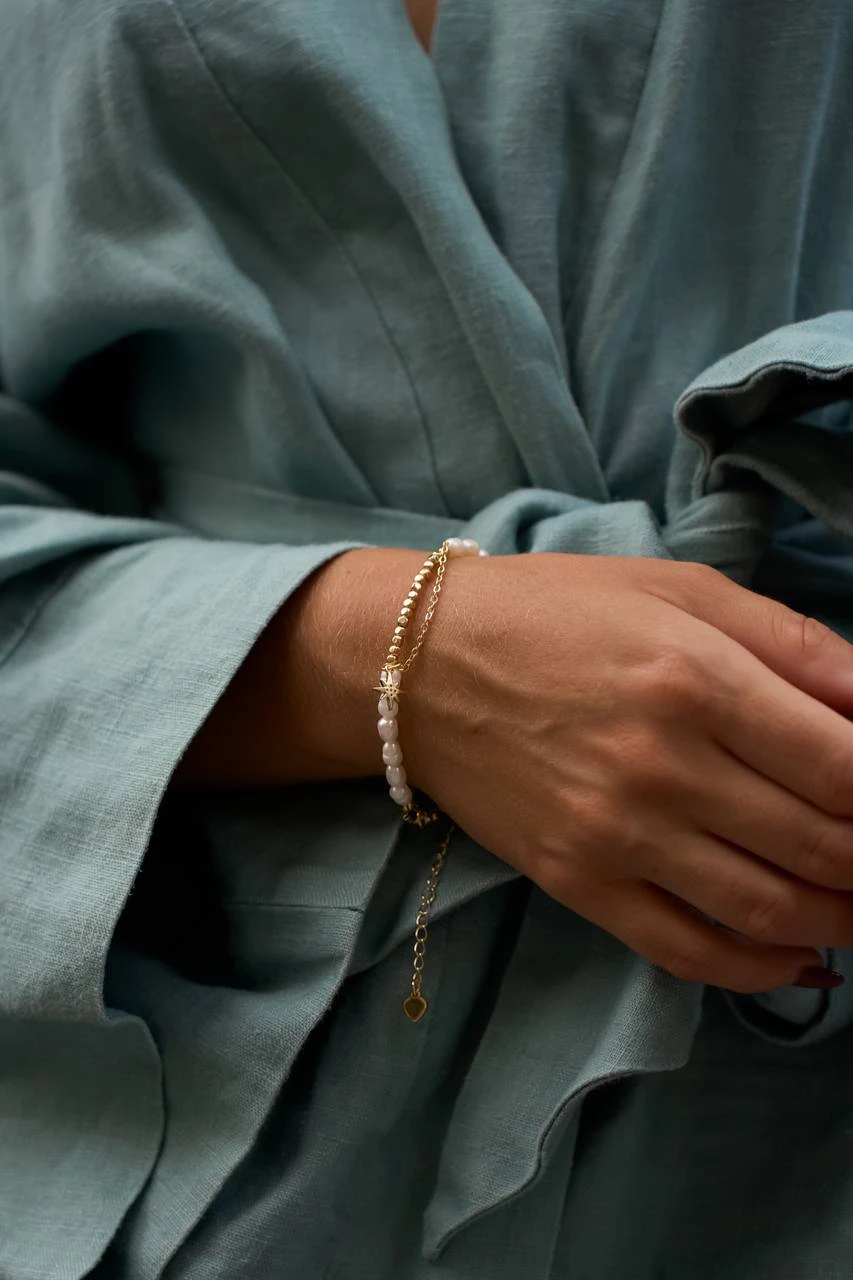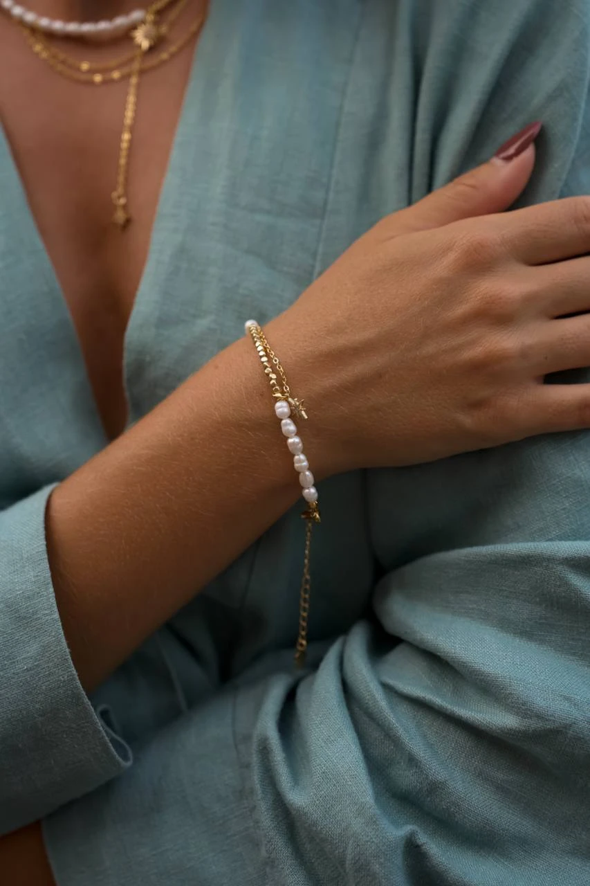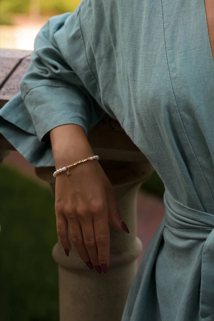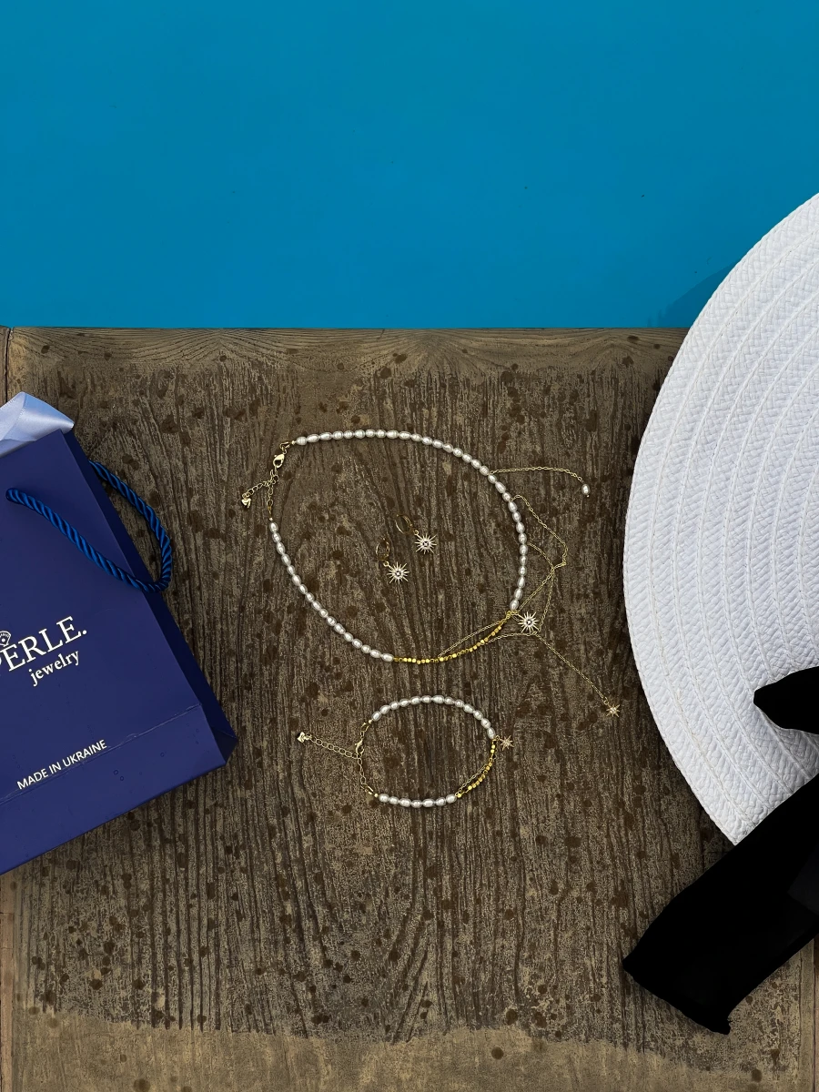Браслет "Зіркові Перлини" - це вишукане поєднання японського бісеру, перлин та позолоти. Ніжні фіаніти додають сяйва, а витончений дизайн підкреслює елегантність.