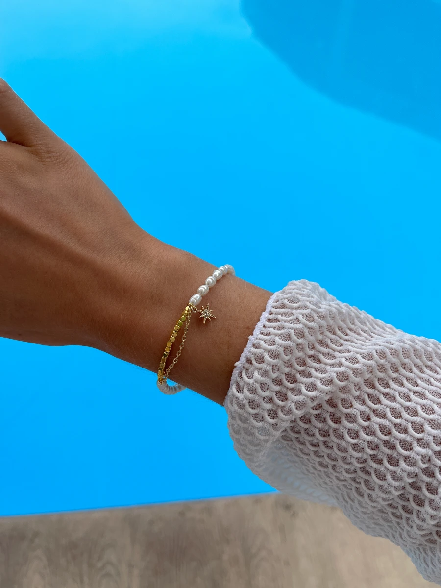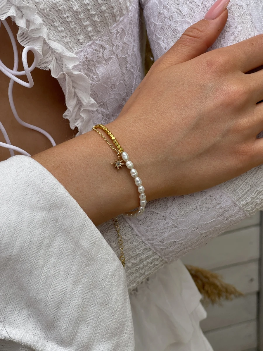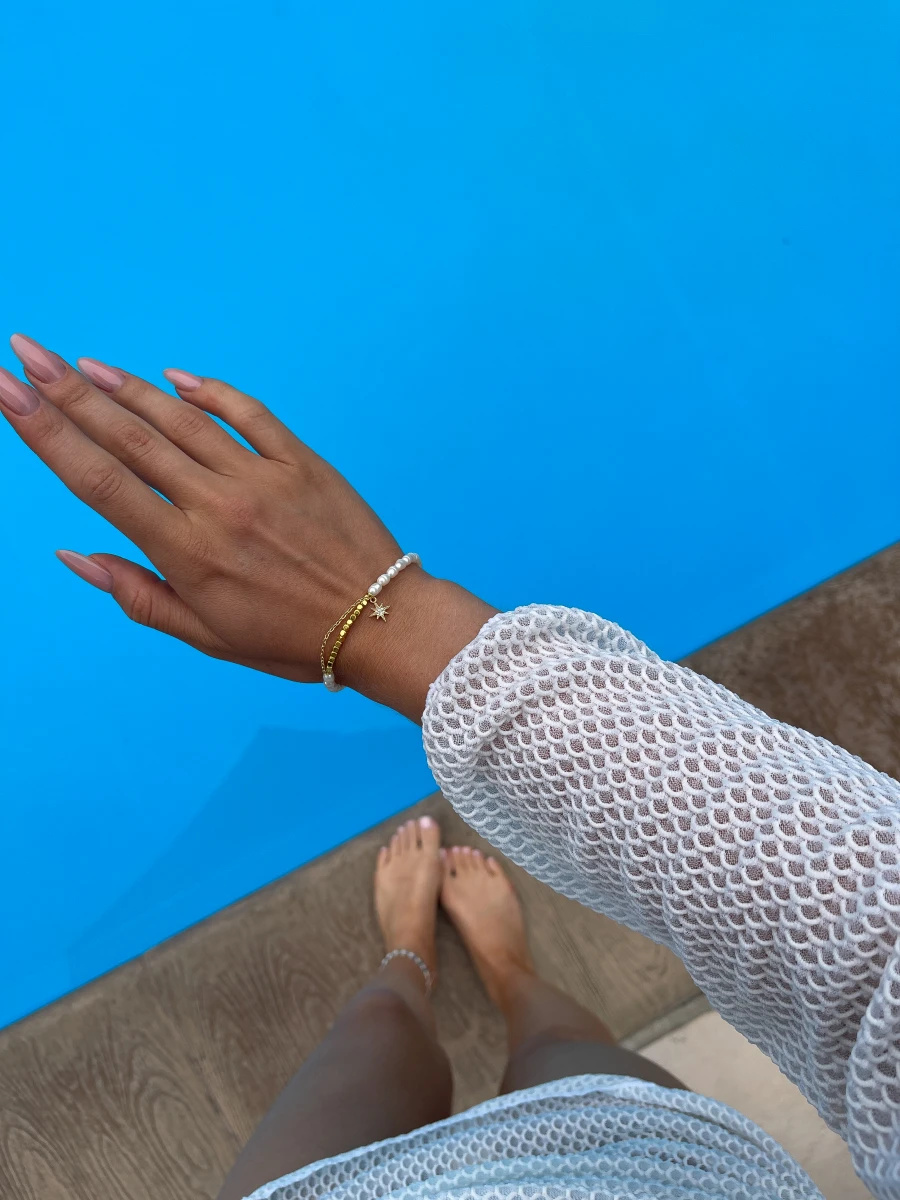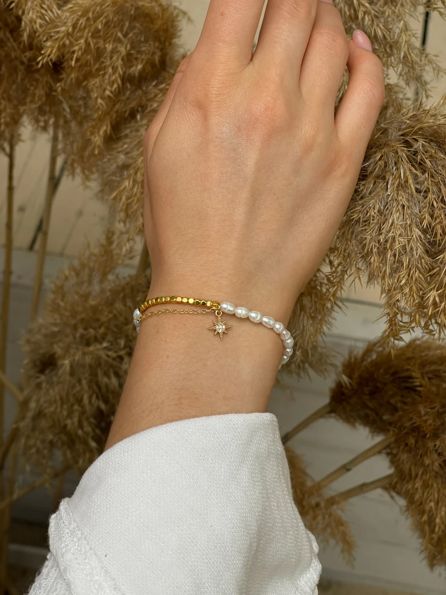 Браслет "Зіркові Перлини" - це вишукане поєднання японського бісеру, перлин та позолоти. Ніжні фіаніти додають сяйва, а витончений дизайн підкреслює елегантність.
