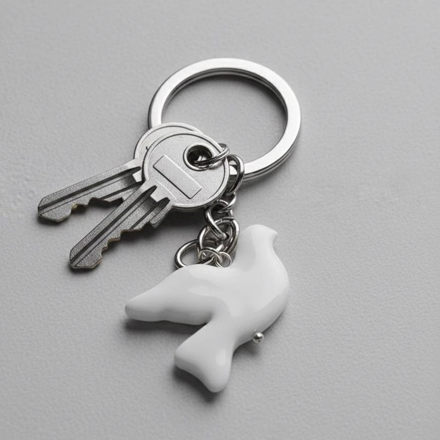 Лаконічний та елегантний брелок з білою горлицею — аксесуар, що поєднує в собі стиль, символіку та універсальність. Металеве кільце з медсплаву доповнене фігуркою з глянцевої полімерної глини у вигляді пташки, яка уособлює мир, любов і гармонію.