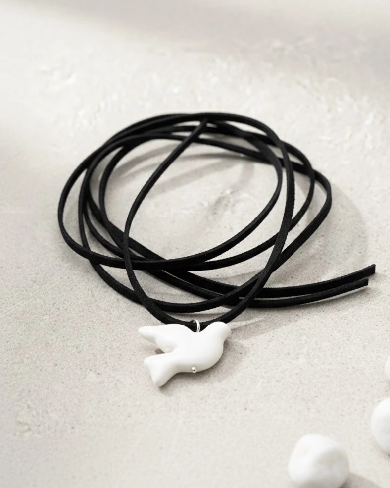 Чокер “Голуб” — це витончена та елегантна прикраса ручної роботи. Він виготовлений із чорної мотузки, медичного сплаву та полімерної глини. Центральна частина прикраси — це білий кулон у формі голуба, який символізує мир, свободу та внутрішню гармонію.