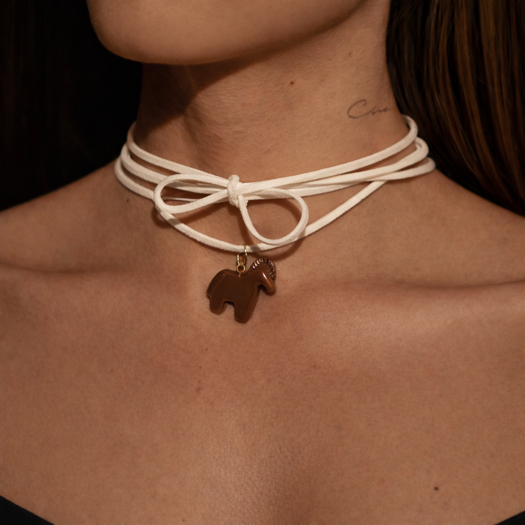 Витончений і водночас виразний чокер «Темний Коник» — це прикраса з глибоким настроєм і сучасною естетикою. Підвіска у формі коника, виконана з полімерної глини темного відтінку, символізує внутрішню силу, інтуїцію та спокійну впевненість. Контраст між темною підвіскою та світлою мотузкою створює елегантний, стильний акцент.