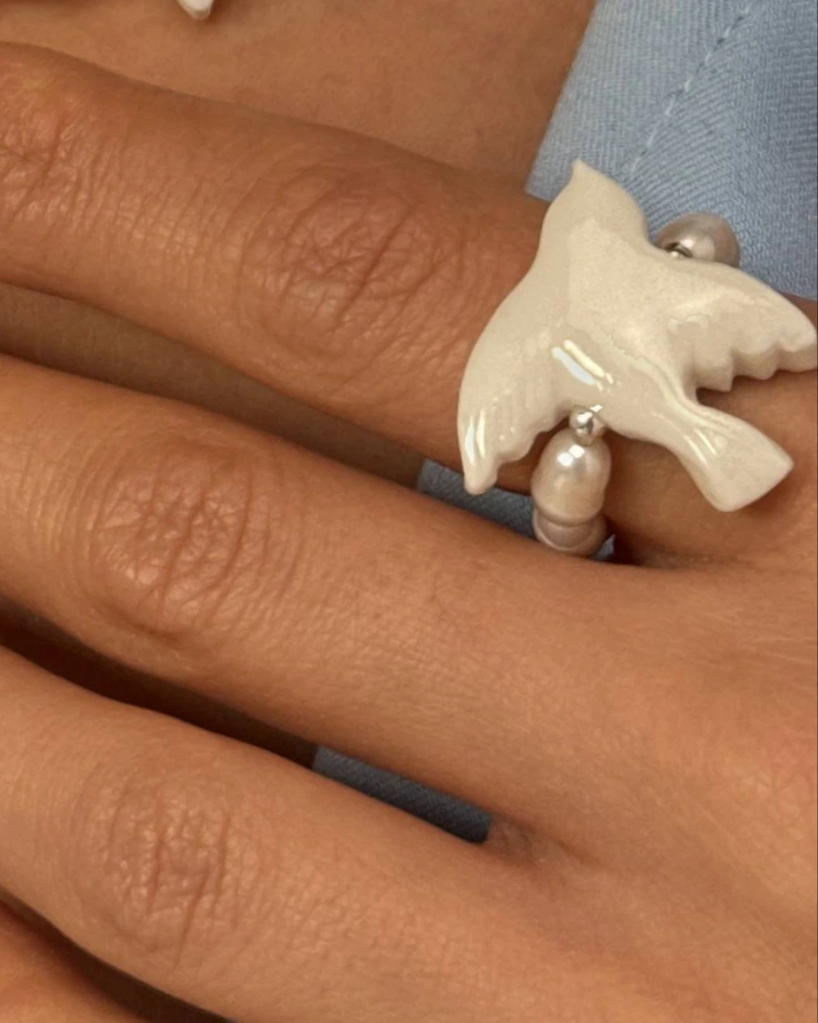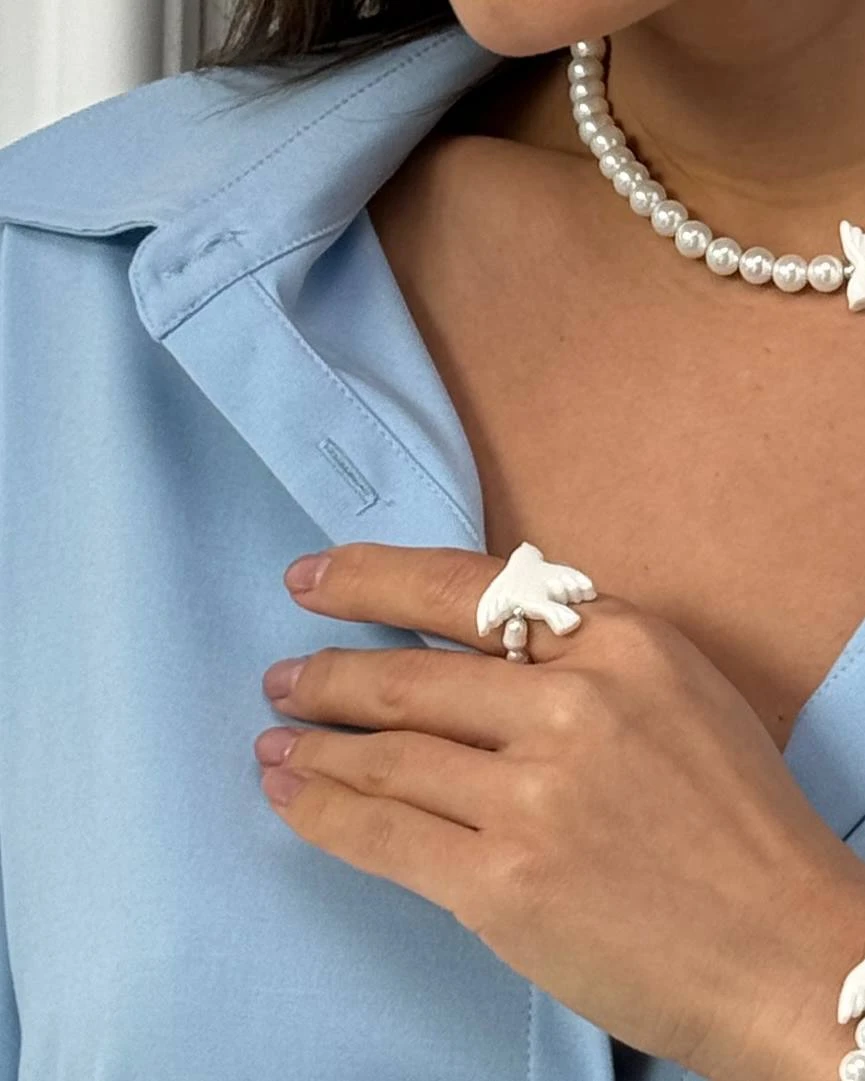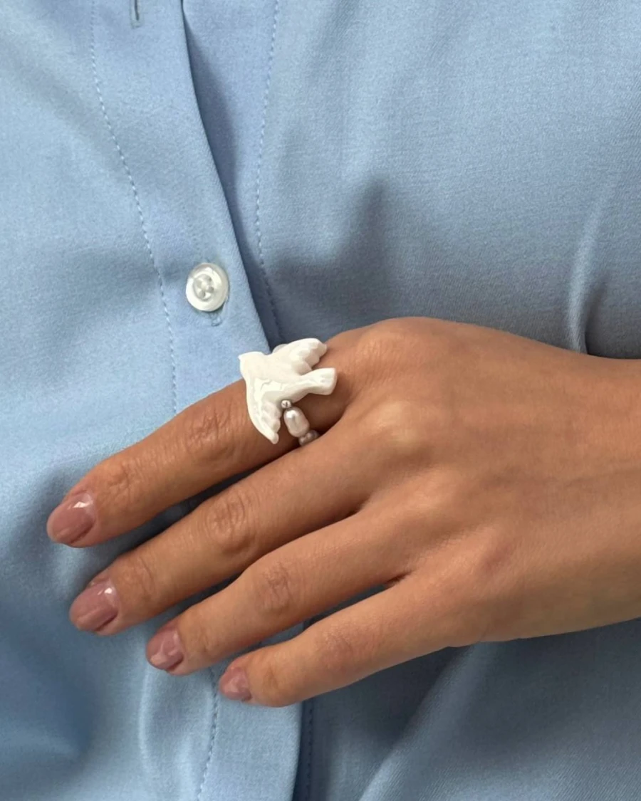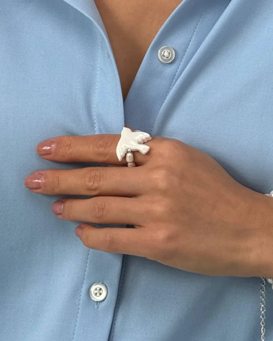 Каблучка "Голубка" символ миру та краси. Витончена підвіска у формі голубки, що символізує мир, вірність та кохання. Ніжні перли, що переливаються ніжним блиском, підкреслюють вашу елегантність.