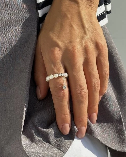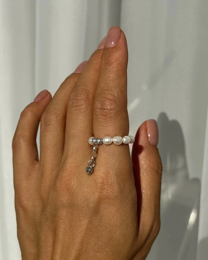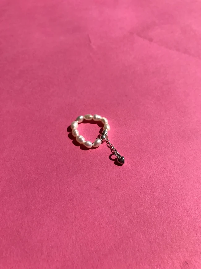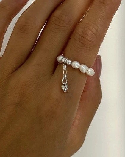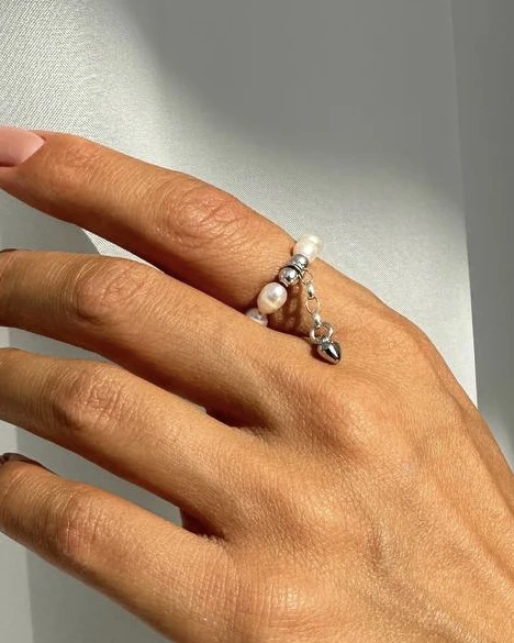 Перли, символізуючи чистоту та ніжність, створюють відчуття легкості та розкіші. Срібне серце на ланцюжку додає каблучці романтичний шарм і символізує кохання та прихильність.