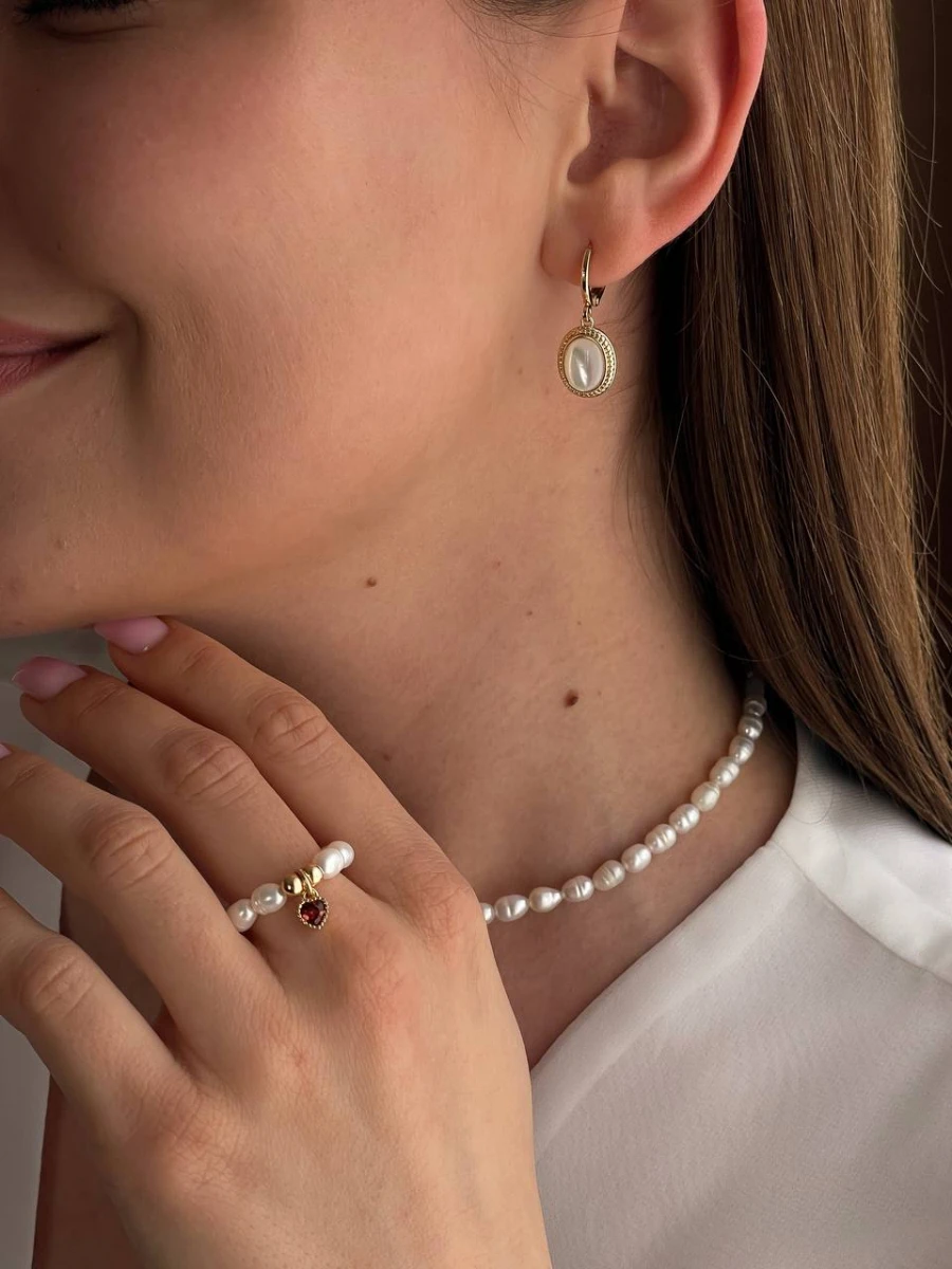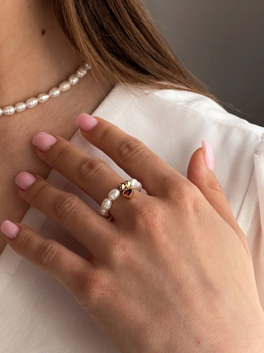 Каблучка "Red Story" — витончений ювелірний виріб, що поєднує в собі елегантність перлів, розкіш медсплаву з позолотою та яскраві фіаніти. Цей стильний аксесуар додає вишуканості та елегантності будь-якому образу, стаючи ідеальним доповненням до вашого гардеробу.