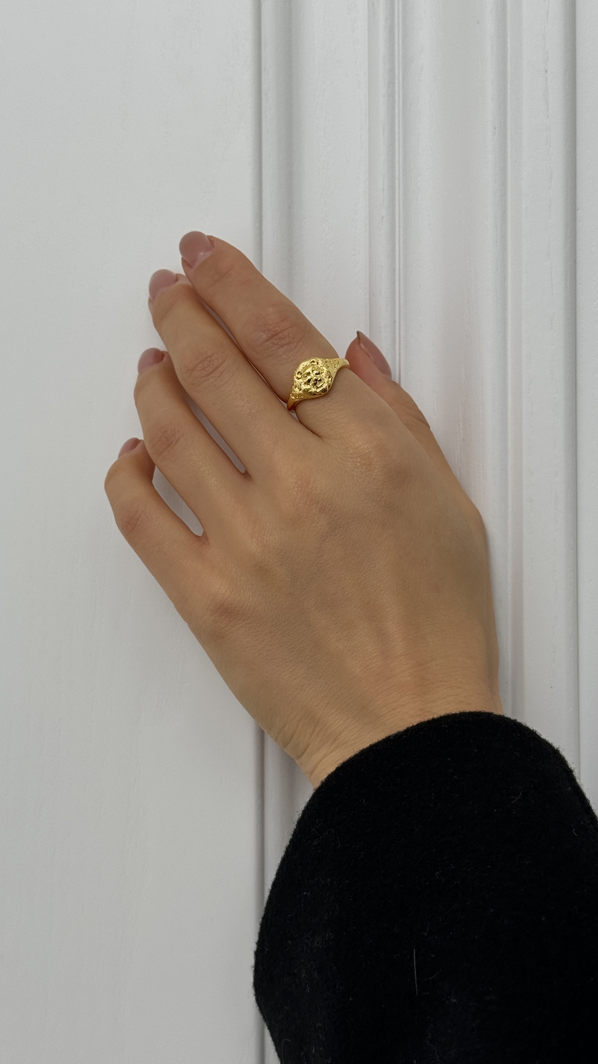 Каблучка «Сміливість» — прикраса для жінки, яка не боїться бути помітною та справжньою. Її виразний рельєфний дизайн привертає увагу з першого погляду, а насичений відтінок позолоти додає образу впевненості, тепла й благородності. Це аксесуар, що легко перетворює мінімалістичний лук на стильний та характерний.