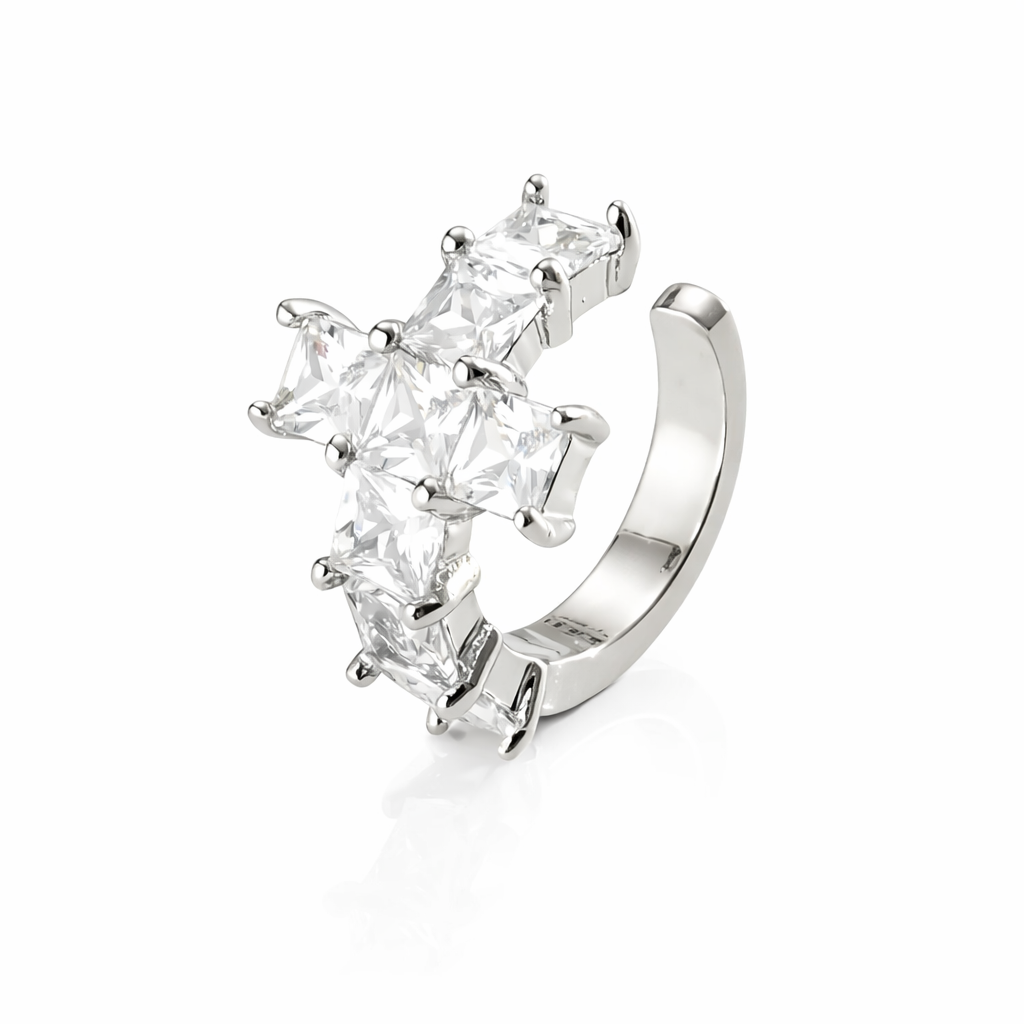 Кафф Faith — елегантна дизайнерська сережка з кулоном, прикрашеним сяйливими цирконами. Срібне покриття на медсплаві підкреслює чисту форму та мінімалістичну естетику прикраси. Кафф зручно фіксується без проколу та стане стильним акцентом у щоденних і вечірніх образах