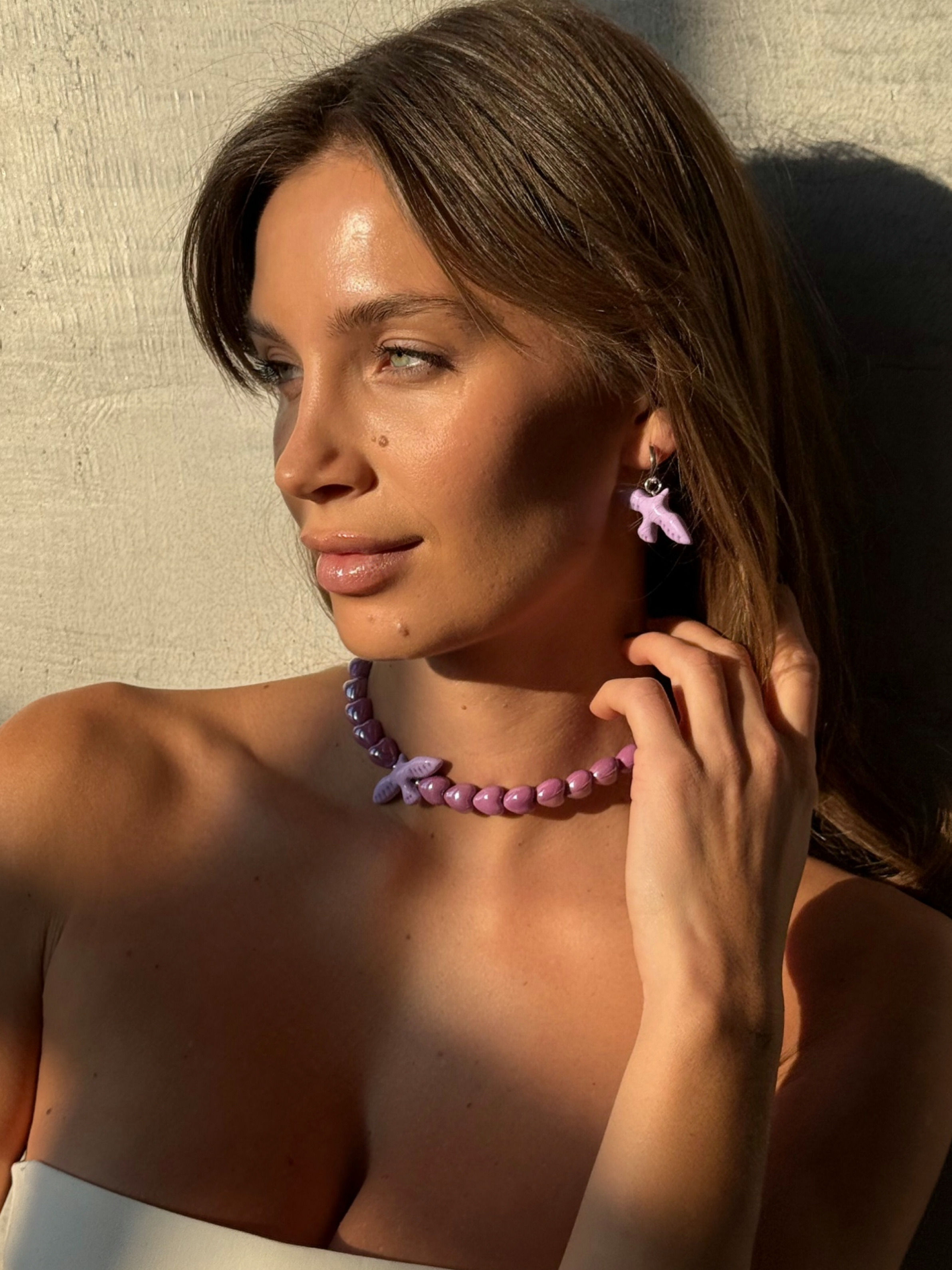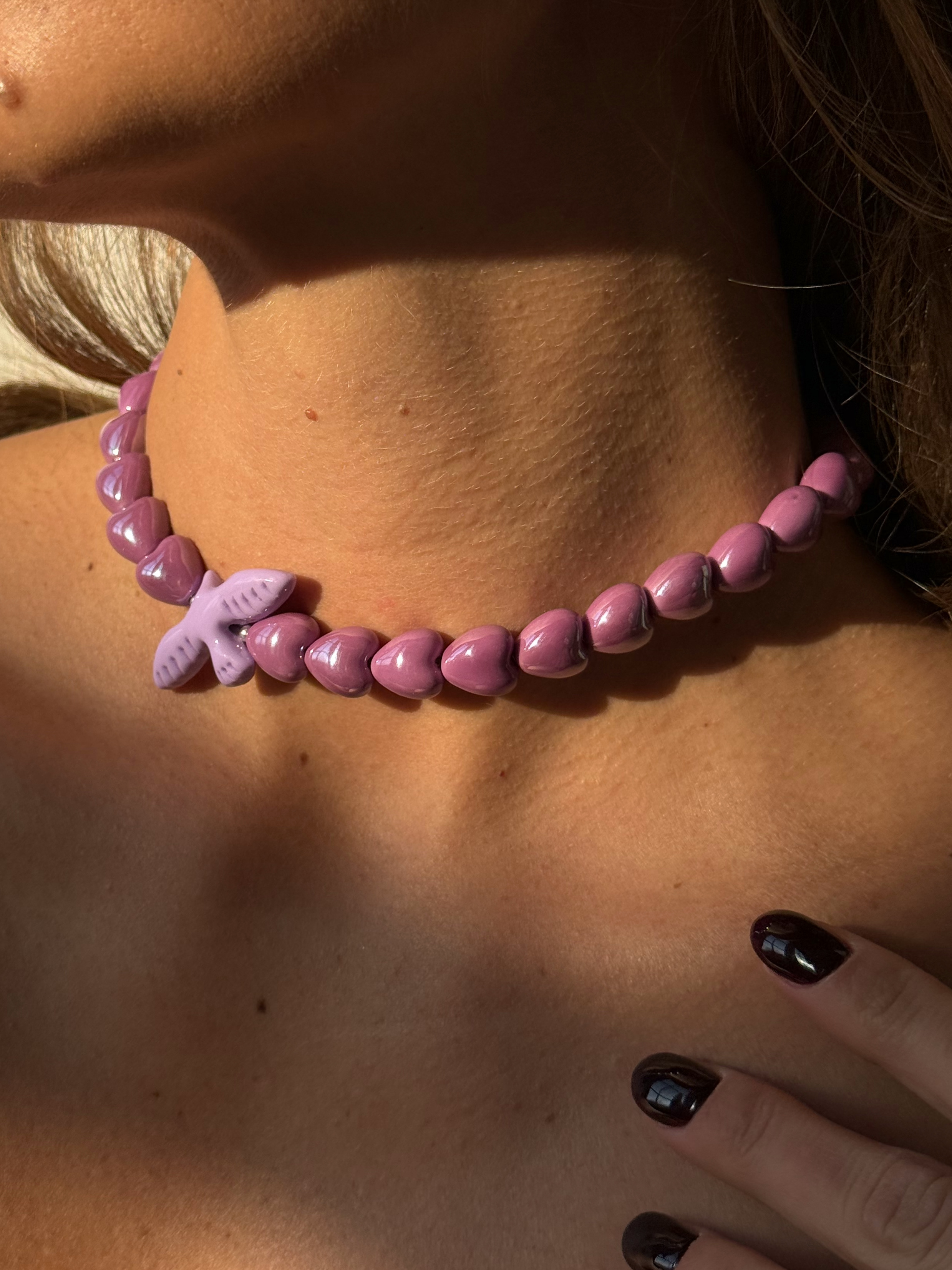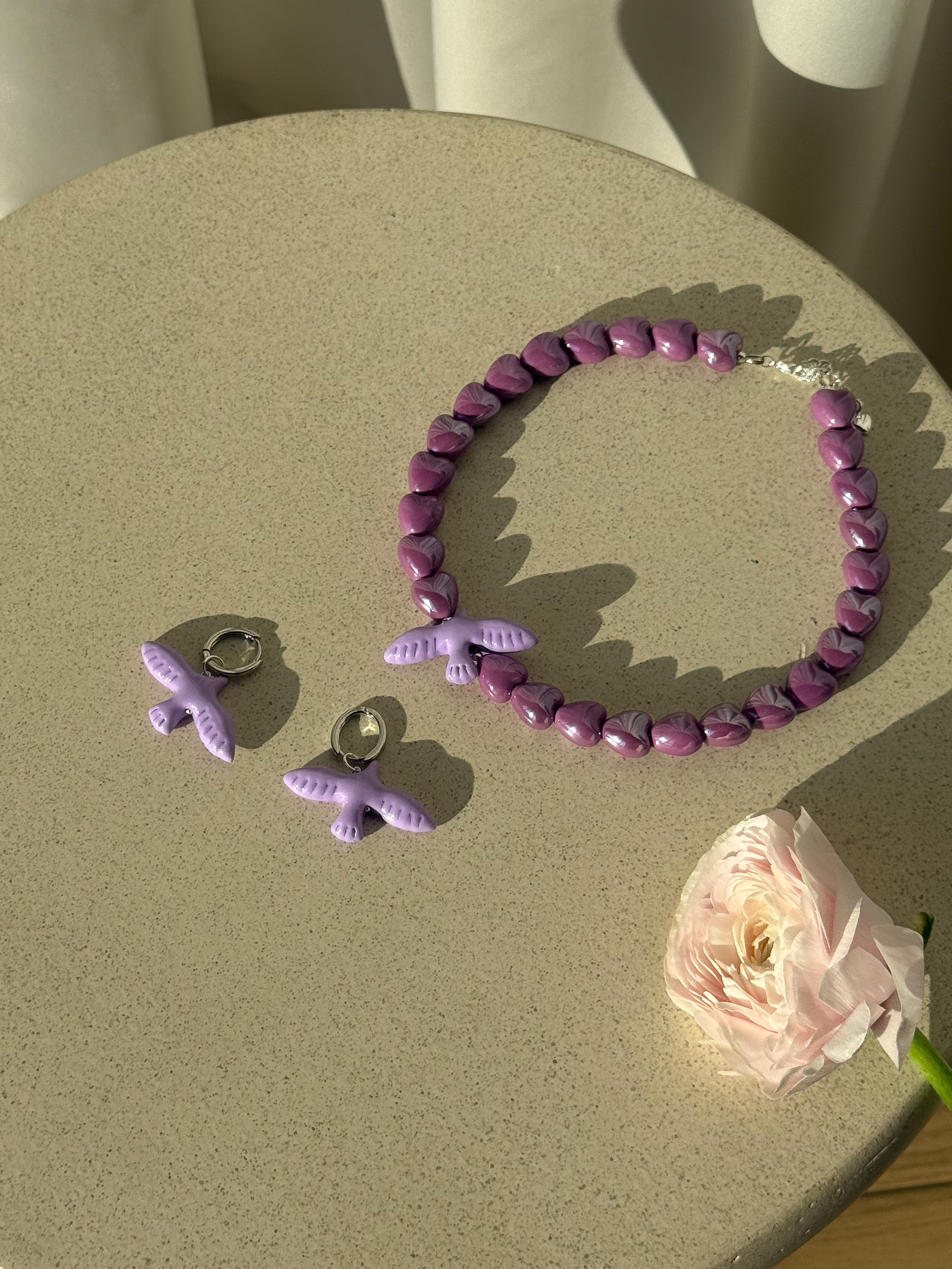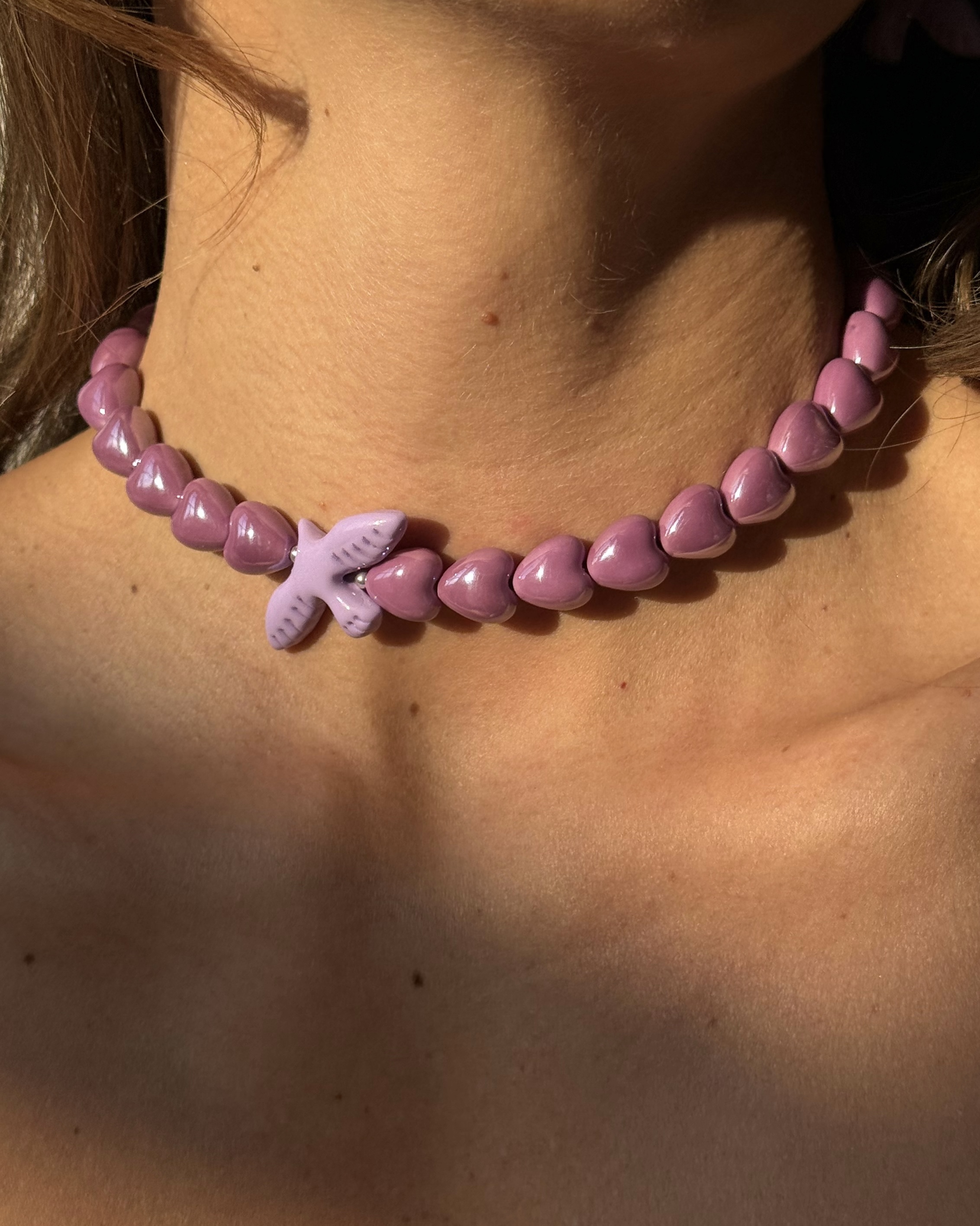 Кольє «Бузкова Горлиця» — ніжна прикраса з керамічними сердечками та полімерної глини з авторським дизайном. Срібне покриття на медсплаві додає благородного блиску, а маленька пташка 4 см додає образу грайливості. Застібка-карабін із подовжувачем 5 см забезпечує зручну посадку.