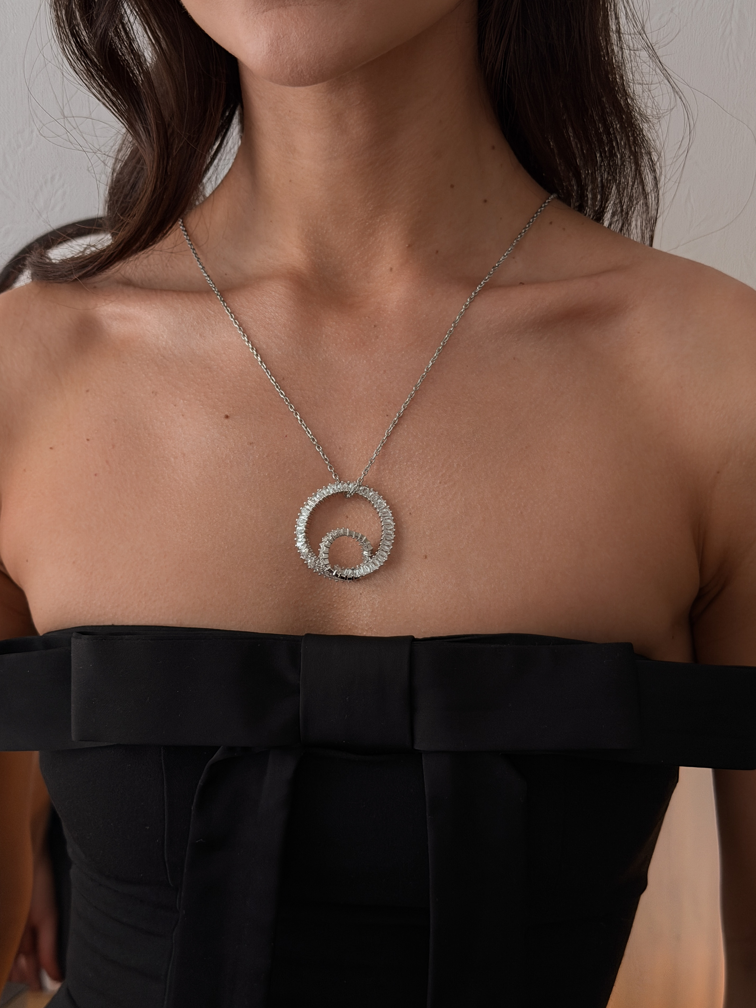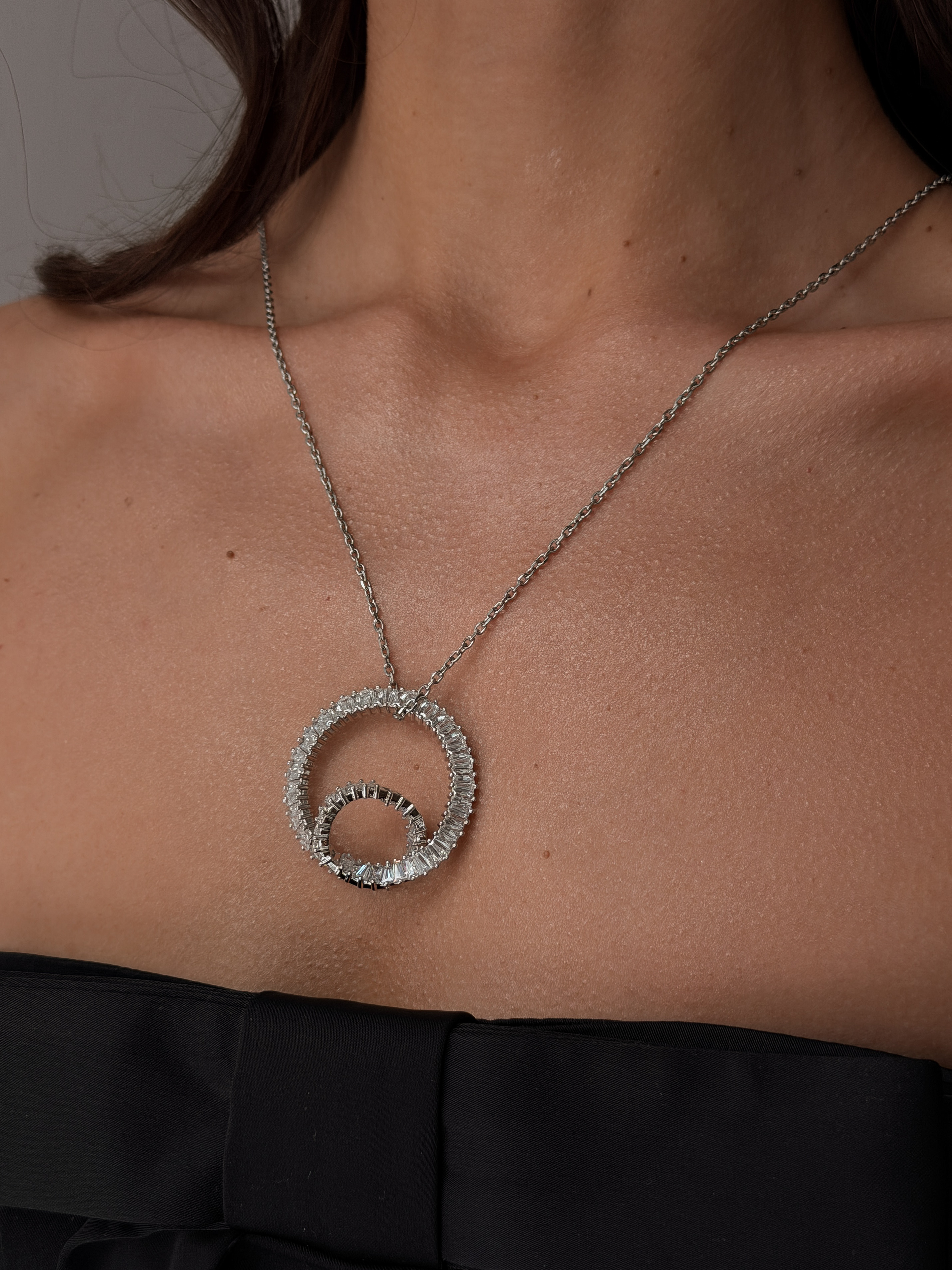 Кольє Crystal — витончена прикраса з кулоном, інкрустованим прозорими цирконами, що створюють чисте кристальне сяйво. Срібне покриття на медсплаві підкреслює холодну естетику та сучасний стиль. Кольє доповнене застібкою-карабіном і подовжувачем 5 см для комфортної посадки та регулювання довжини.