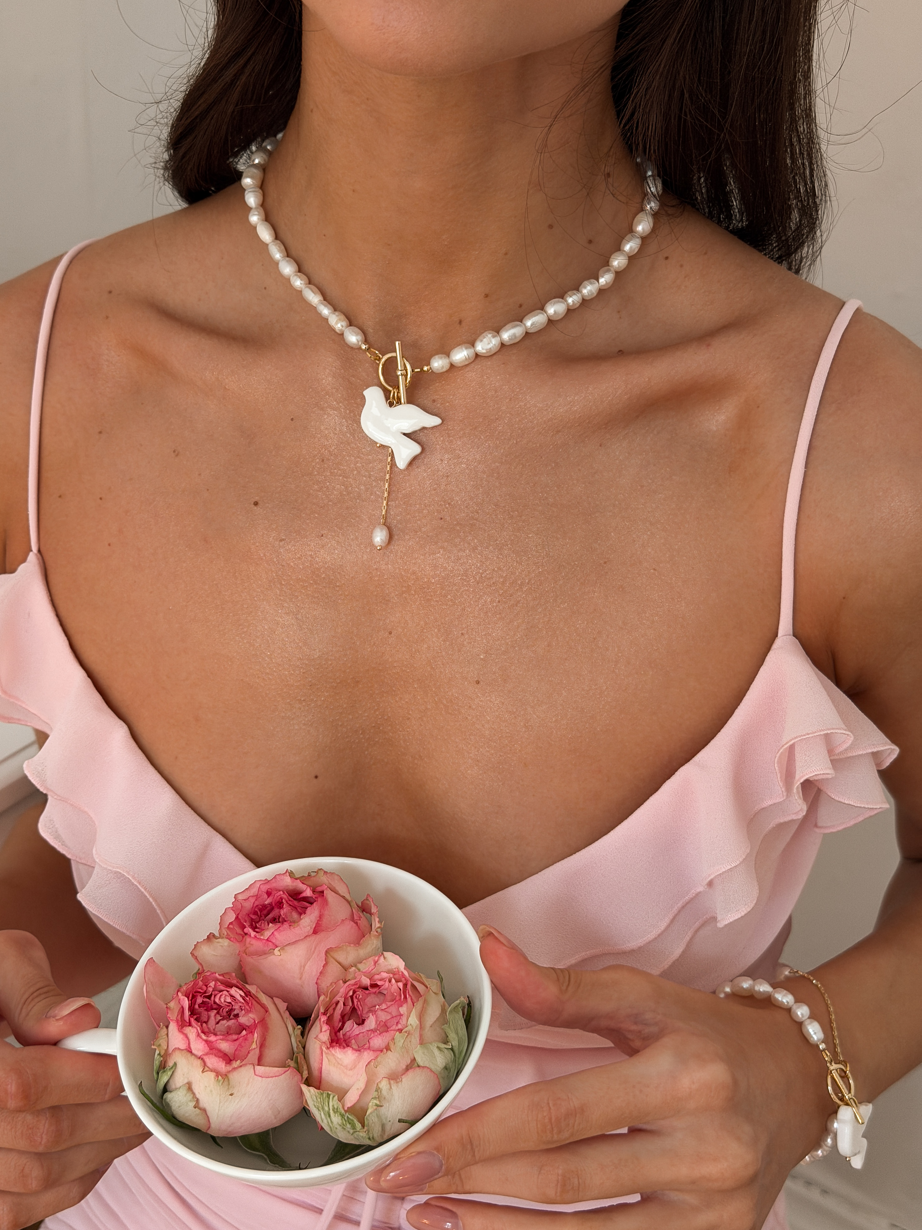 Сучасне кольє Gold Eco — стильне поєднання еко перлів та дизайнерських елементів із полімерної глини. Срібне покриття додає делікатного блиску, а тогл-застібка розставляє модний акцент і робить прикрасу зручною у використанні.