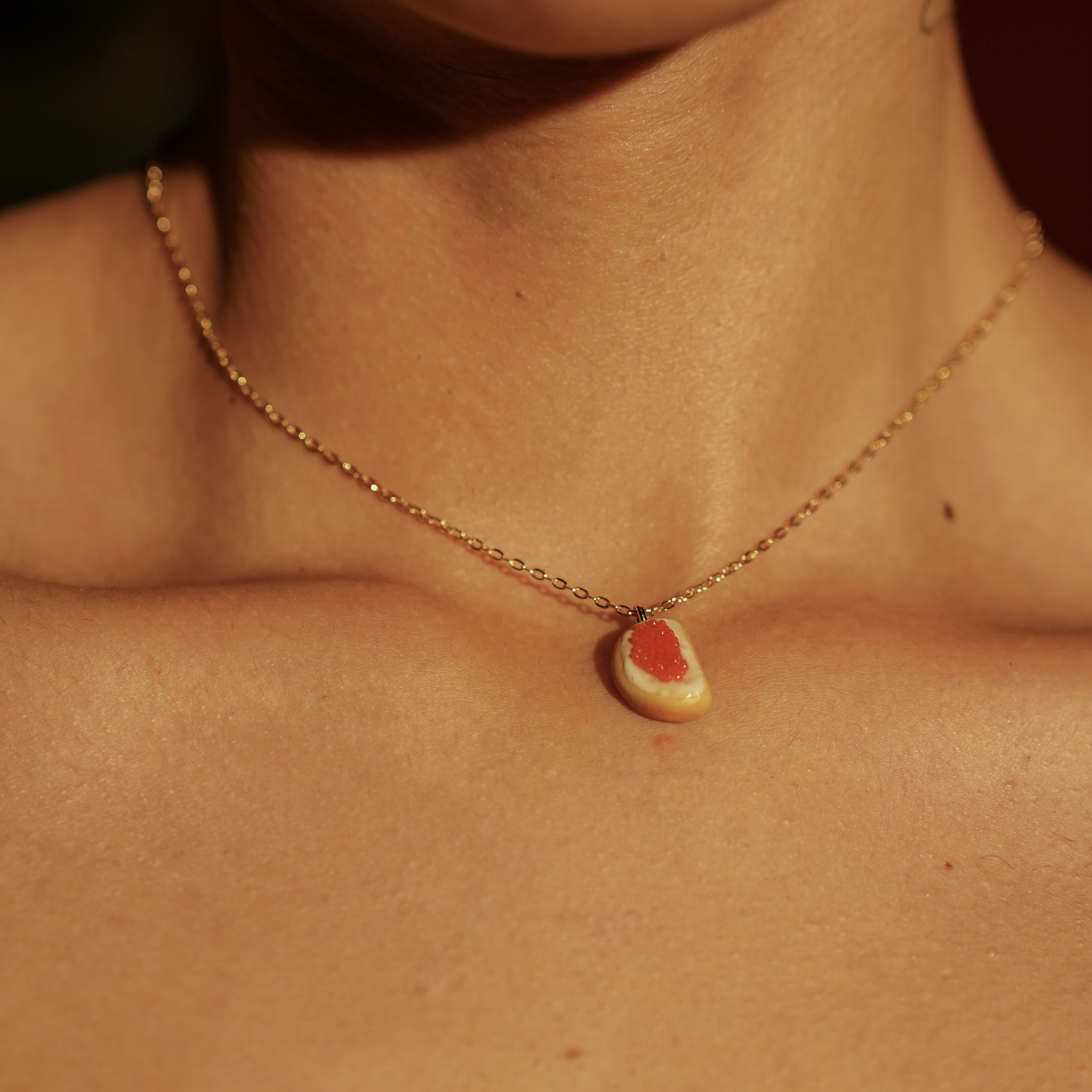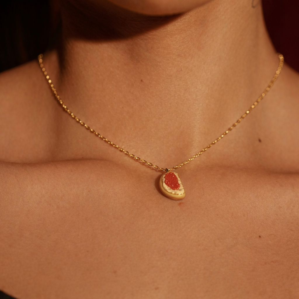 Оригінальне кольє «Ікра» — це стильна прикраса з іронічним характером і яскравим акцентом. Мініатюрна підвіска, виконана з полімерної глини у вигляді делікатесу, додає образу сміливості, сучасності та дизайнерського настрою. Кольє ідеально підходить для тих, хто цінує нестандартні деталі та любить виділятися.