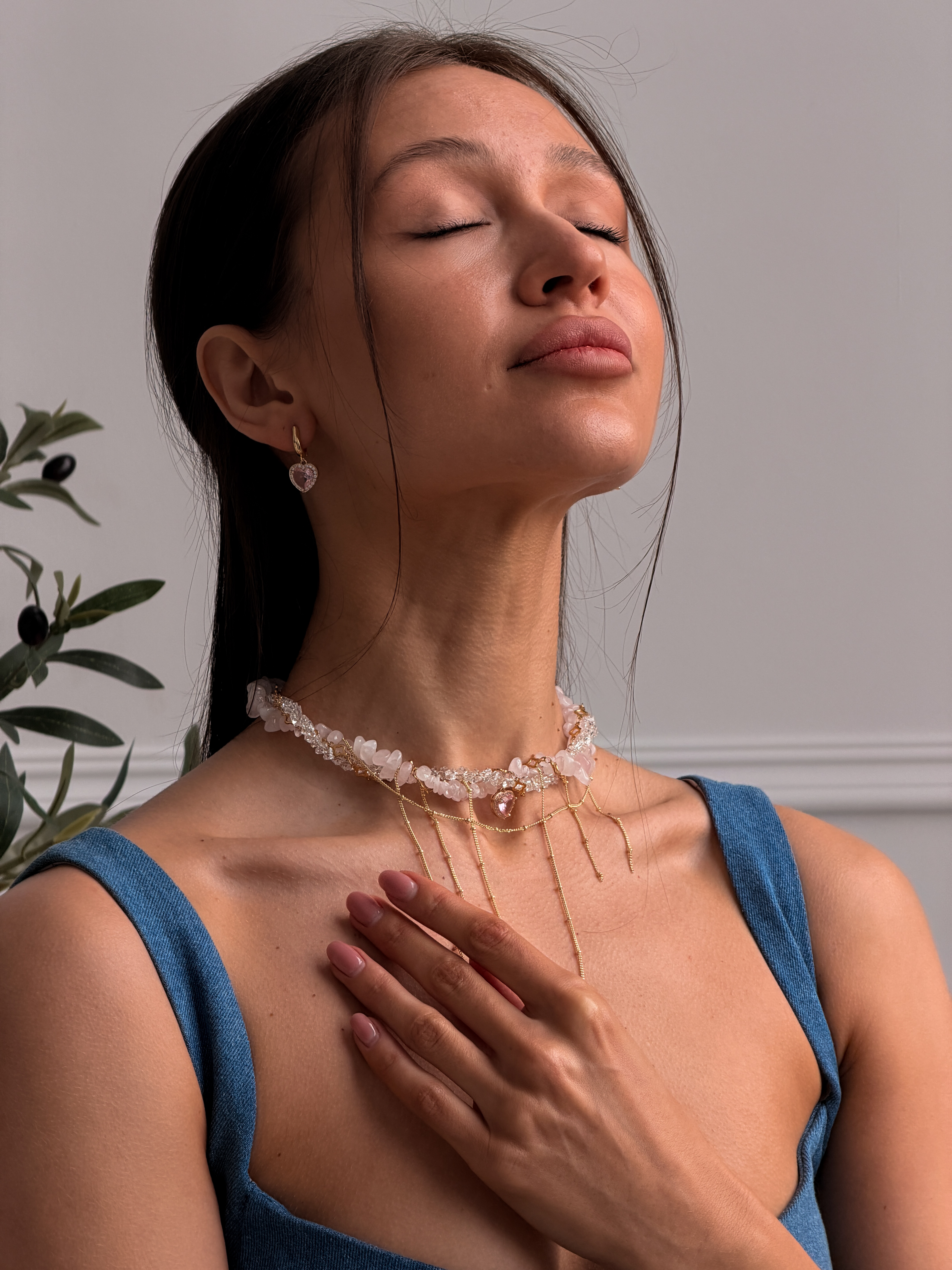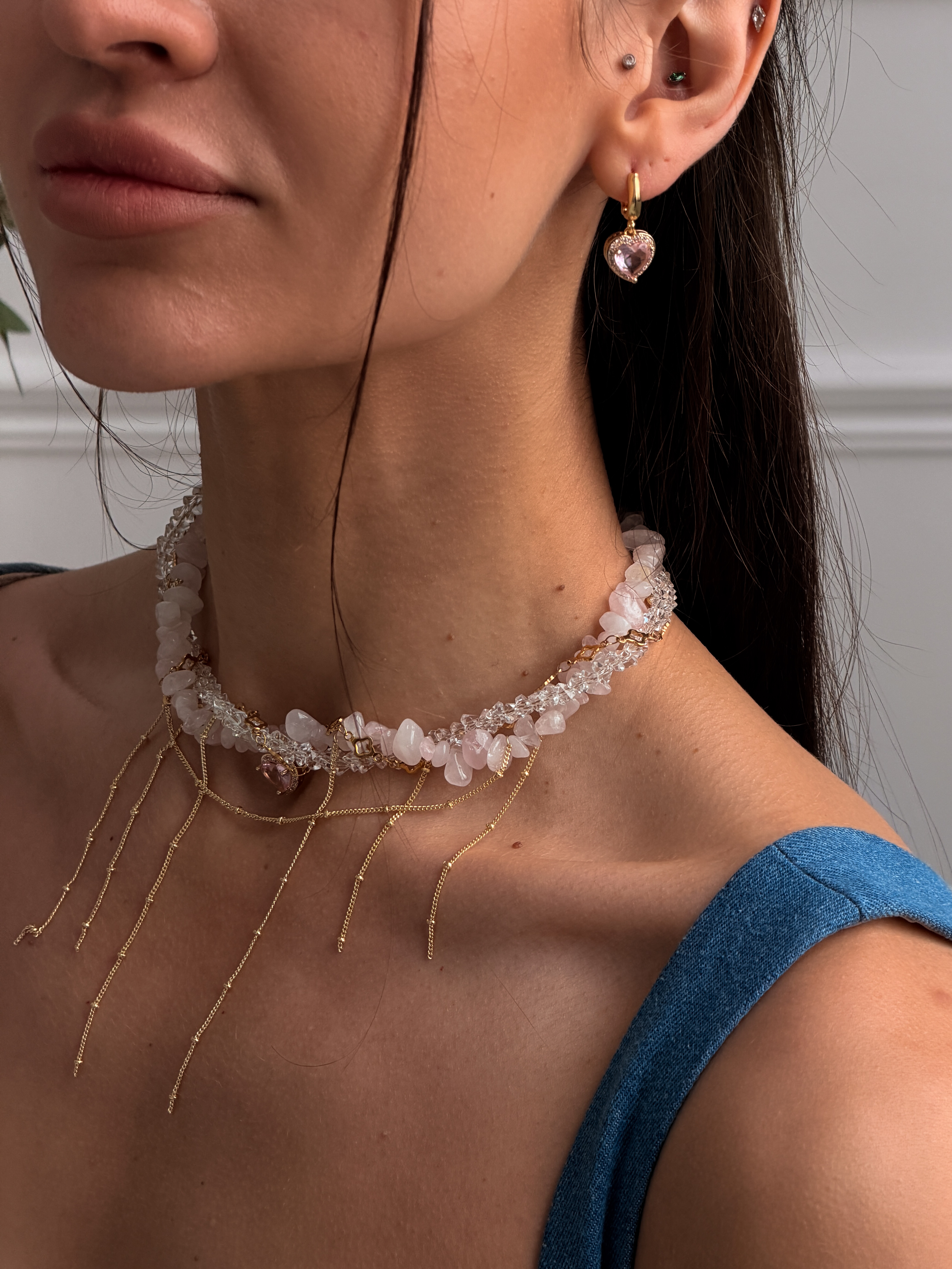 Кольє Pinky Heart — ніжна прикраса з крихти кварцу та ювелірного скла, доповнена сяючою вставкою з фіаніту. Медсплав із позолоченим покриттям дарує елегантний блиск і стійкість до зношування. Застібка-карабін із подовжувачем 5 см забезпечує зручну посадку. Доступні довжини: 36, 38, 40, 42, 44 см. Ідеально підкреслює жіночний та романтичний образ.