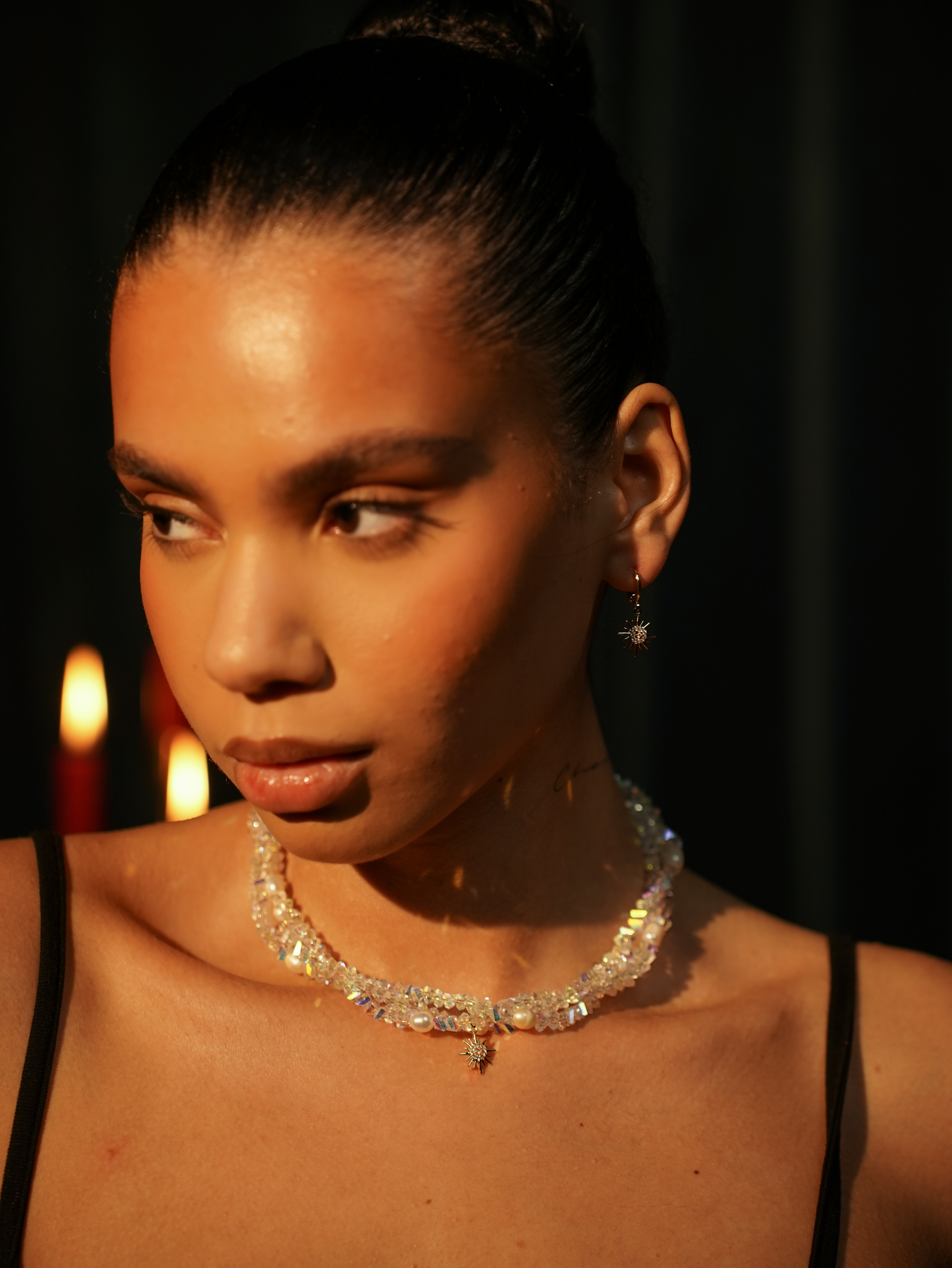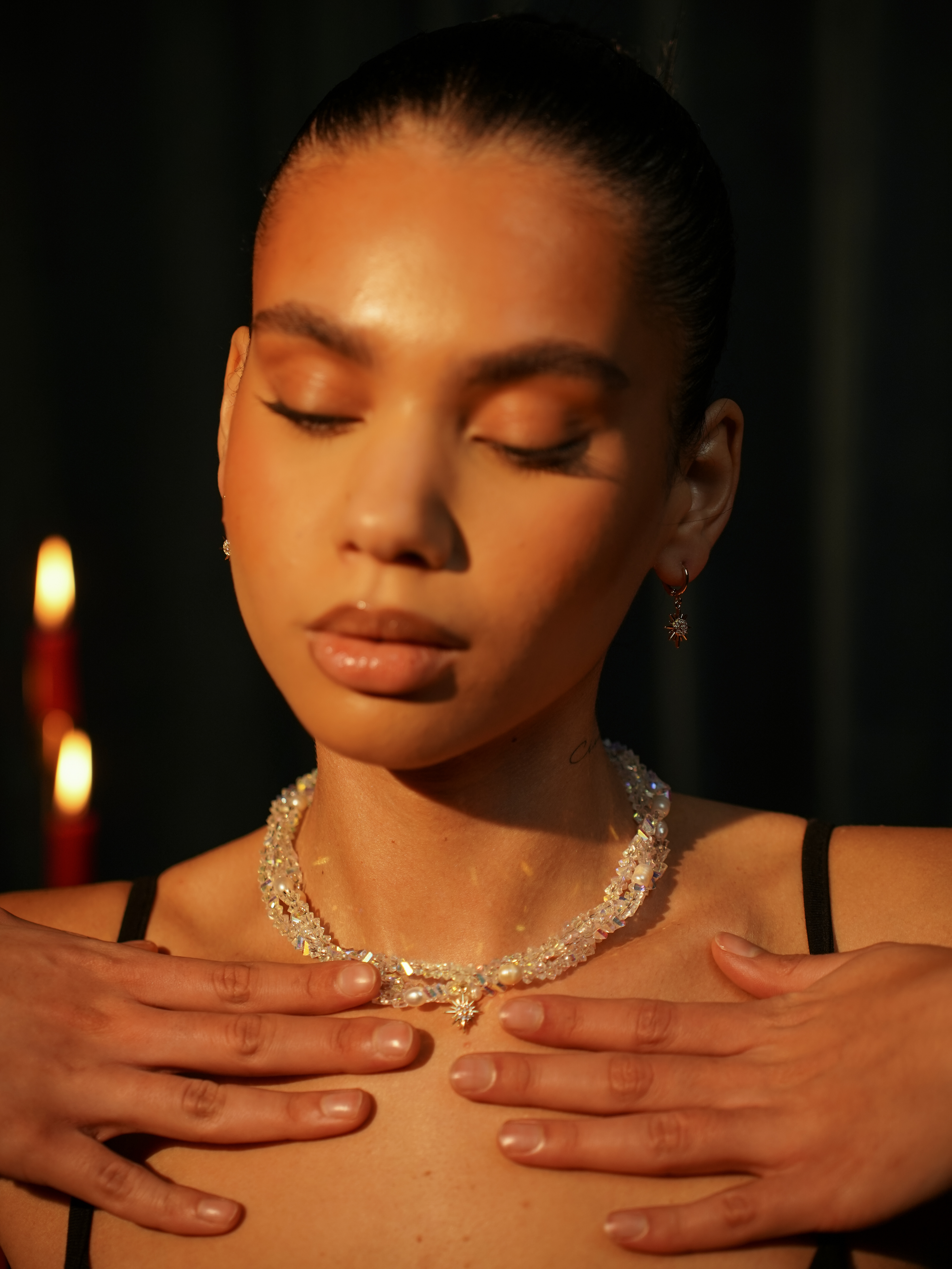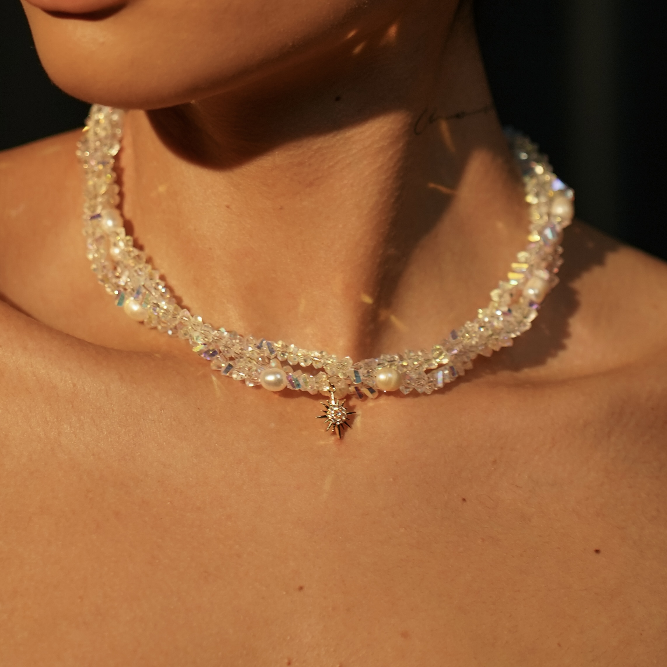 Витончене кольє «Сяюче Тріо» — це поєднання сяйва, ніжності та елегантної розкоші. Композиція з прозорого ювелірного скла з райдужними відблисками доповнена перлами та фіанітами, що створюють багатогранний світловий ефект і підкреслюють жіночність образу.