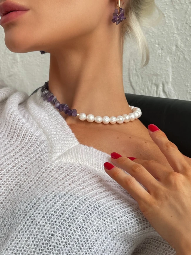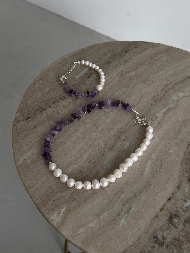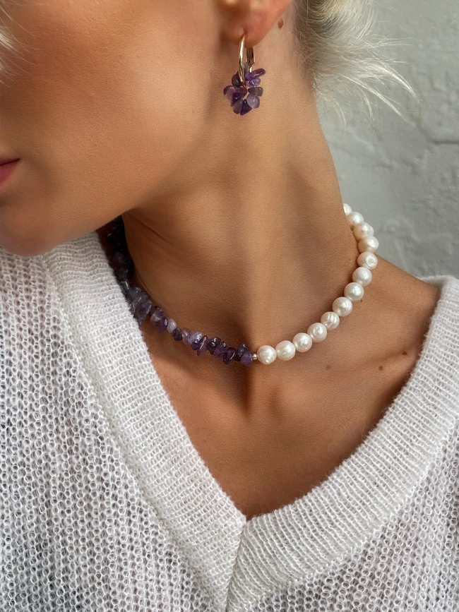 У цьому кольє ви знайдете крихту натурального фіолетового аметисту, що додає йому чарівності та магії. Комбінація аметисту і ніжних перлів створює неперевершений образ, який підкреслить вашу жіночність.