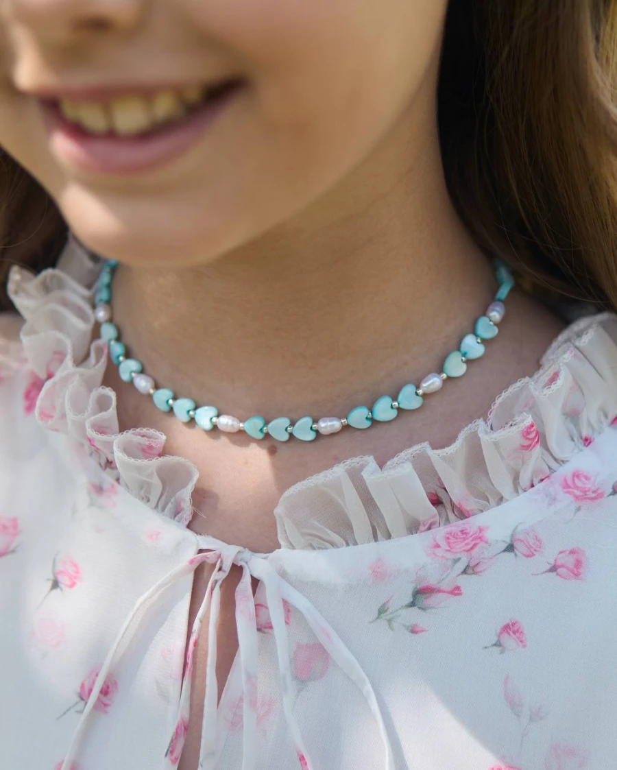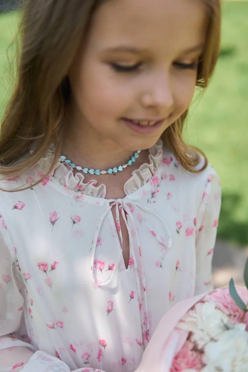 Кольє виготовлене з перламутру, перлів, срібла та японського бісеру, воно станє чудовим доповненням до будь-якого образу вашої маленької леді.
