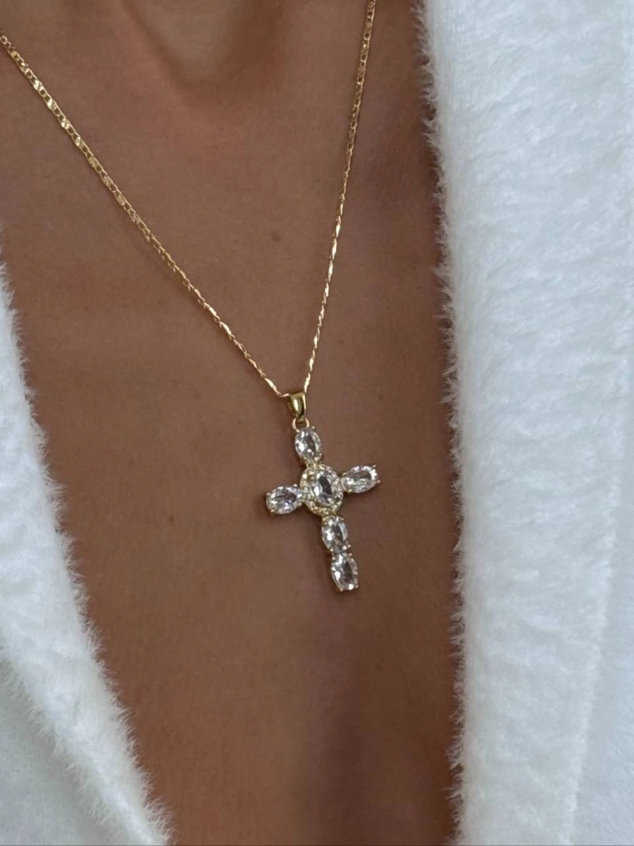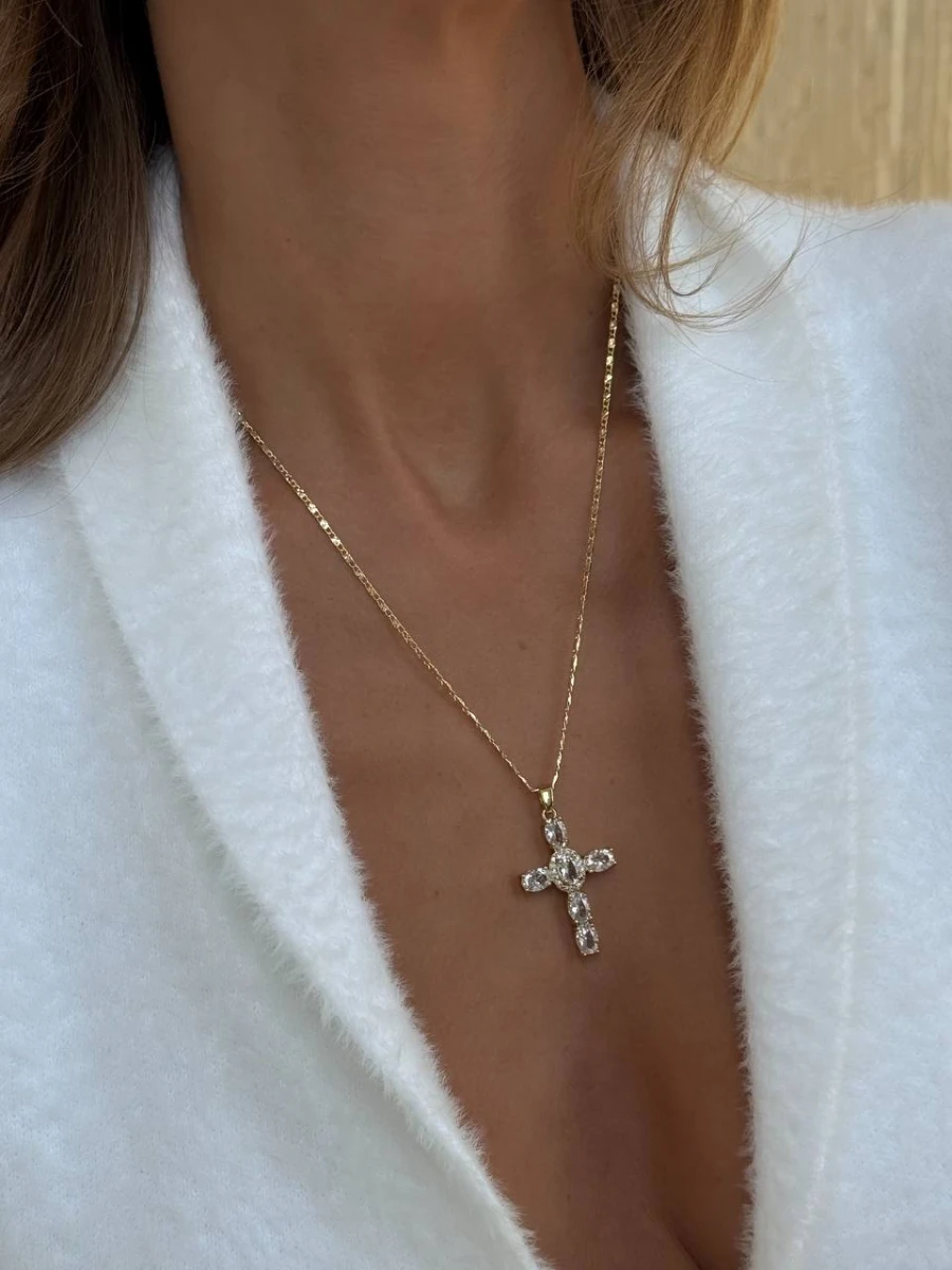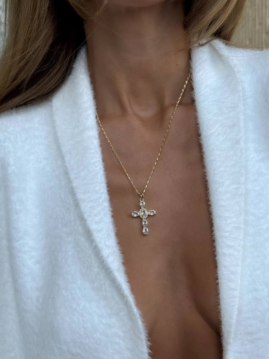 Стильне кольє з кулоном-хрестиком, прикрашеним сяючими цирконами.