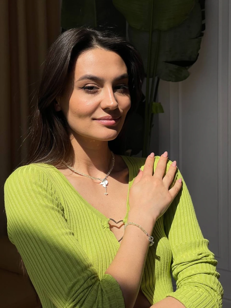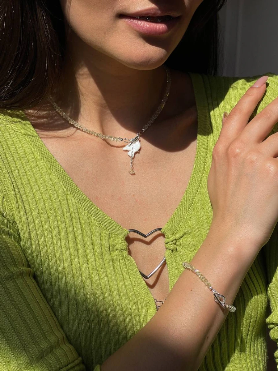 Кольє "Butter Горлиця" — ніжна прикраса з особливим характером. Виготовлене з медсплаву зі срібним покриттям, оздоблене ювелірним склом і деталями з полімерної глини. Застібка тогл додає стилю та зручності, а відсутність подовжувача зберігає його лаконічну форму. Ідеальний акцент для витонченого образу.