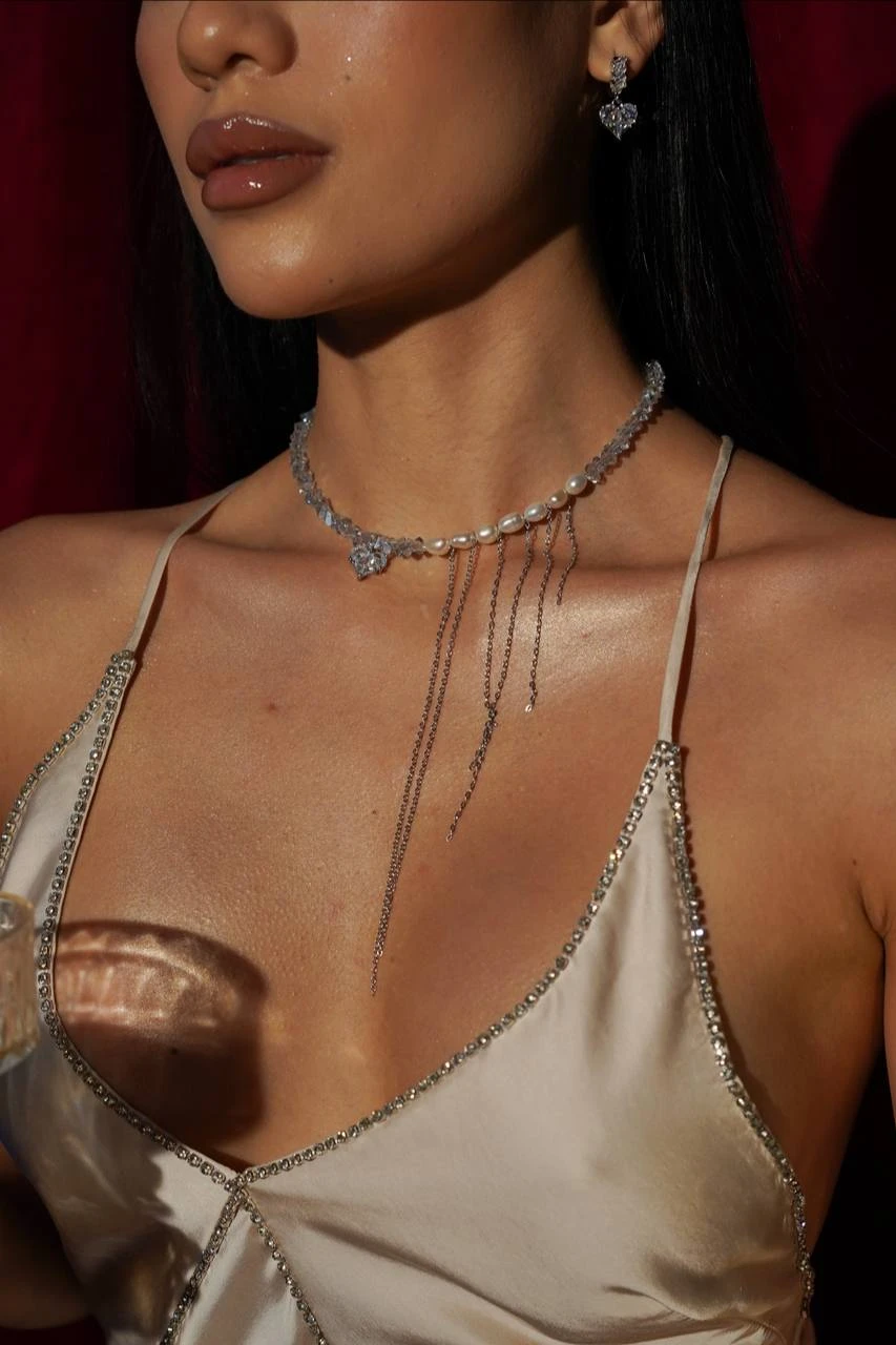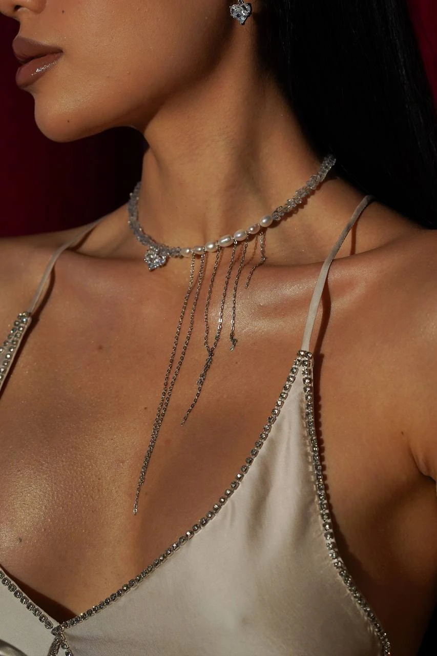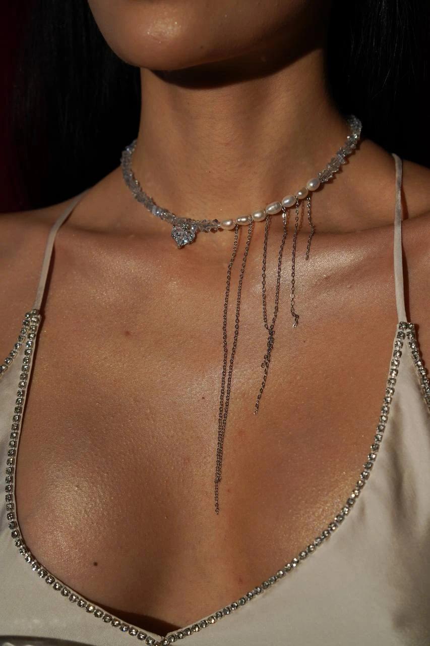 Кольє "Celebrity" — елегантний аксесуар, який підкреслить вашу розкіш. Створене з перлин, медсплаву з срібним покриттям, скляних ювелірних каменів та фіаніту, воно дарує неповторний блиск і витонченість. Ідеальний вибір для особливих моментів або як розкішний акцент у повсякденному стилі.