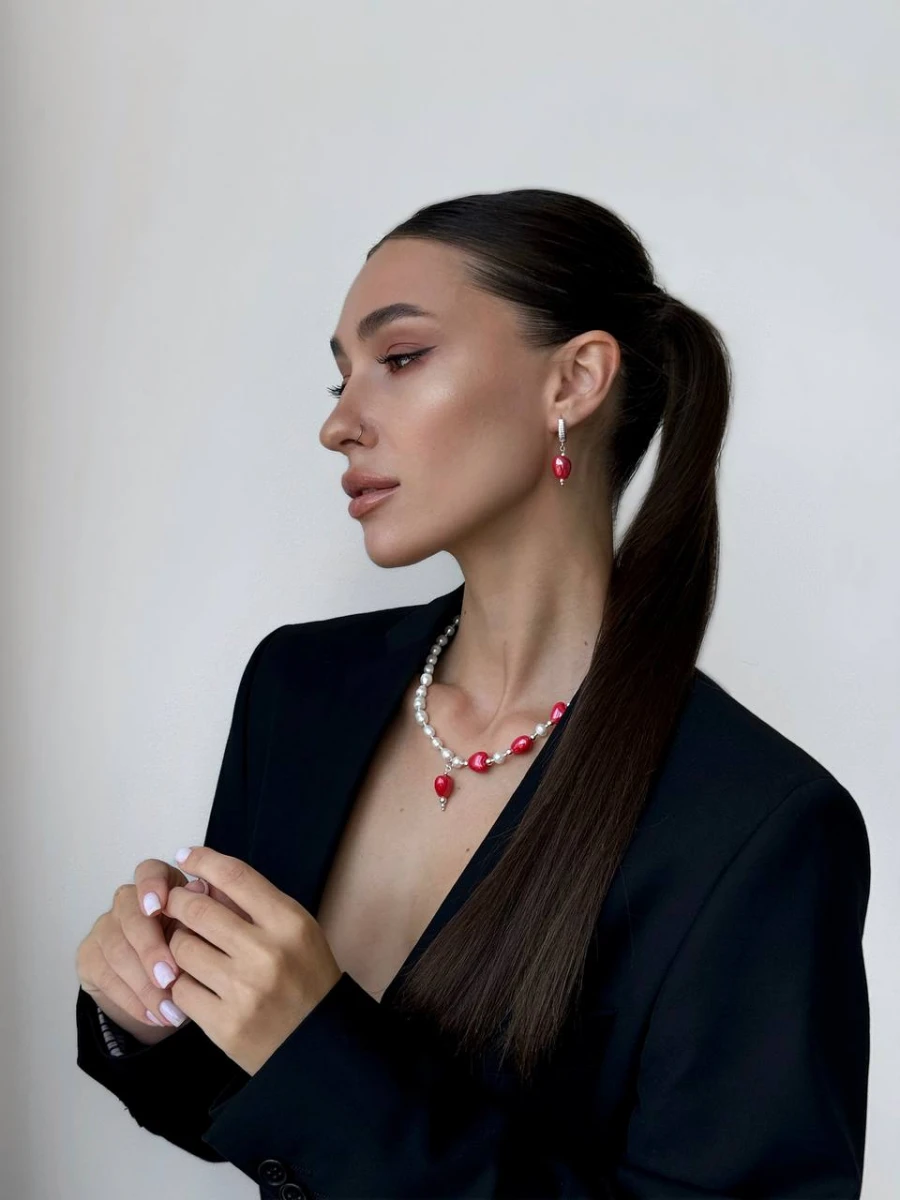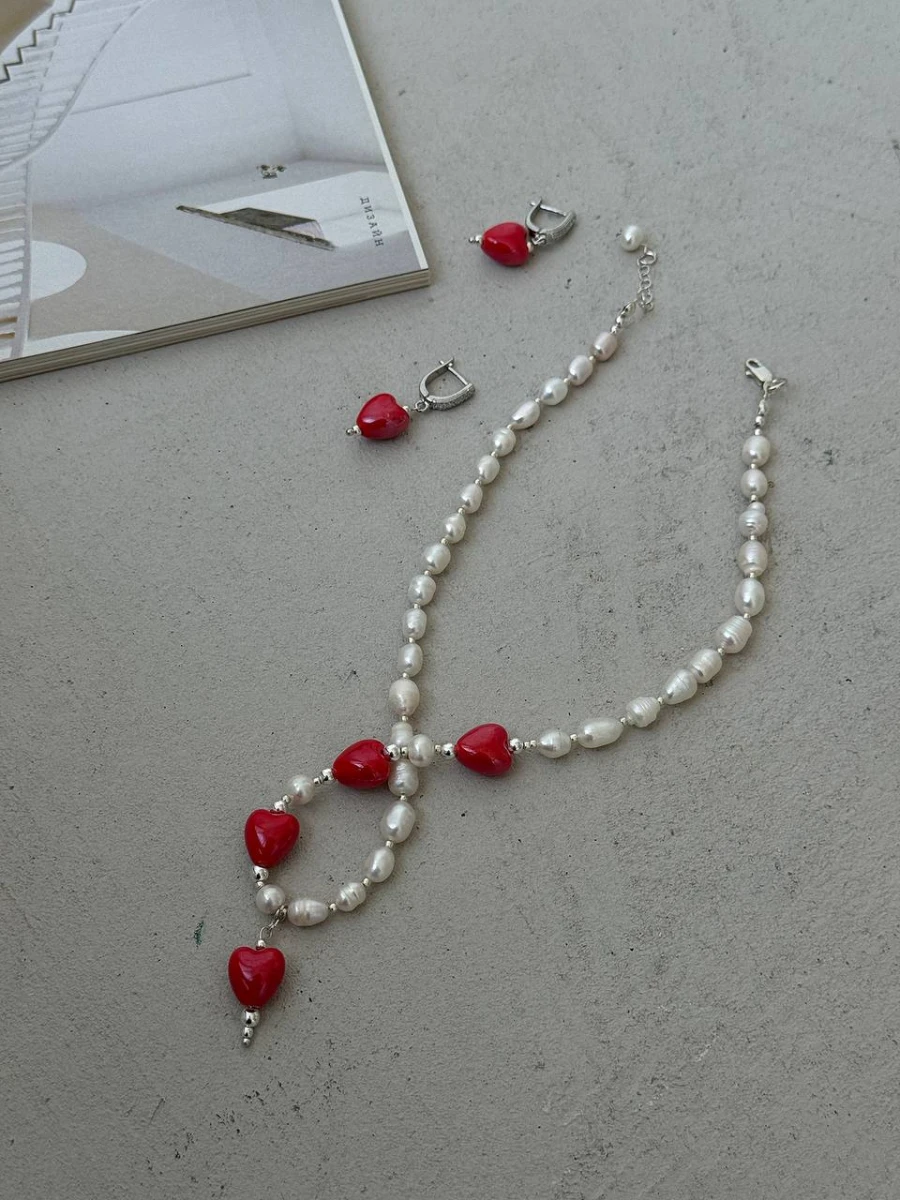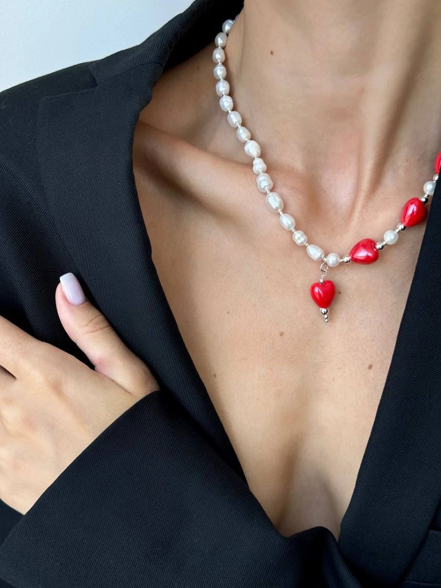 Кольє "Червона Доля" - Зачаруйте оточуючих вишуканим кольє, яке поєднує в собі природну красу Високоякісних перлин та витонченість ручної роботи з кераміки. Кожне серце, створене з особливою турботою, додає особливого шарму цьому унікальному аксесуару. Ідеальний вибір для особливих випадків та на щодень.