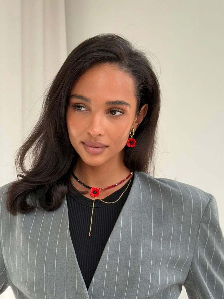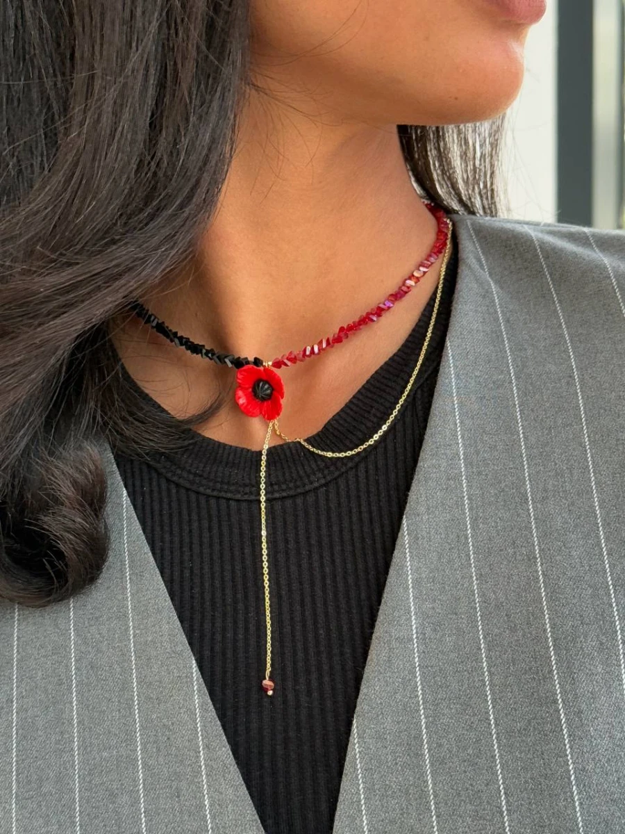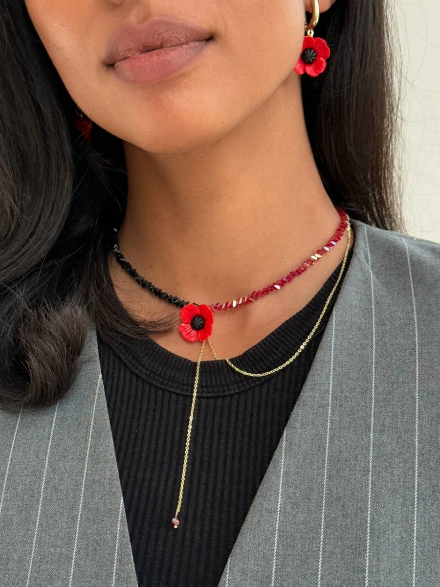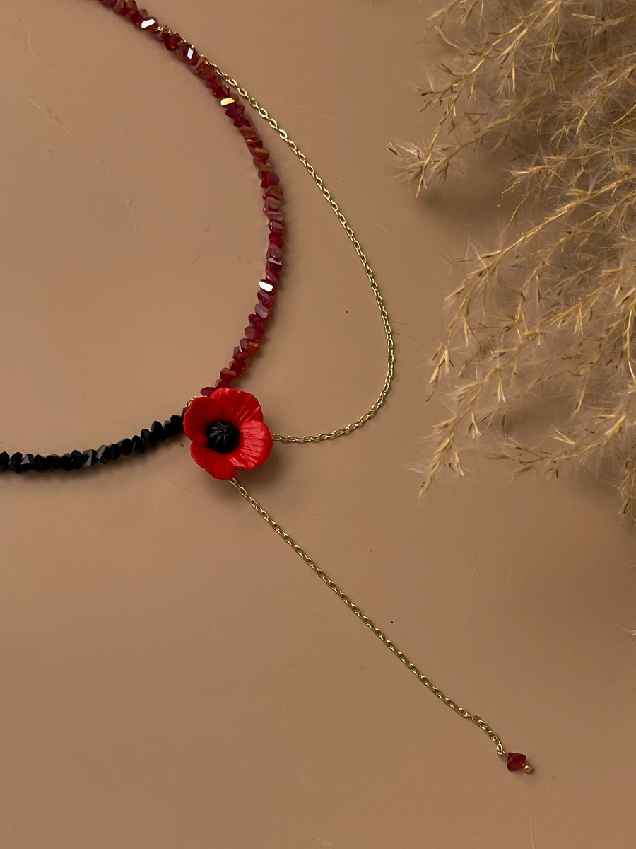 Цей виразний чокер із червоним маком, виконаним із полімерної глини, стане символом ніжності та сили водночас. Поєднання чорних і червоних відтінків ювелірного скла з золотистим ланцюжком створює яскравий акцент, що додає образу індивідуальності.