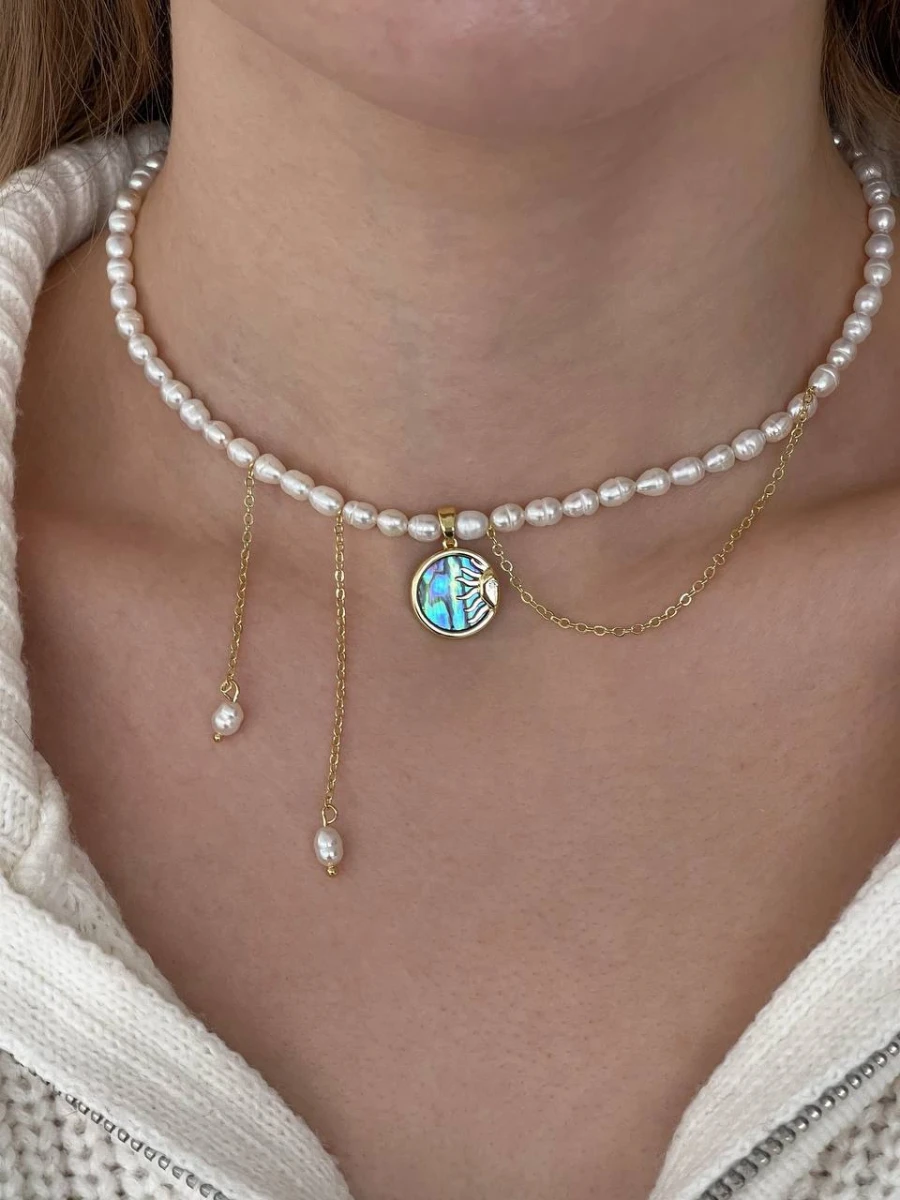 Кольє "Chrome Ra" — це витончена прикраса, яка поєднує в собі елегантність перлів, яскравість емалі та розкіш позолоти. Виготовлене з високоякісних матеріалів, включаючи високоякісні перли, медсплав та позолоту, це кольє додає образу вишуканості та стилю. Завдяки чудовому дизайну, воно стане ідеальним доповненням до будь-якого наряду, підкреслюючи вашу індивідуальність і елегантність.