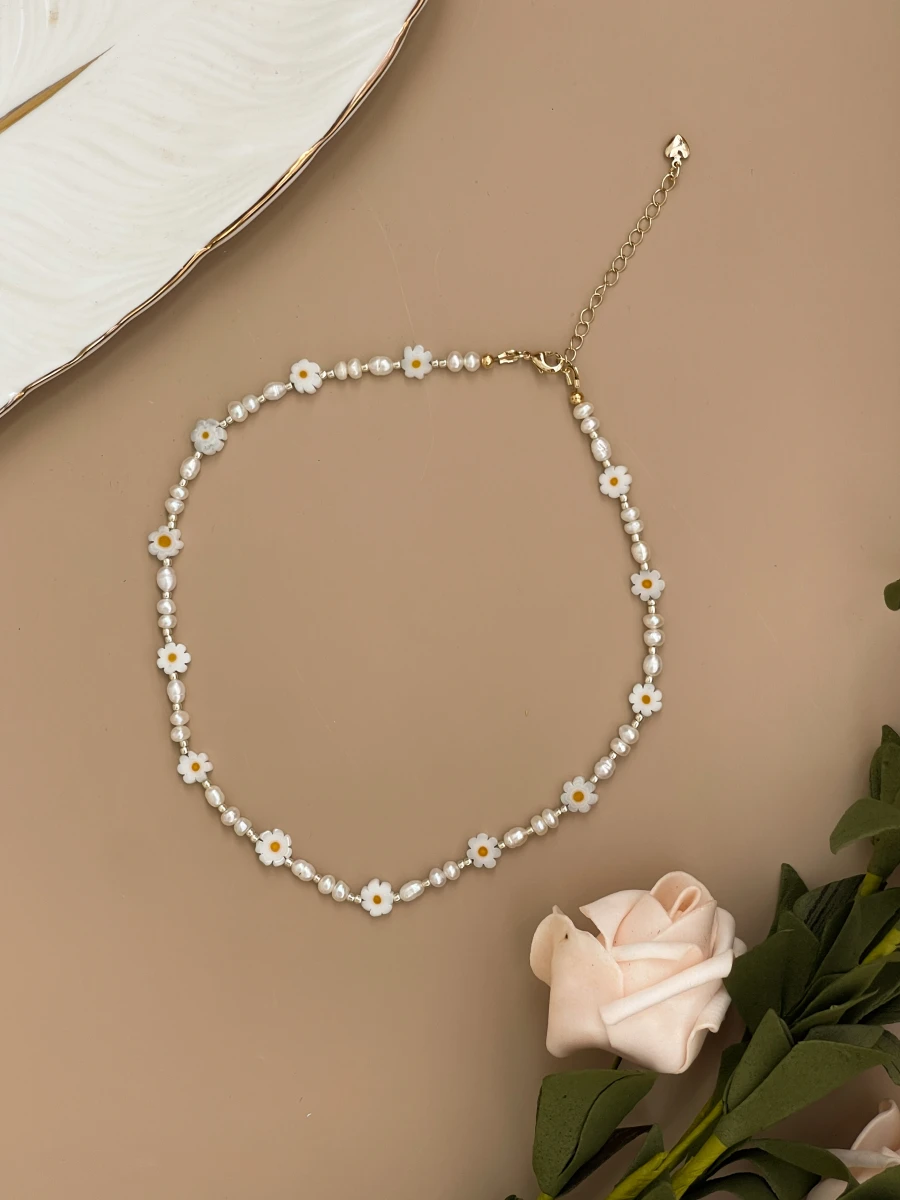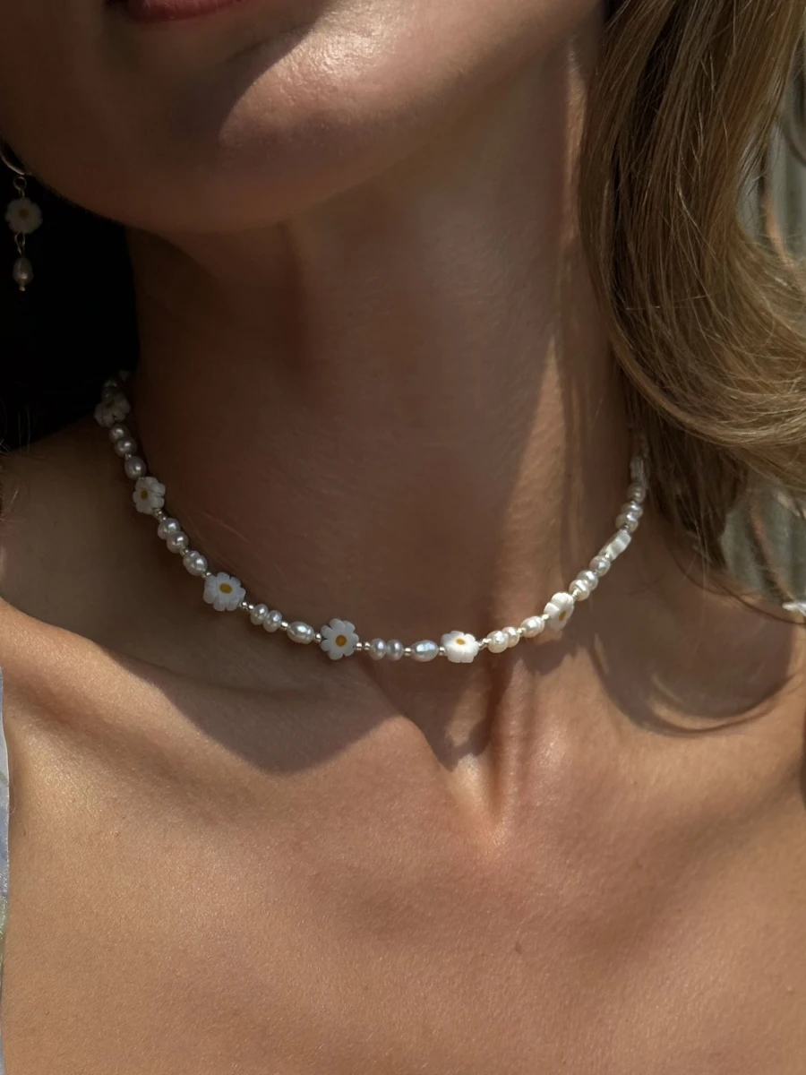 Кожна ромашка виконана з увагою до деталей, а перлини, які гармонійно поєднуються з ними, додають кольє розкоші та витонченості.