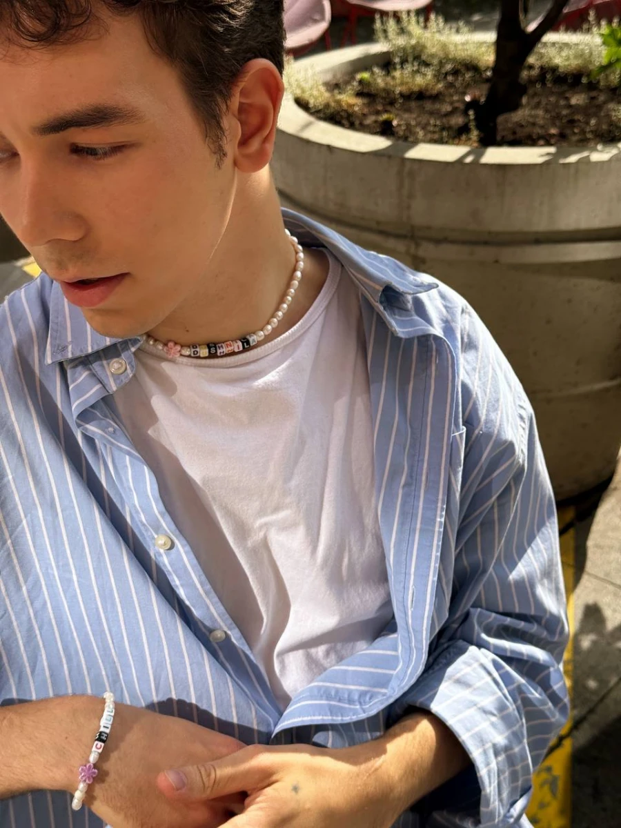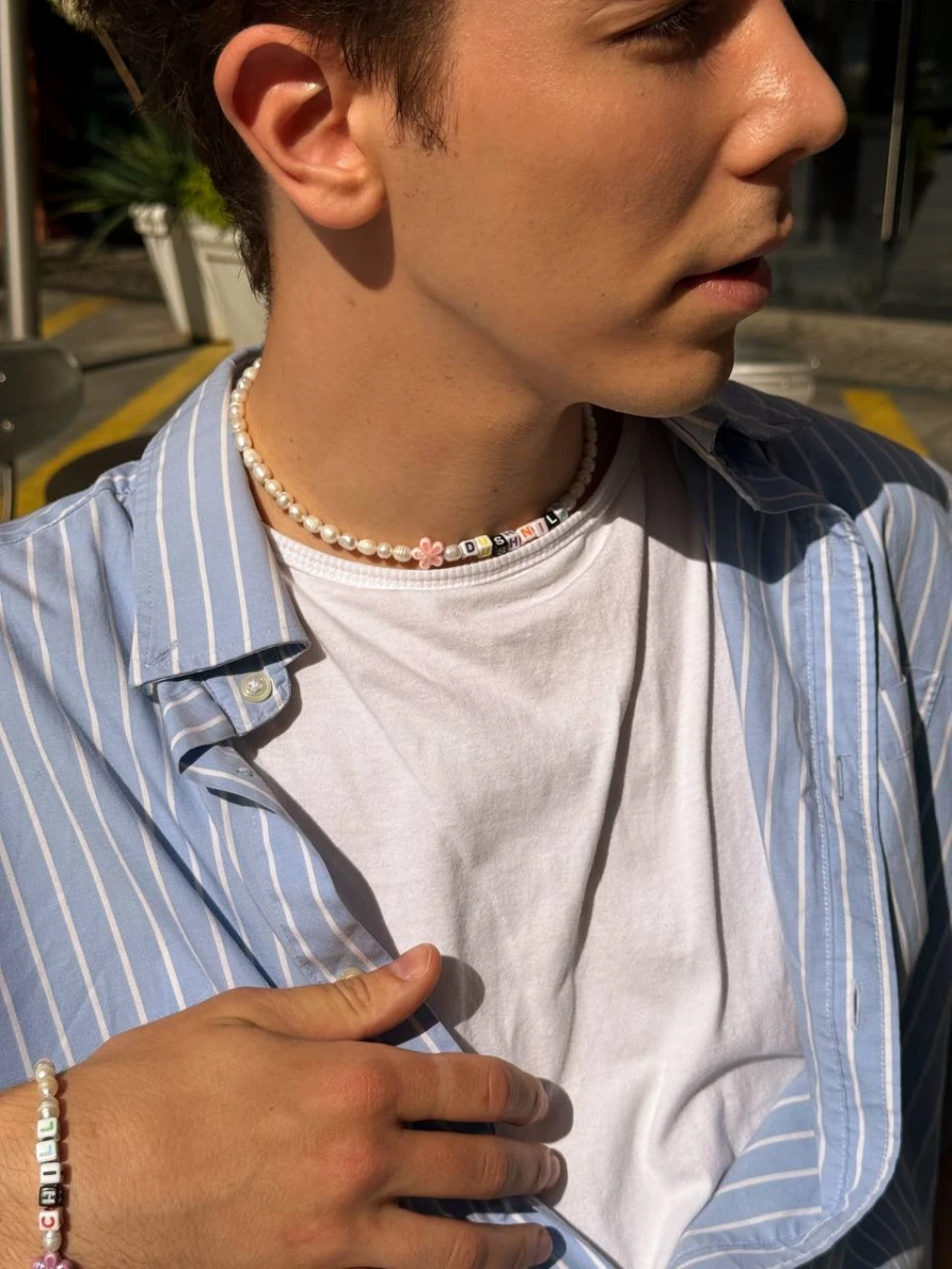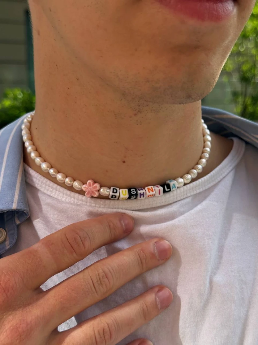 Стильна прикраса з характером із серії Upcycle. Виготовлене з еко перлів не ідеальної форми, з деталями з медсплаву в позолоченому покритті. Застібка – карабін із подовженням 5 см для зручної посадки. Влучне поєднання естетики та екосвідомості.